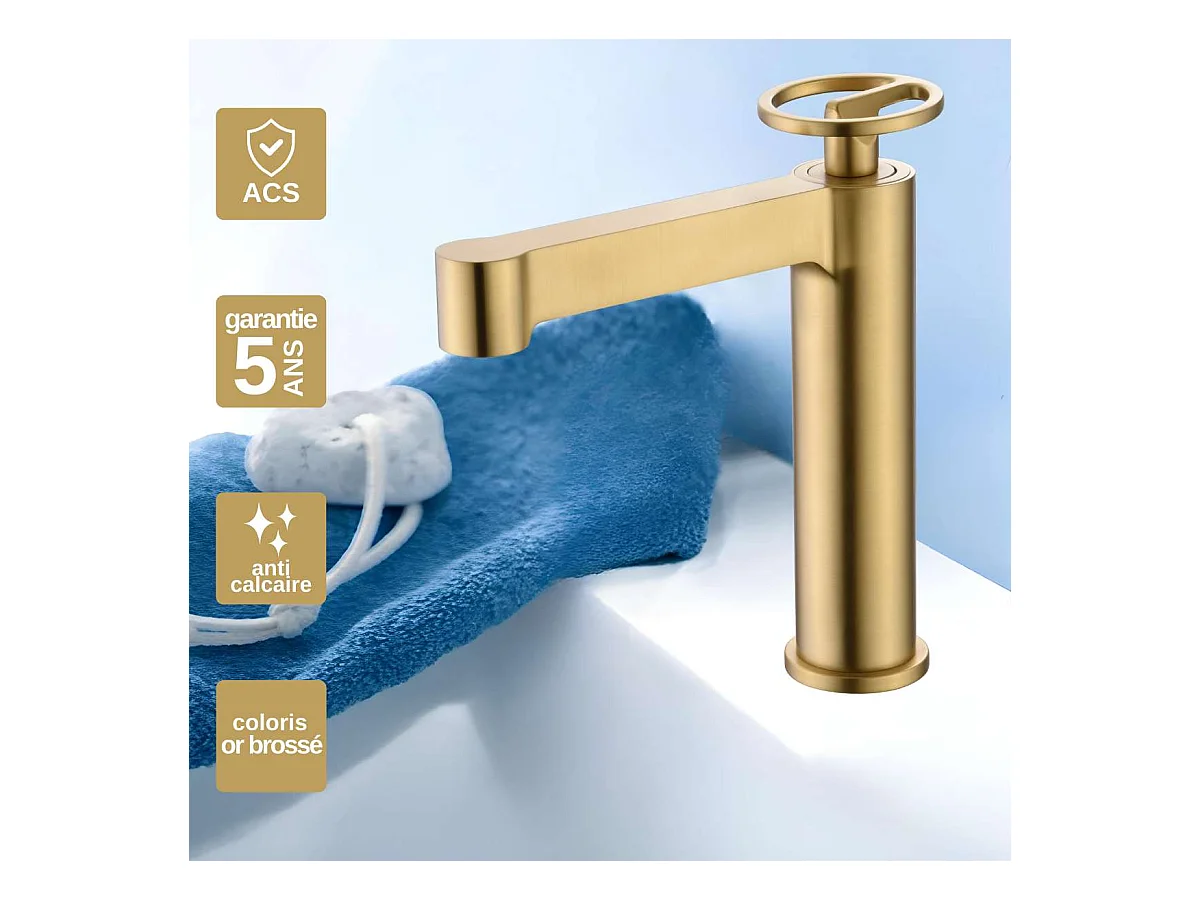 Mitigeur Lavabo Salle de Bain or brossé – Bec Haut Anti-Calcaire – Design moderne - DELOS IMEX