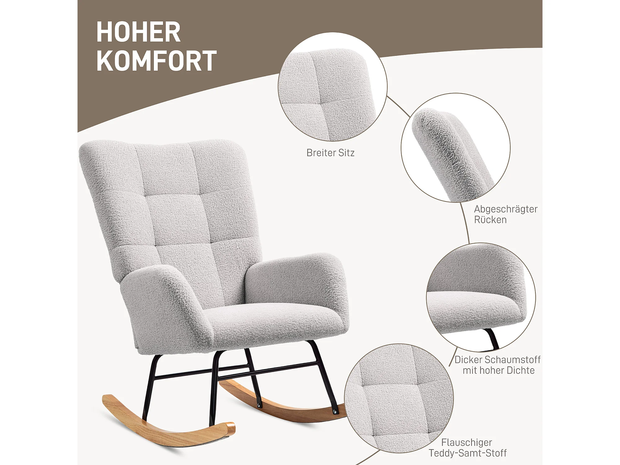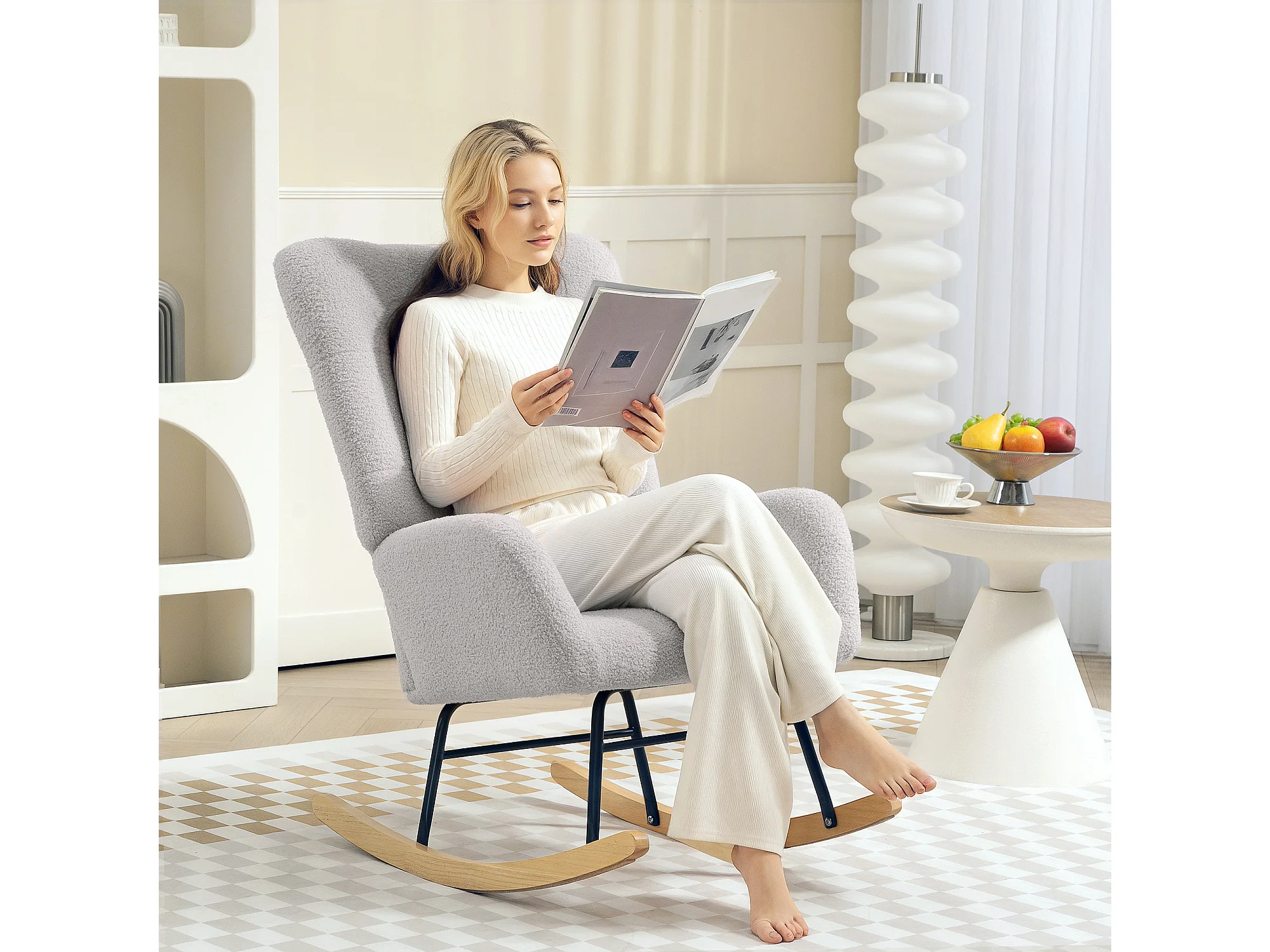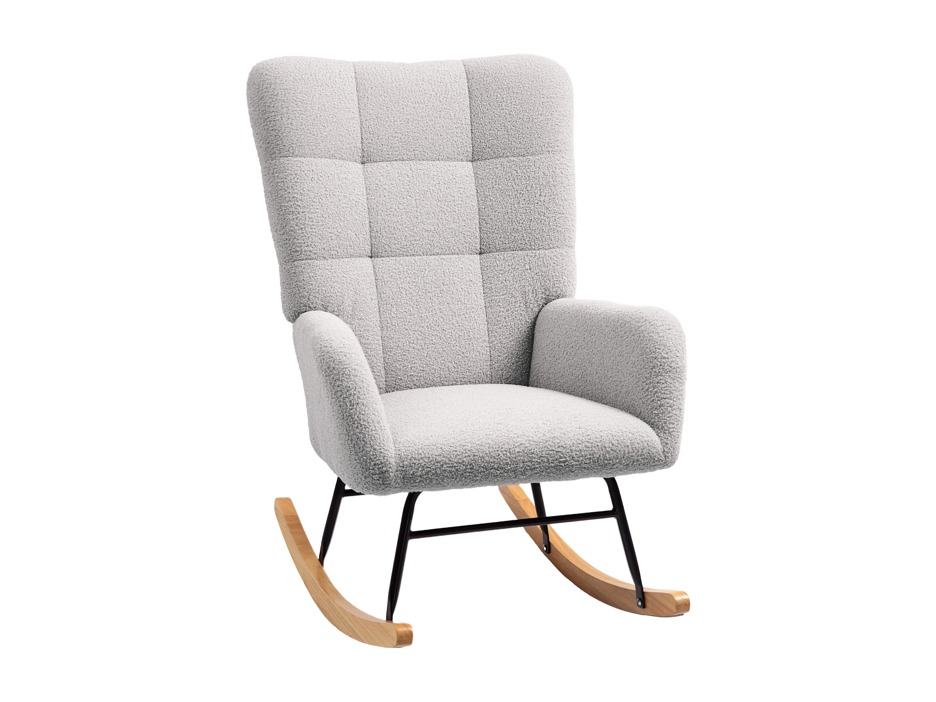 Rocking-chair avec accoudoirs, tissu peluche, bois et métal, gris clair (94x70x100 cm)