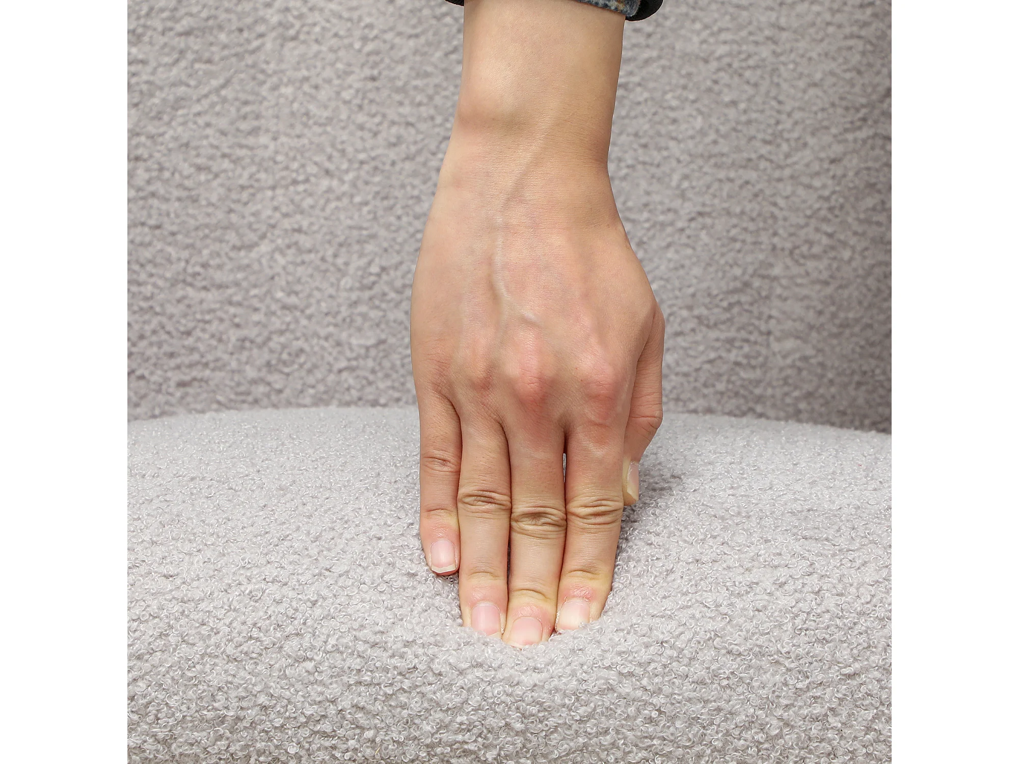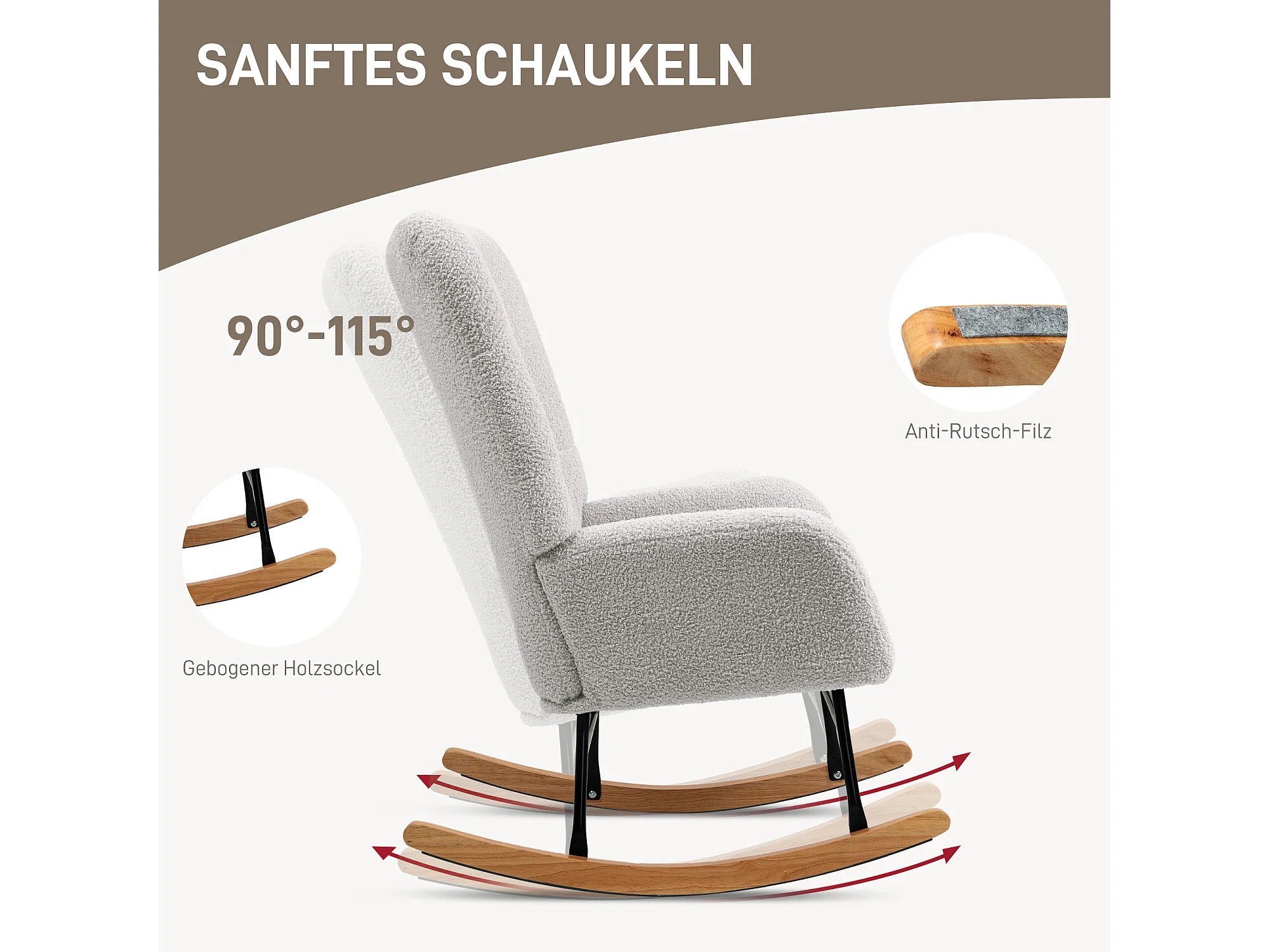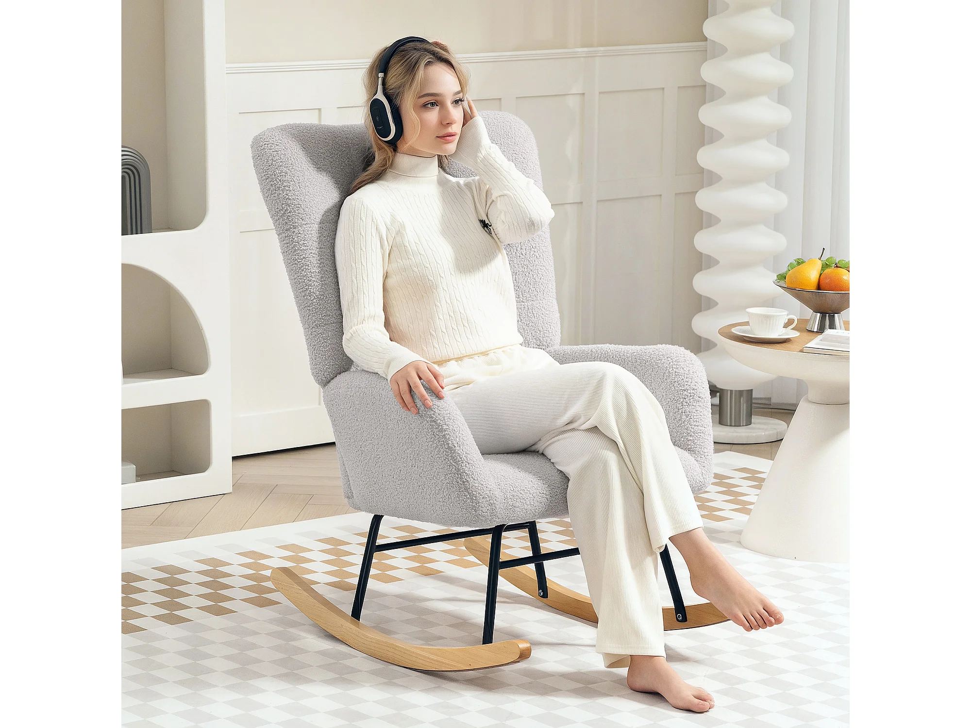 Rocking-chair avec accoudoirs, tissu peluche, bois et métal, gris clair (94x70x100 cm)