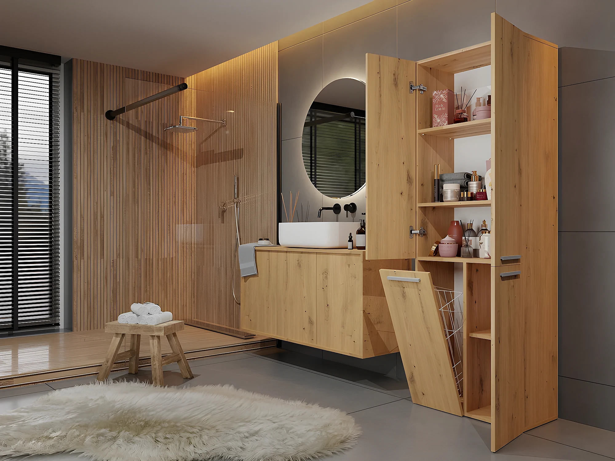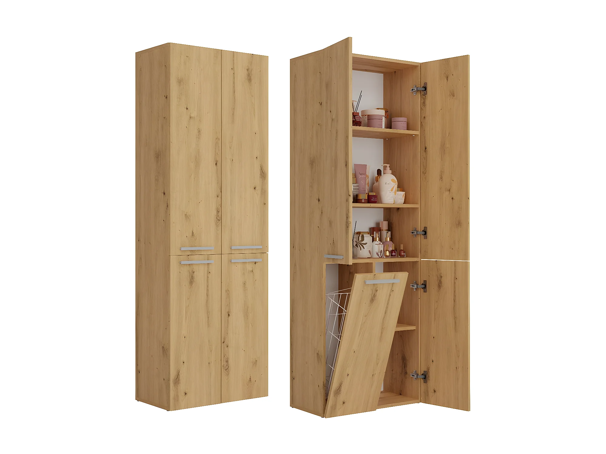RORY - Armoire de salle de bain avec panier - Dimensions 174x60x30 - Meuble de rangement salle de bain espace buanderie