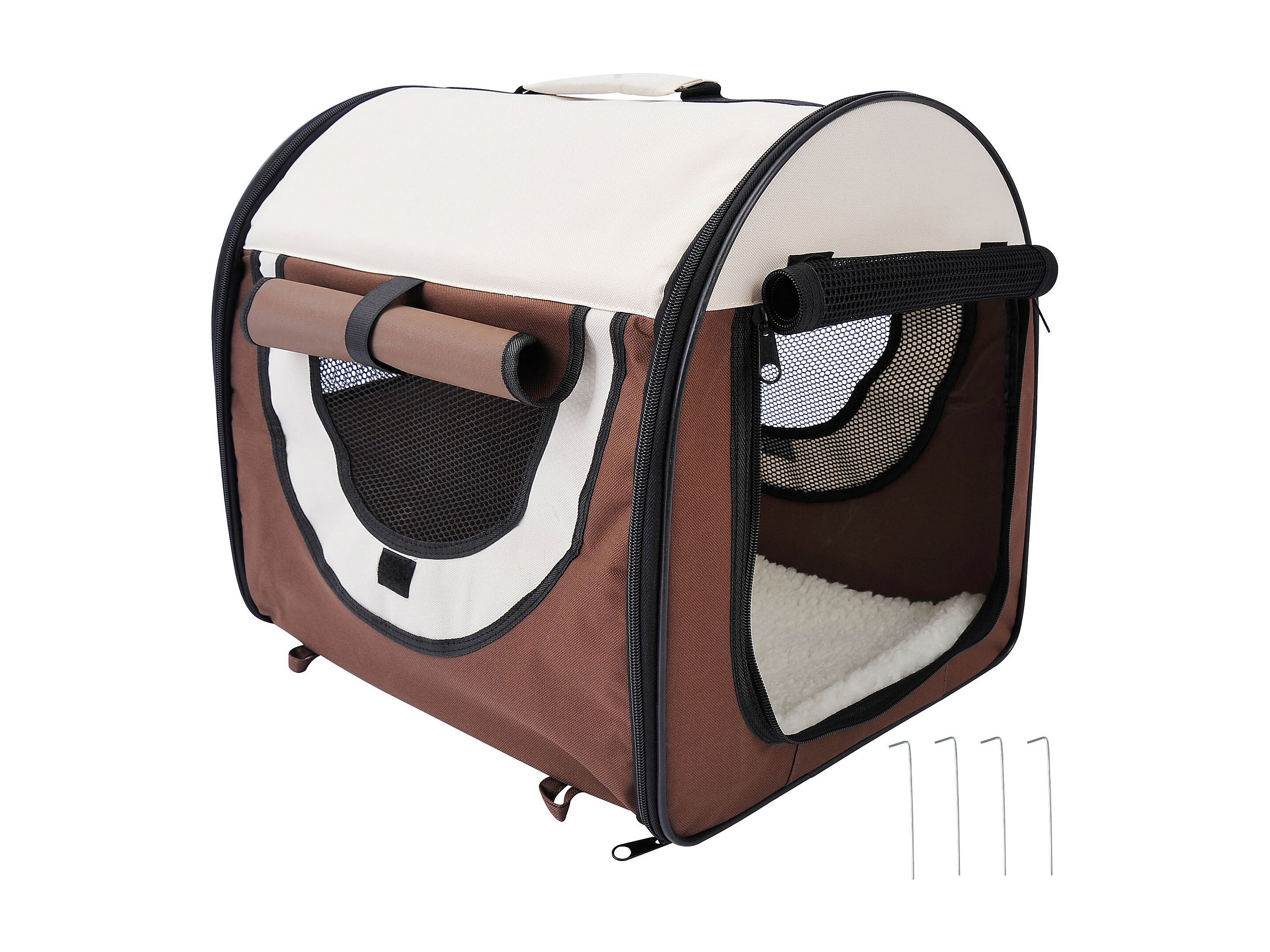 Sac de transport pour chien et chat pliable - poignée, entrée zippée, fenêtres maillées enroulables- coussin inclus - acier oxford marron beige
