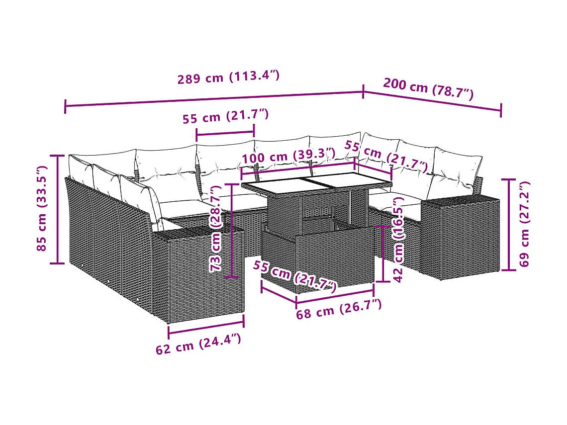 Salon de jardin 10 pcs avec coussins marron résine tressée