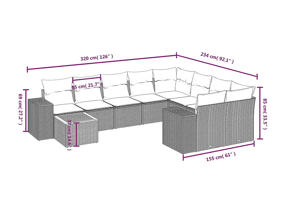 Salon de jardin 11 pcs avec coussins gris résine tressée