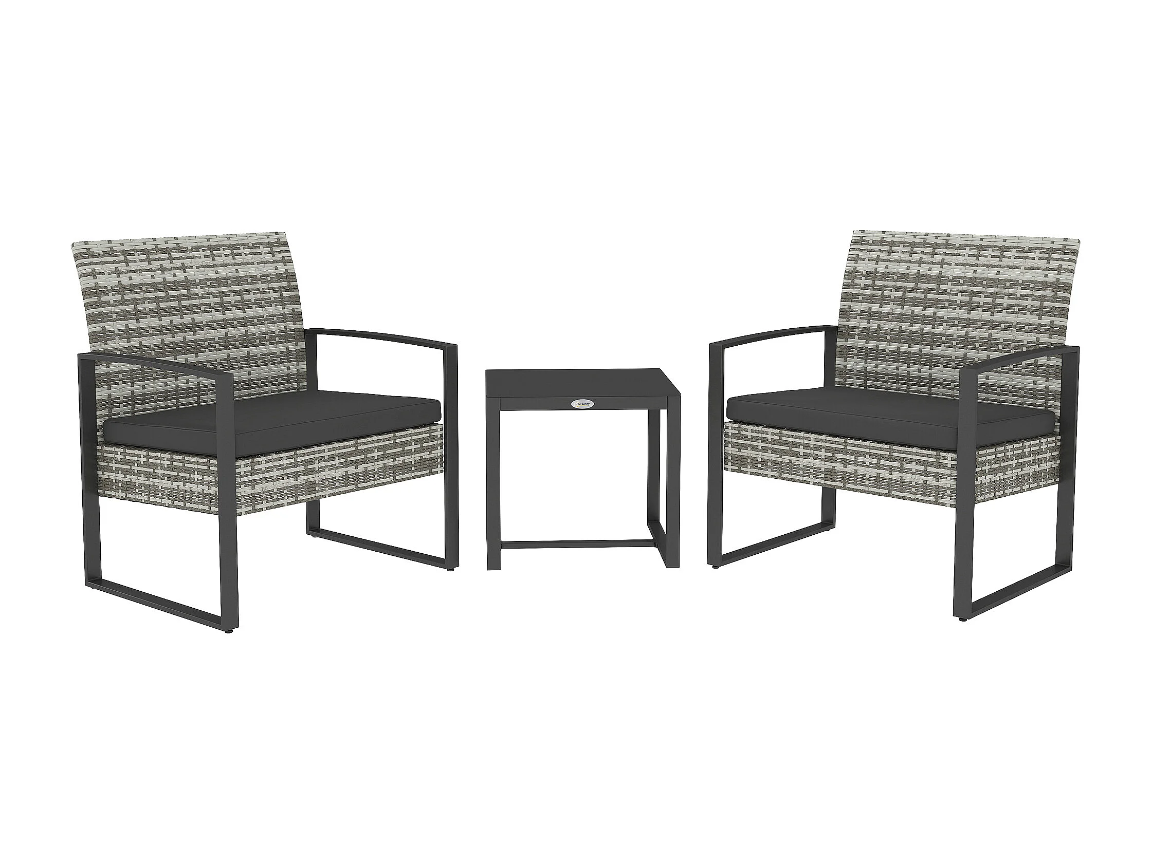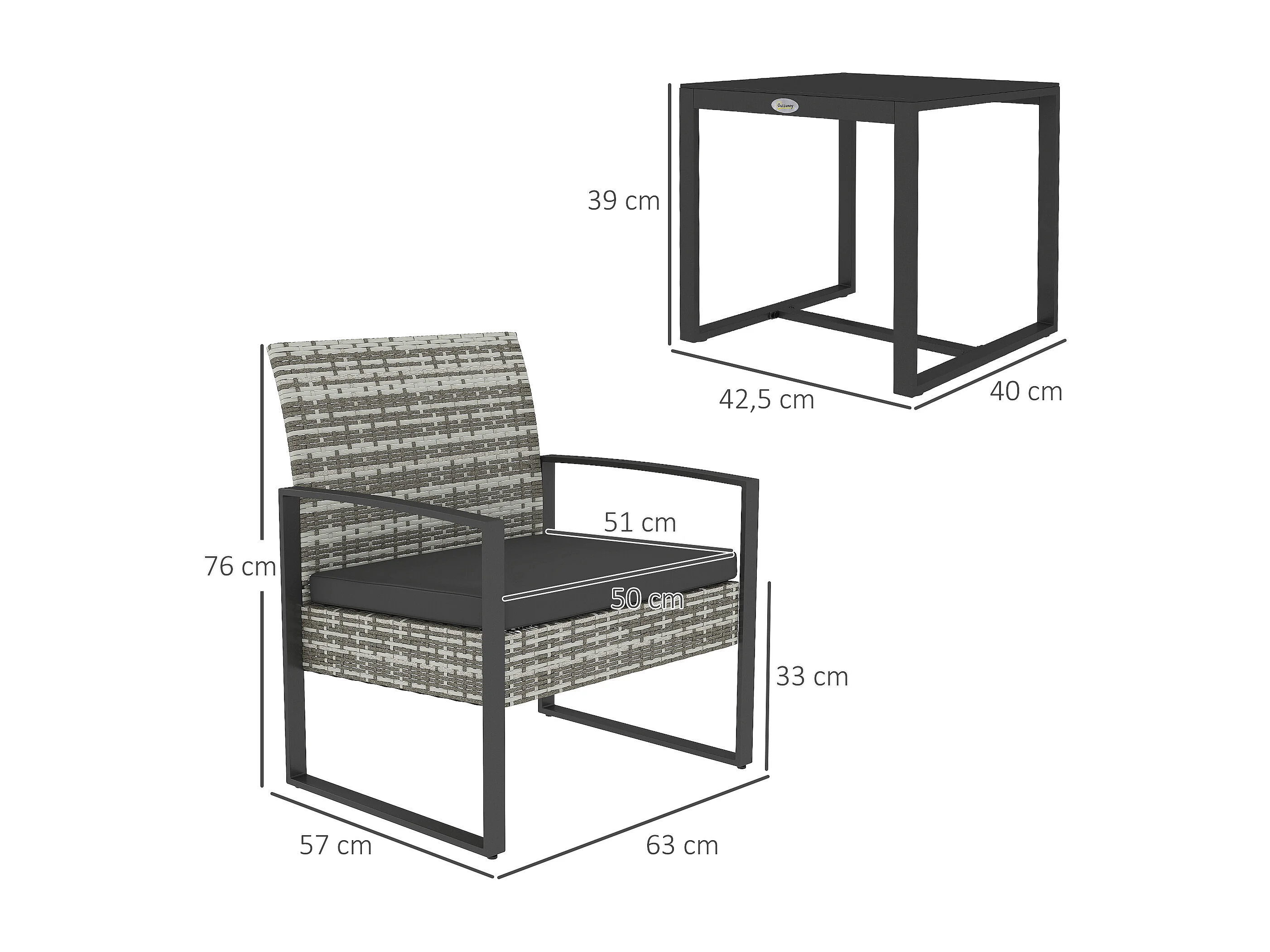 Salon de jardin 2 places 3 pièces 2 chaises avec coussins + table basse plateau verre trempé résine tressée aspect rotin gris