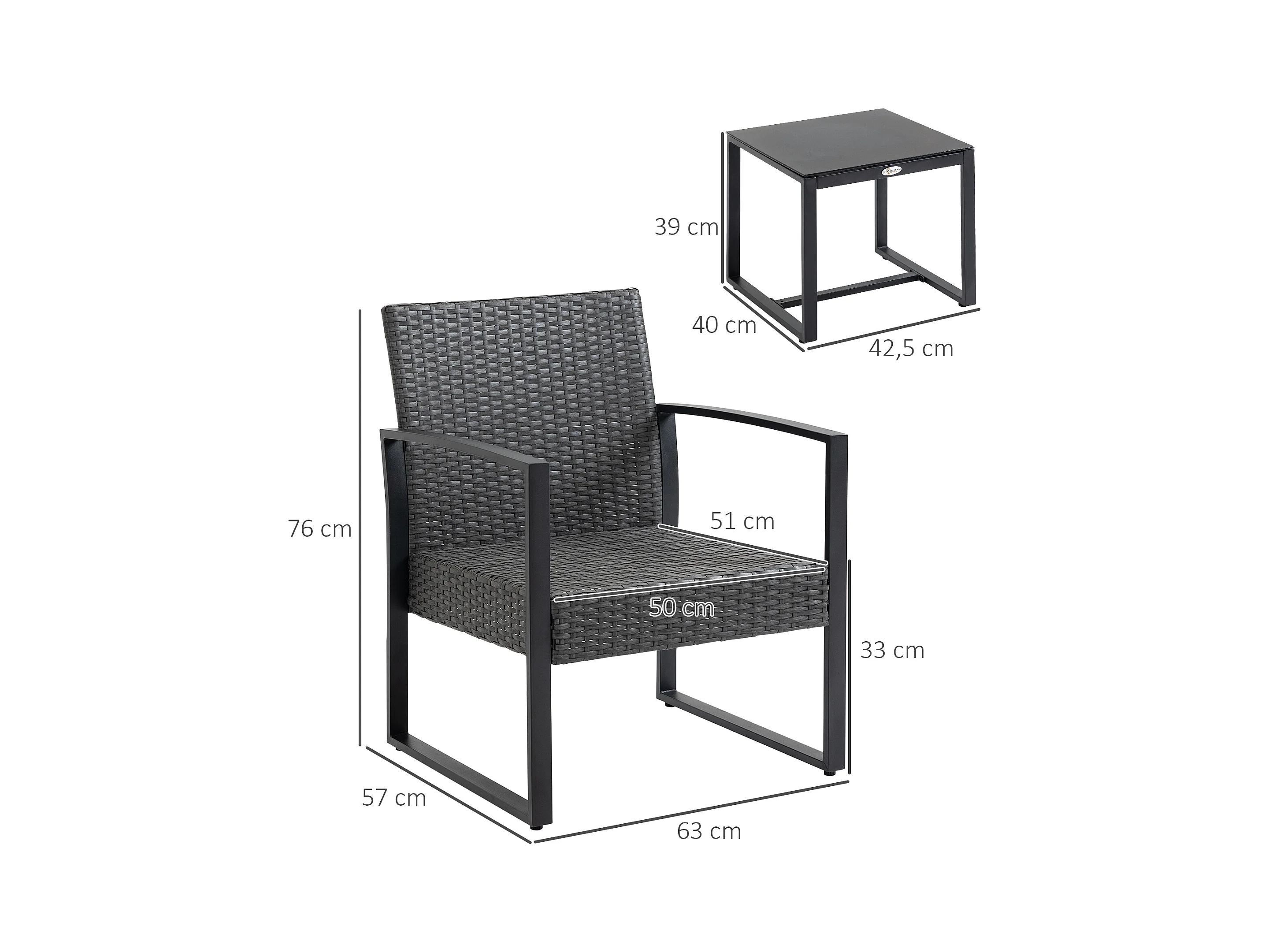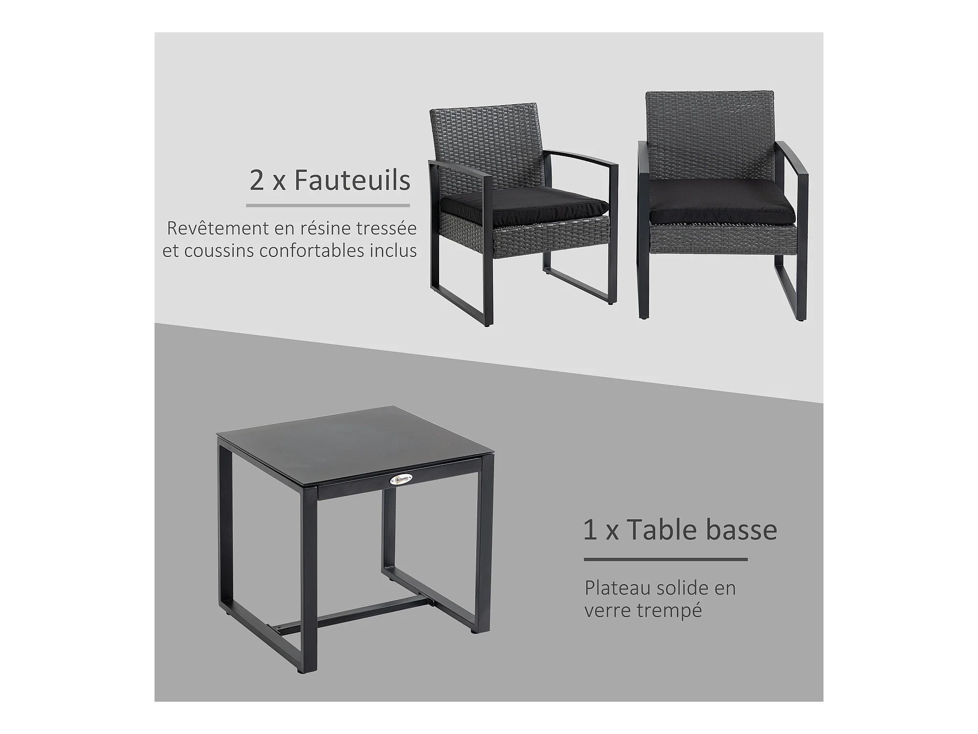 Salon de jardin 2 places 3 pièces 2 chaises avec coussins + table basse plateau verre trempé résine tressée aspect rotin noir