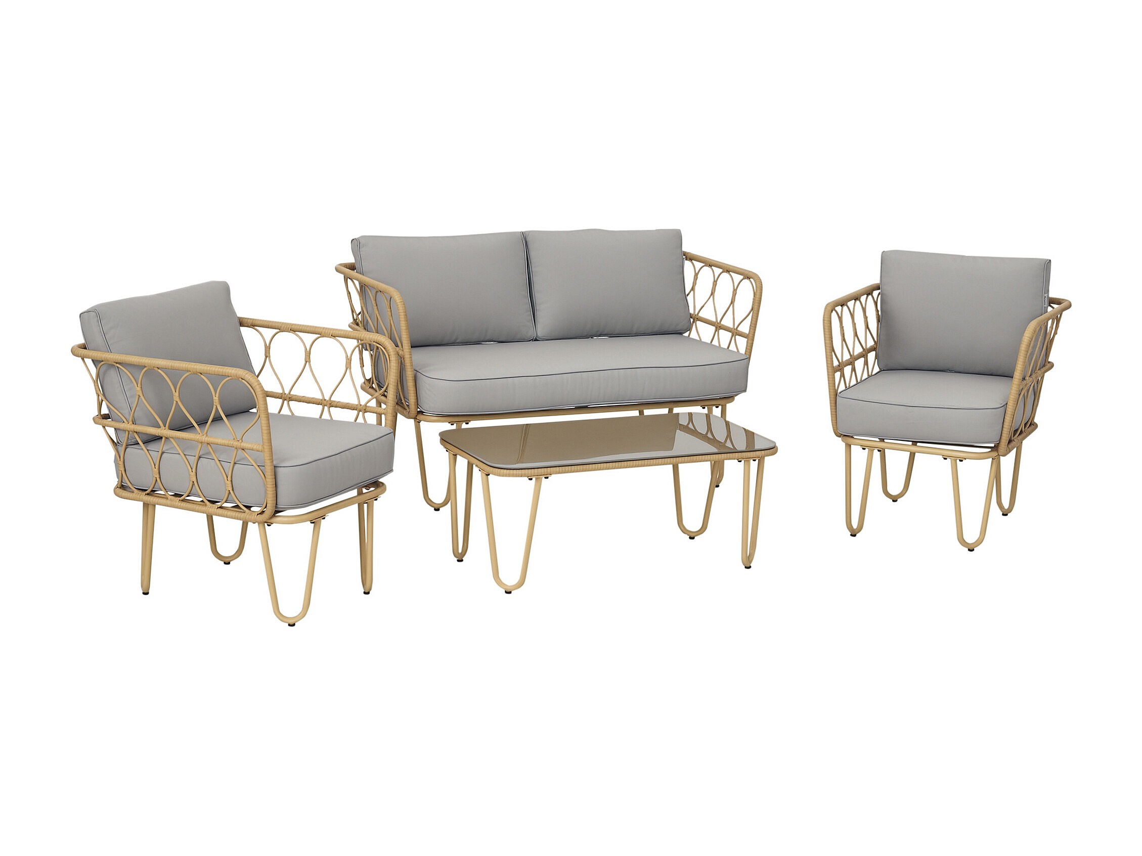 Salon de jardin 4 places 4 pièces style colonial résine tressée aspect rotin coussins gris