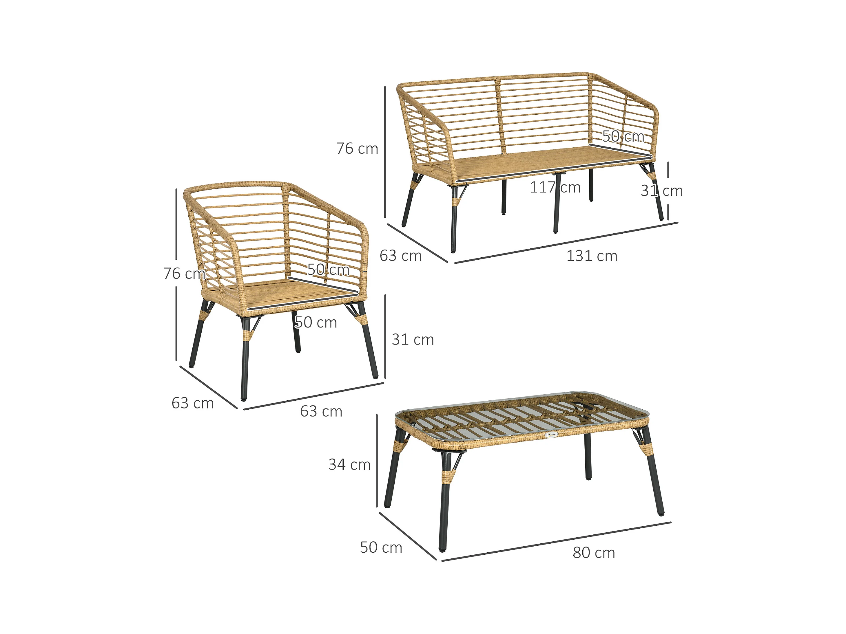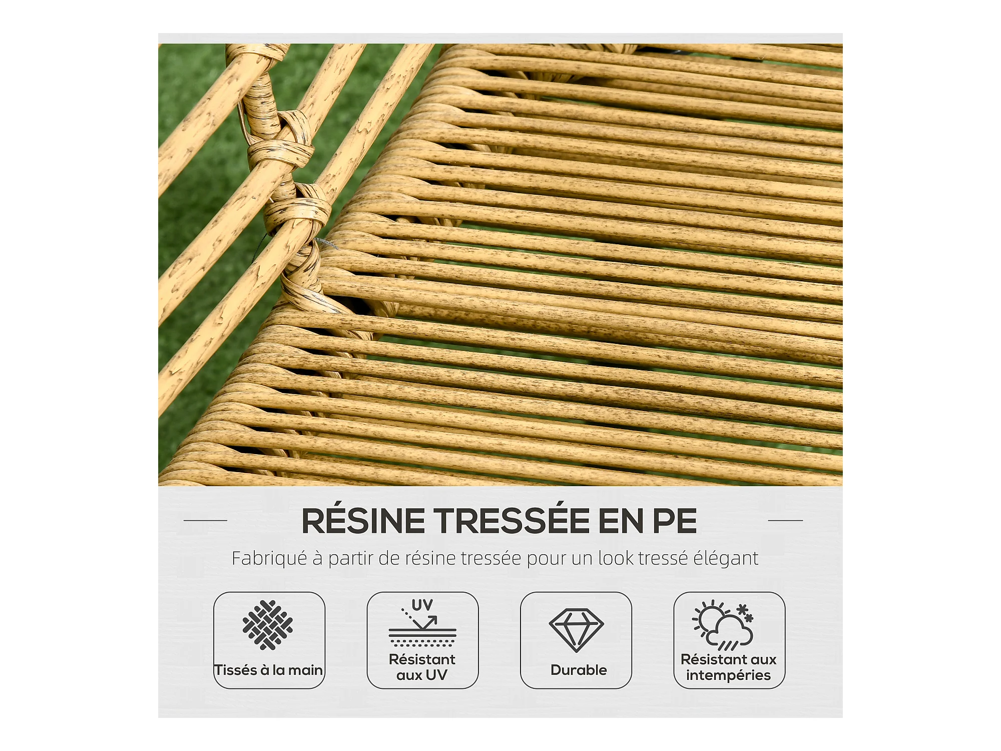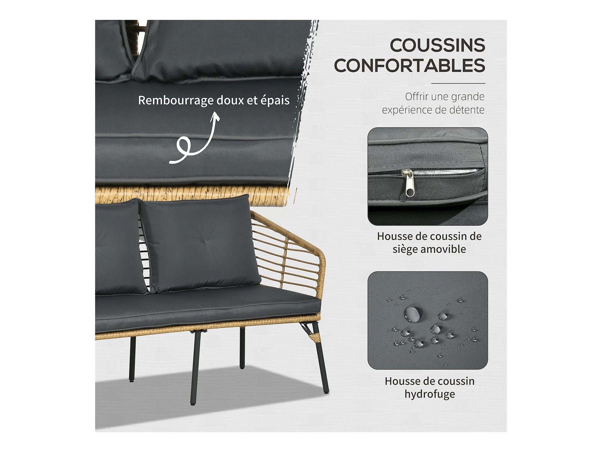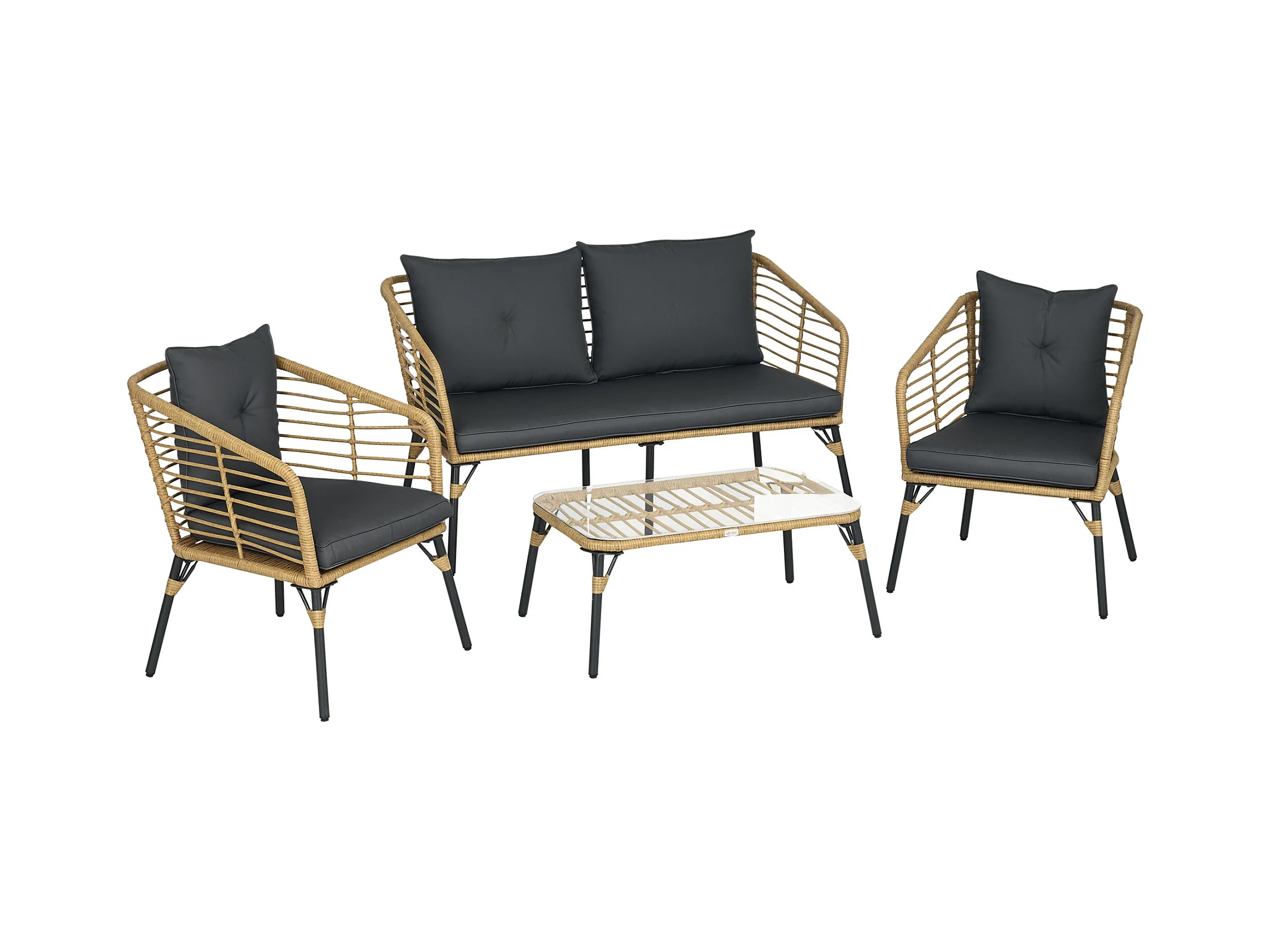 Salon de jardin 4 places 4 pièces style colonial table basse coussins gris fournis résine tressée aspect rotin