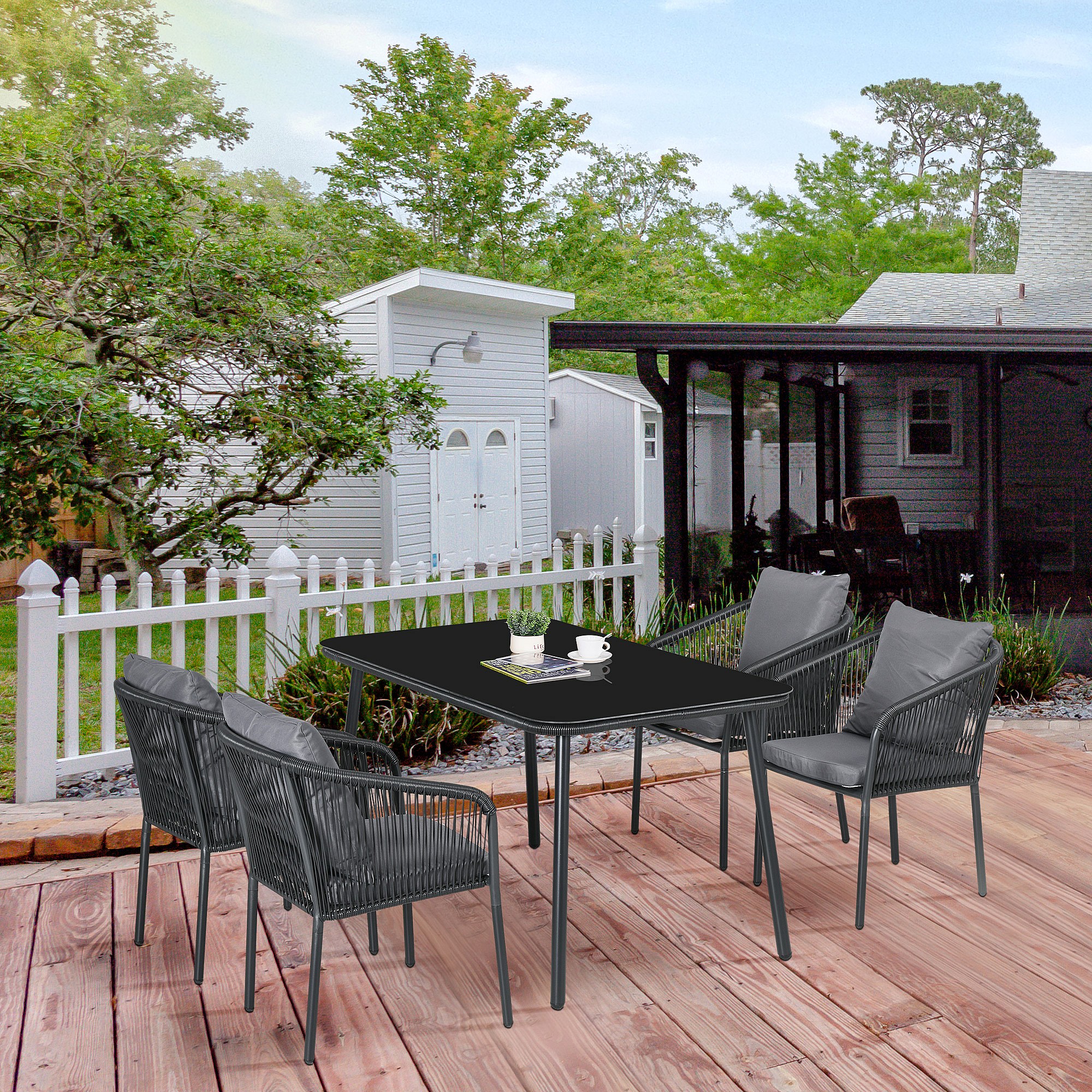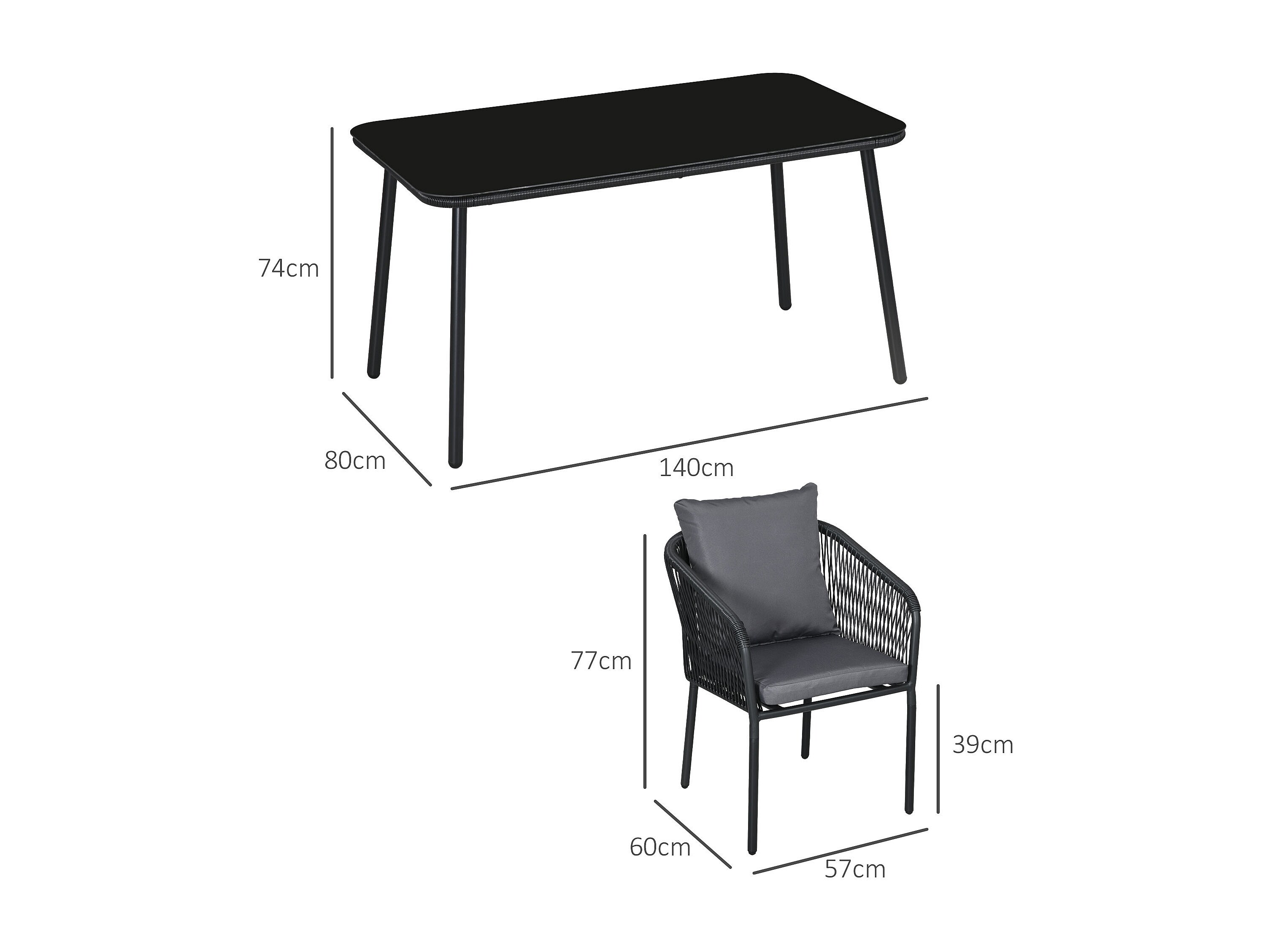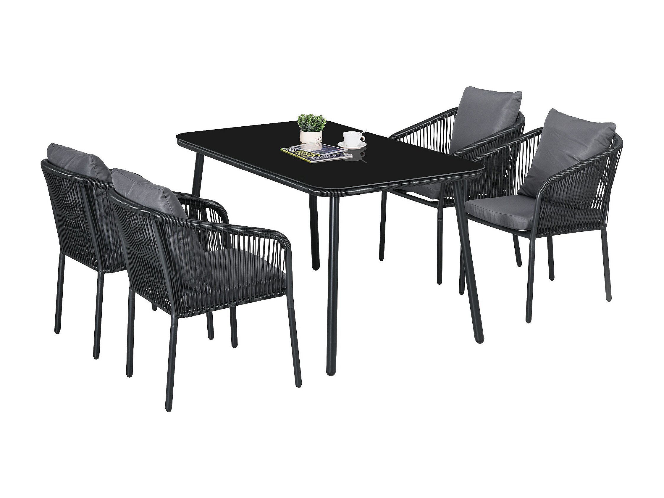 Salon de jardin 4 places 5 pièces table à manger chaises empilables coussins alu résine noir gris