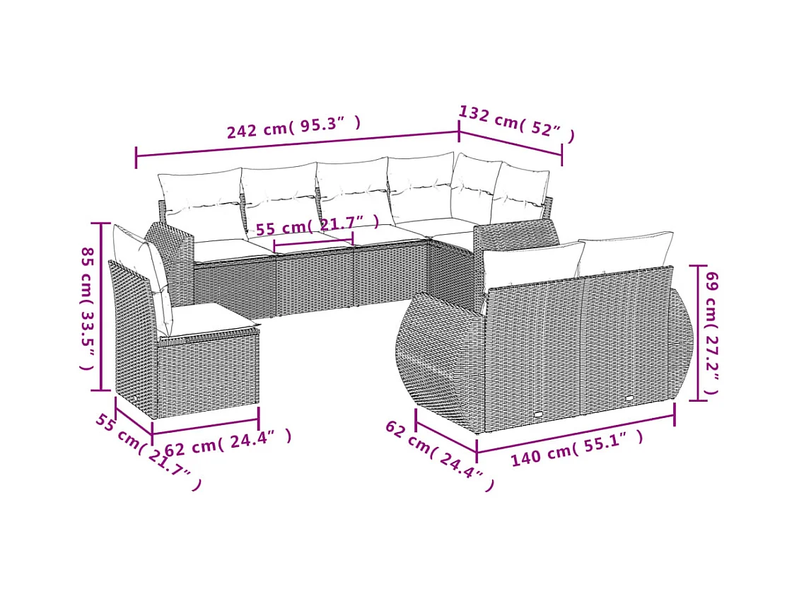 Salon de jardin 8 pcs avec coussins marron résine tressée