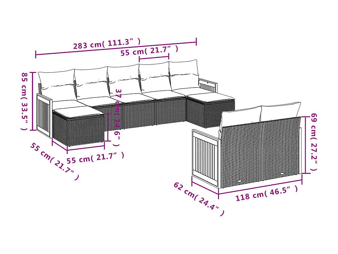 Salon de jardin 9 pcs avec coussins noir résine tressée