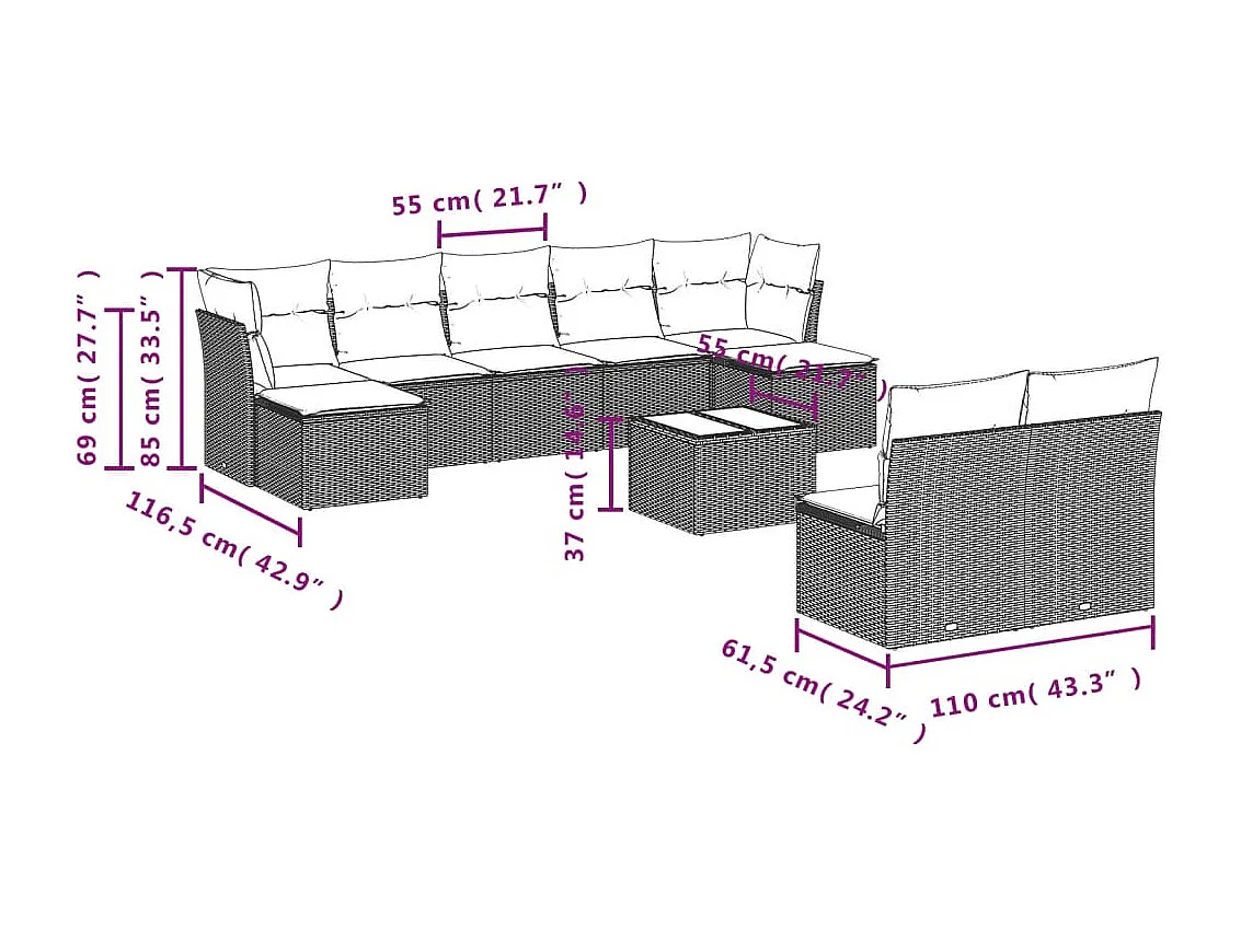 Salon de jardin avec coussins 10 pcs gris résine tressée