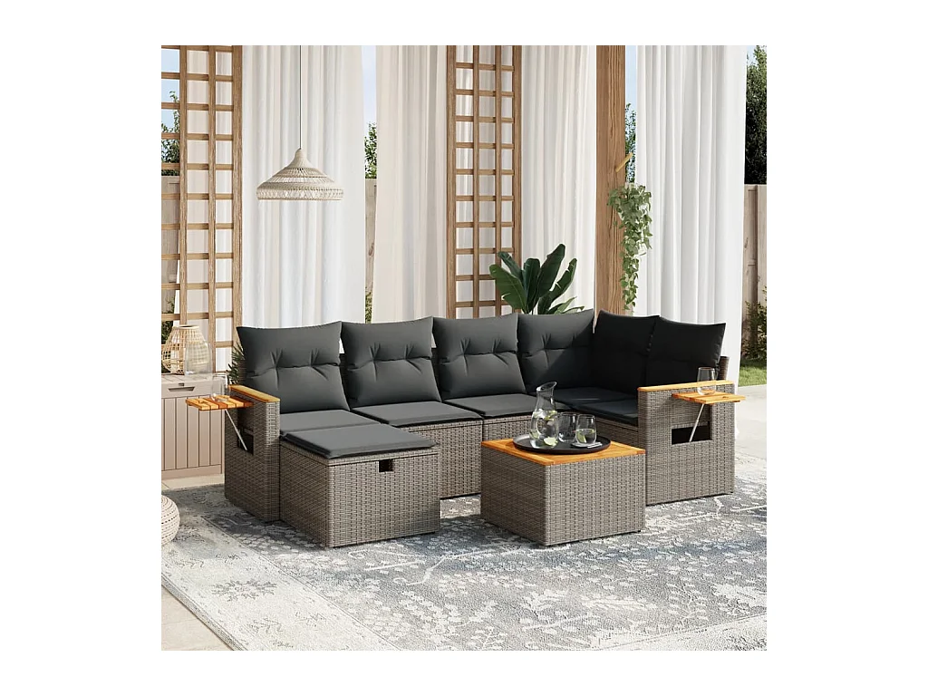 Salon de jardin avec coussins 7 pcs gris résine tressée