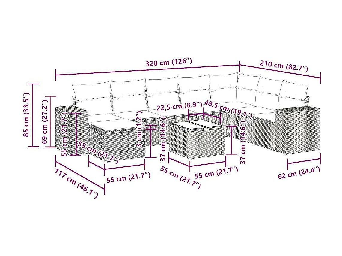 Salon de jardin avec coussins 9 pcs beige résine tressée