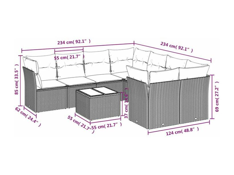 Salon de jardin avec coussins 9 pcs marron résine tressée