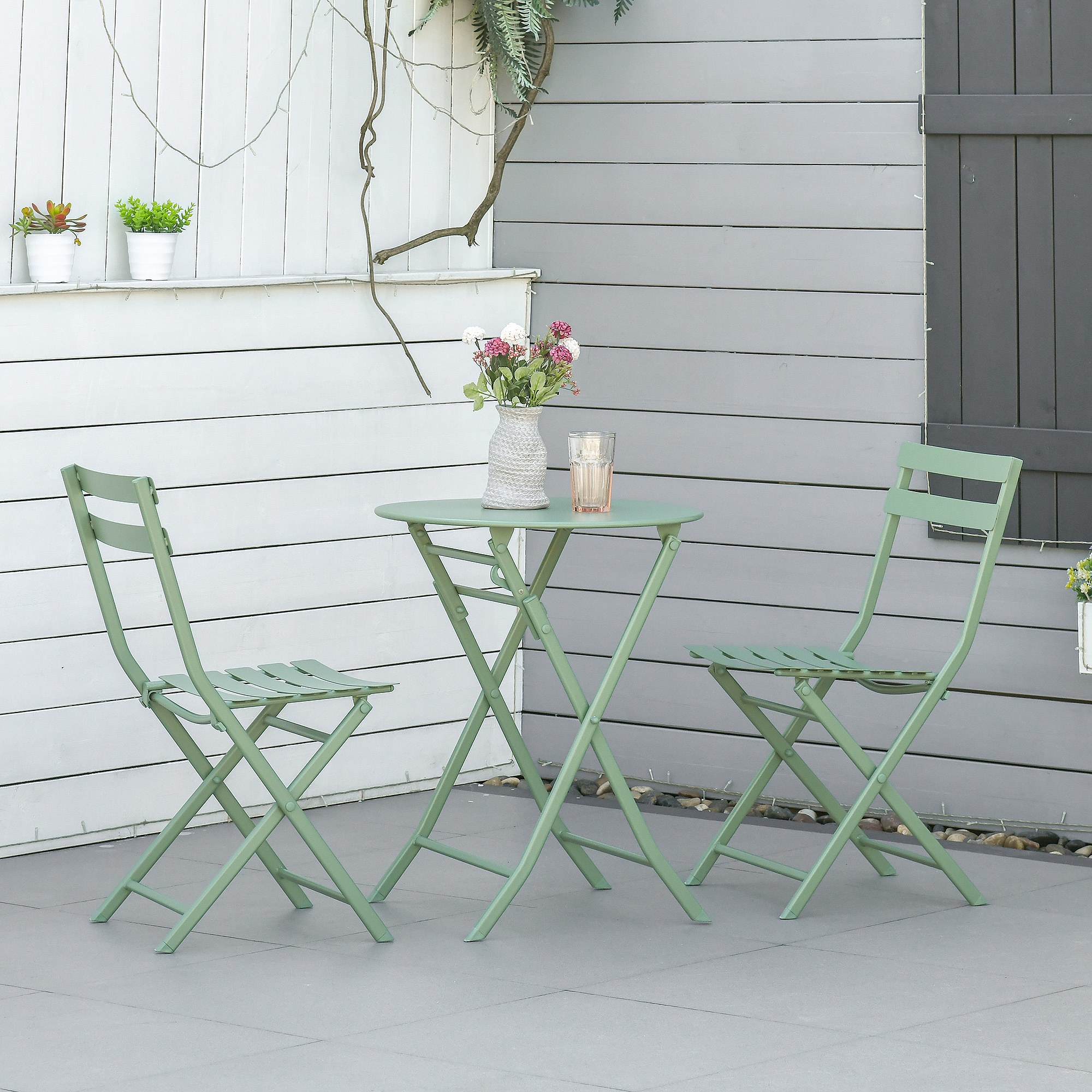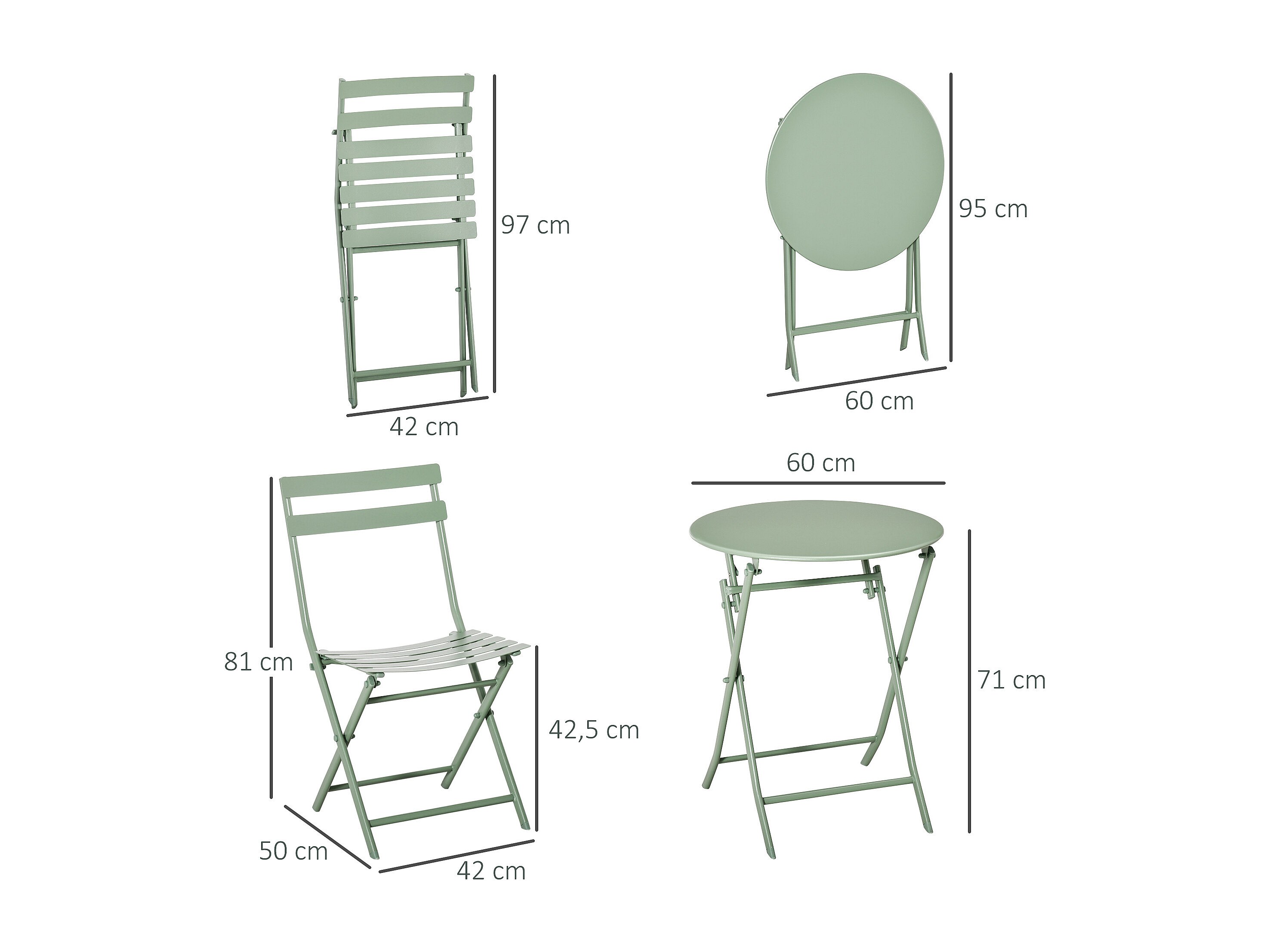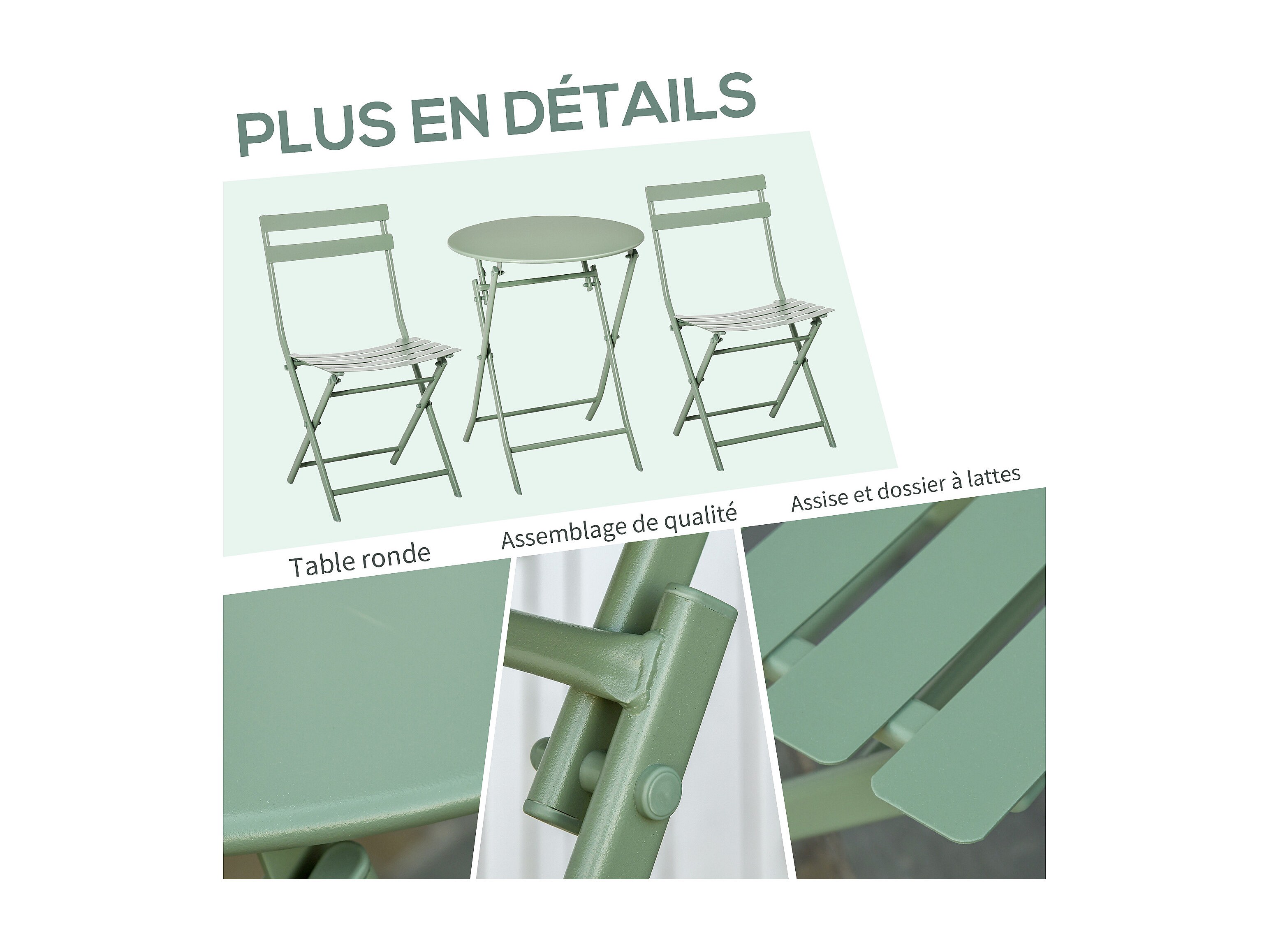 Table de jardin bistrot pliante métal + 2 assises vert de gris Ø60 x 70cm. acier thermolaqué