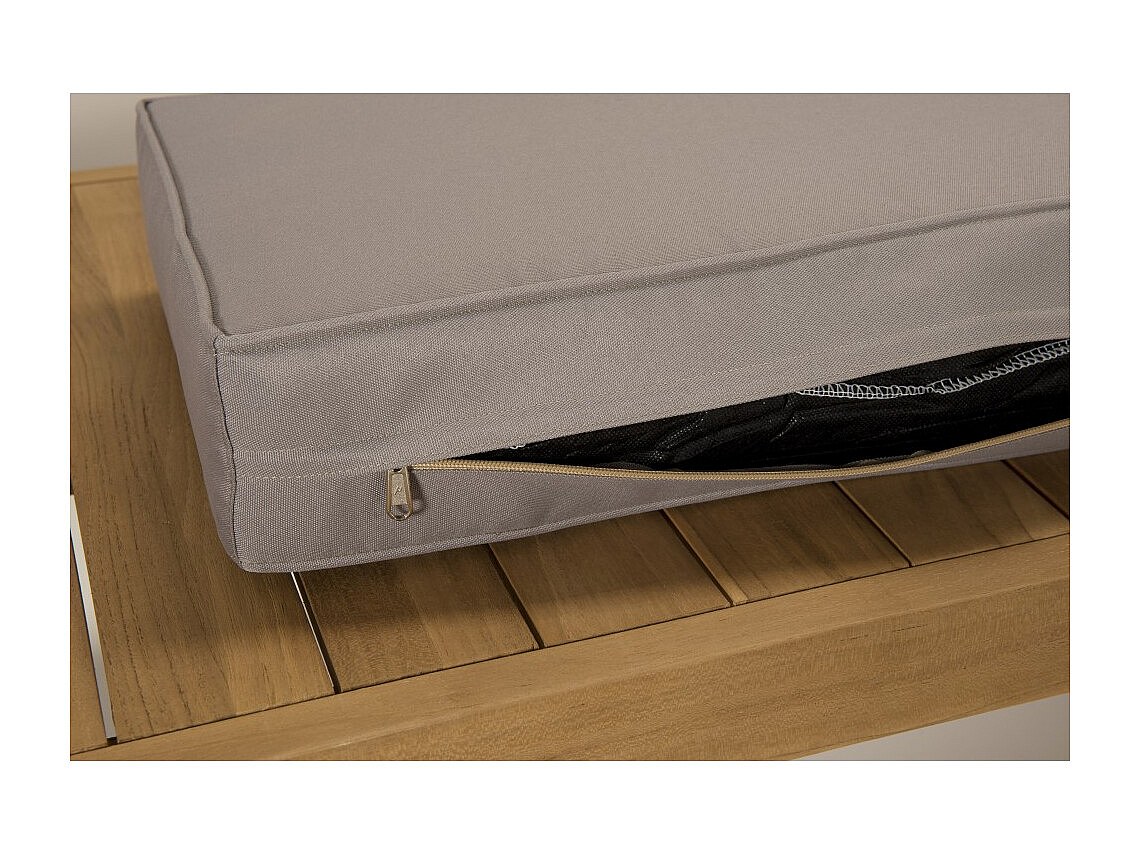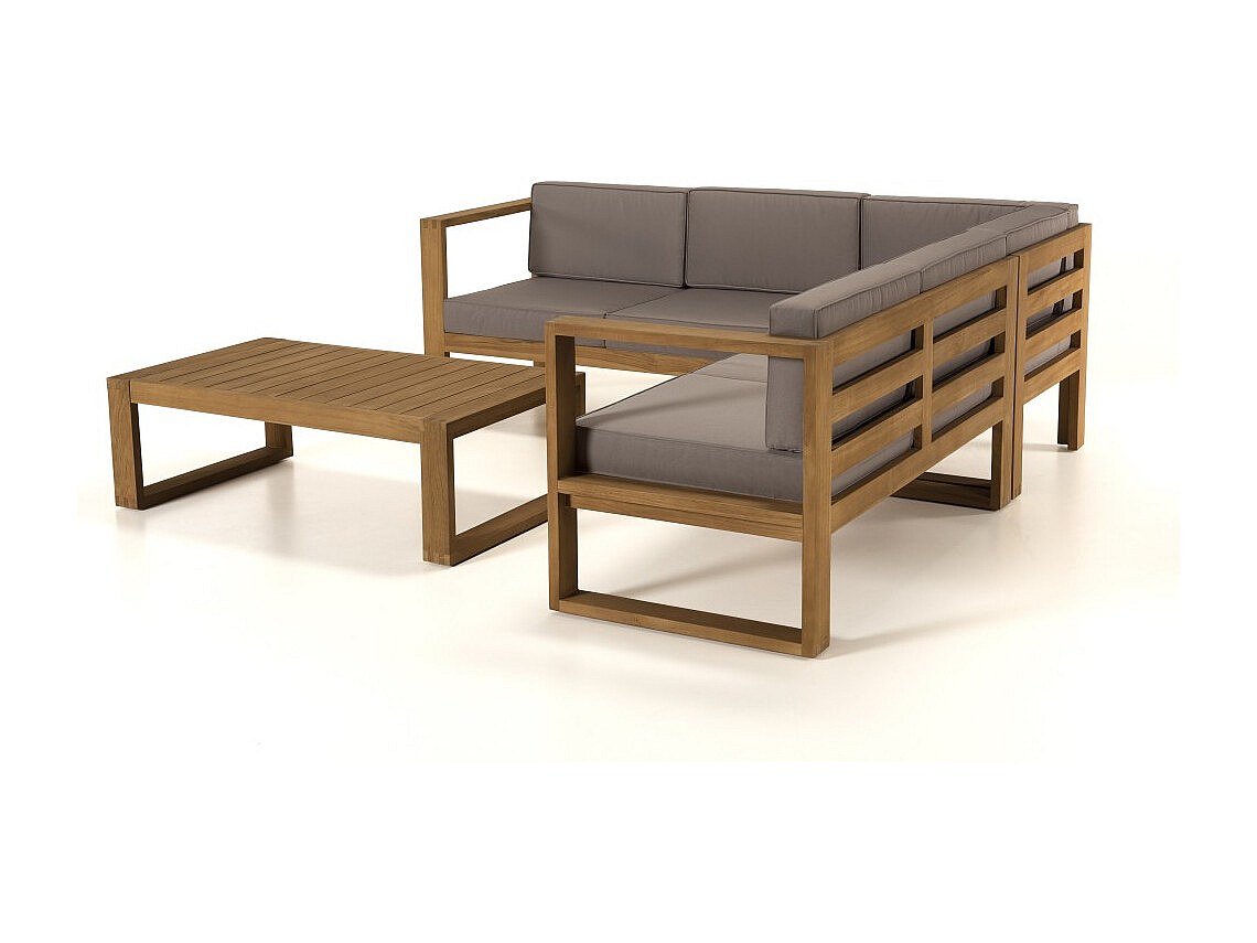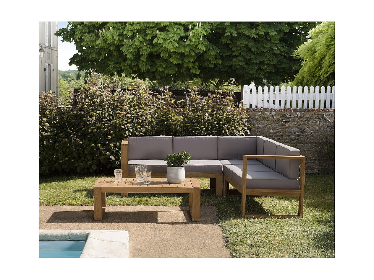 KIM - SALON DE JARDIN EN BOIS TECK : 1 Canapé d'angle 5p. avec coussin waterproof et une table basse rectangulaire 110x60 cm