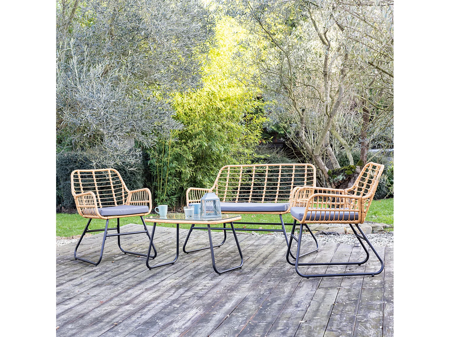 Salon de jardin TIGA en résine tressée 4 places - coussins gris - HAPPY GARDEN