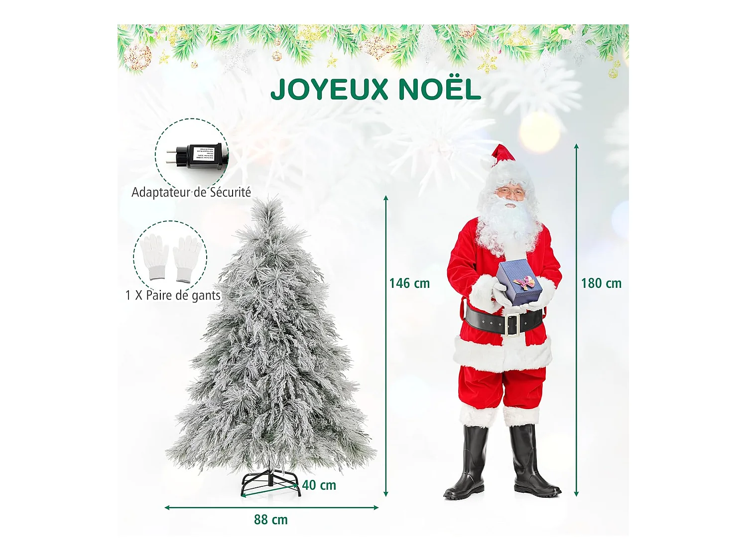 Sapin de noël artificiel 146 cm, 279 branches avec 150 led blanc chaud, aiguilles de pin