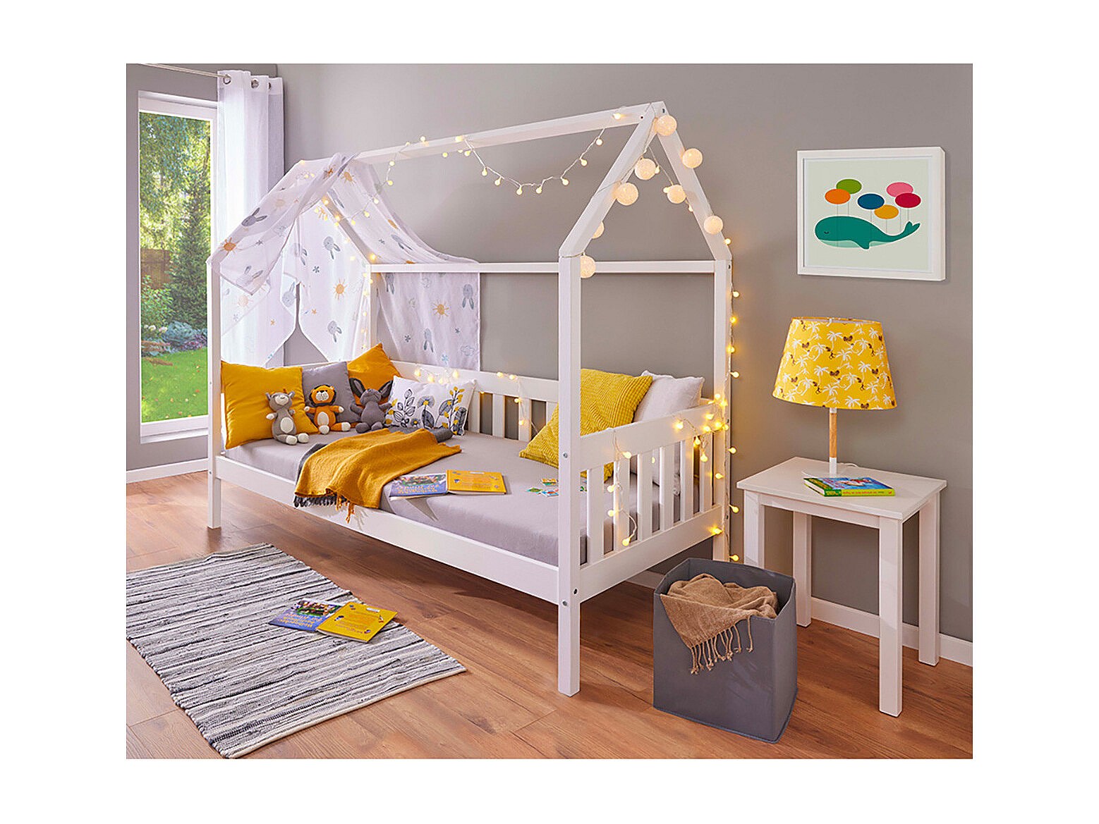 SARRY - Pack Lit Cabane à Barrières 90x200cm + Table de Chevet