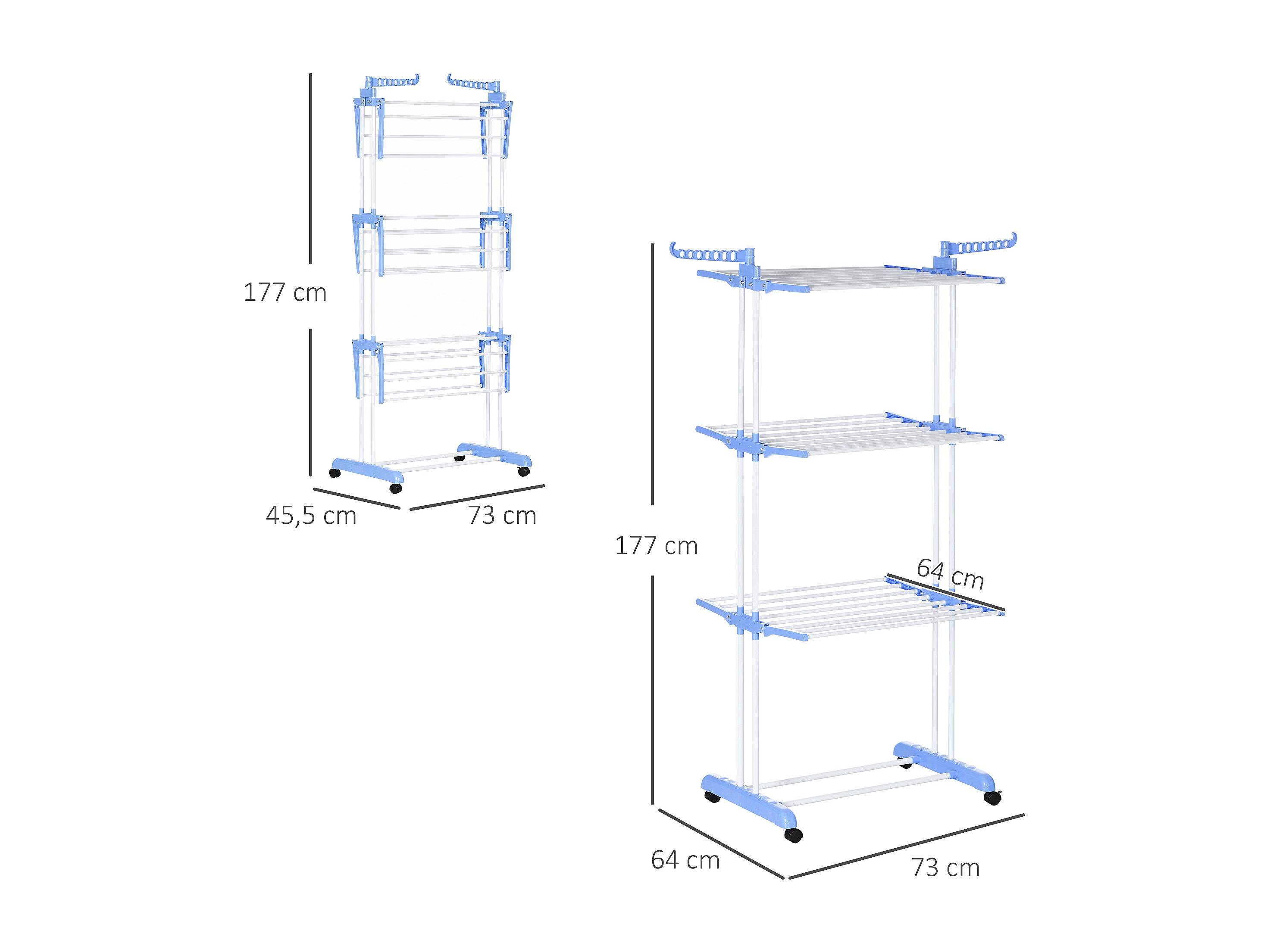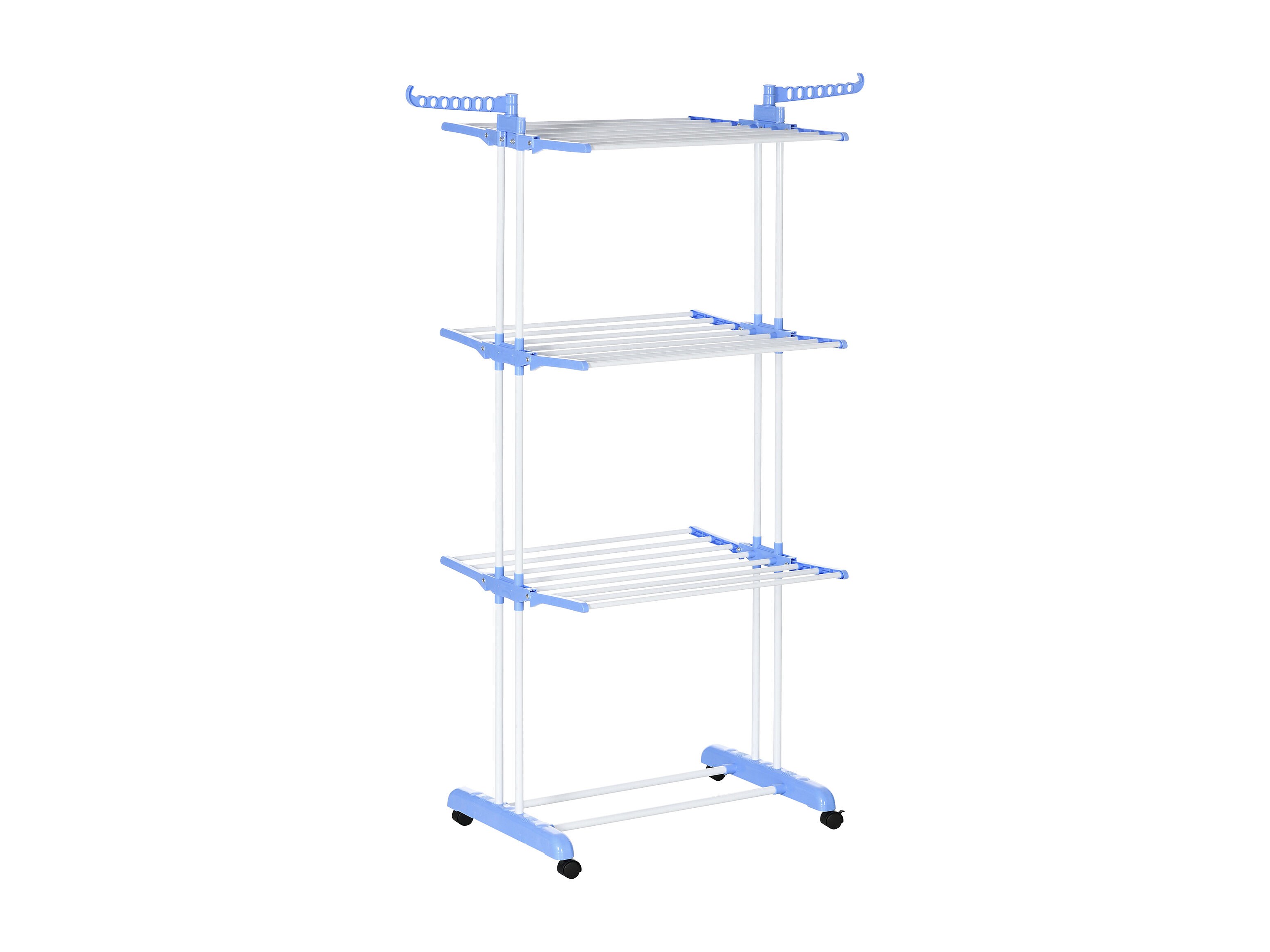 Sechoir à linge étendoir pliable 3 niveaux 2 ailes latérales à cintres acier blanc PP bleu