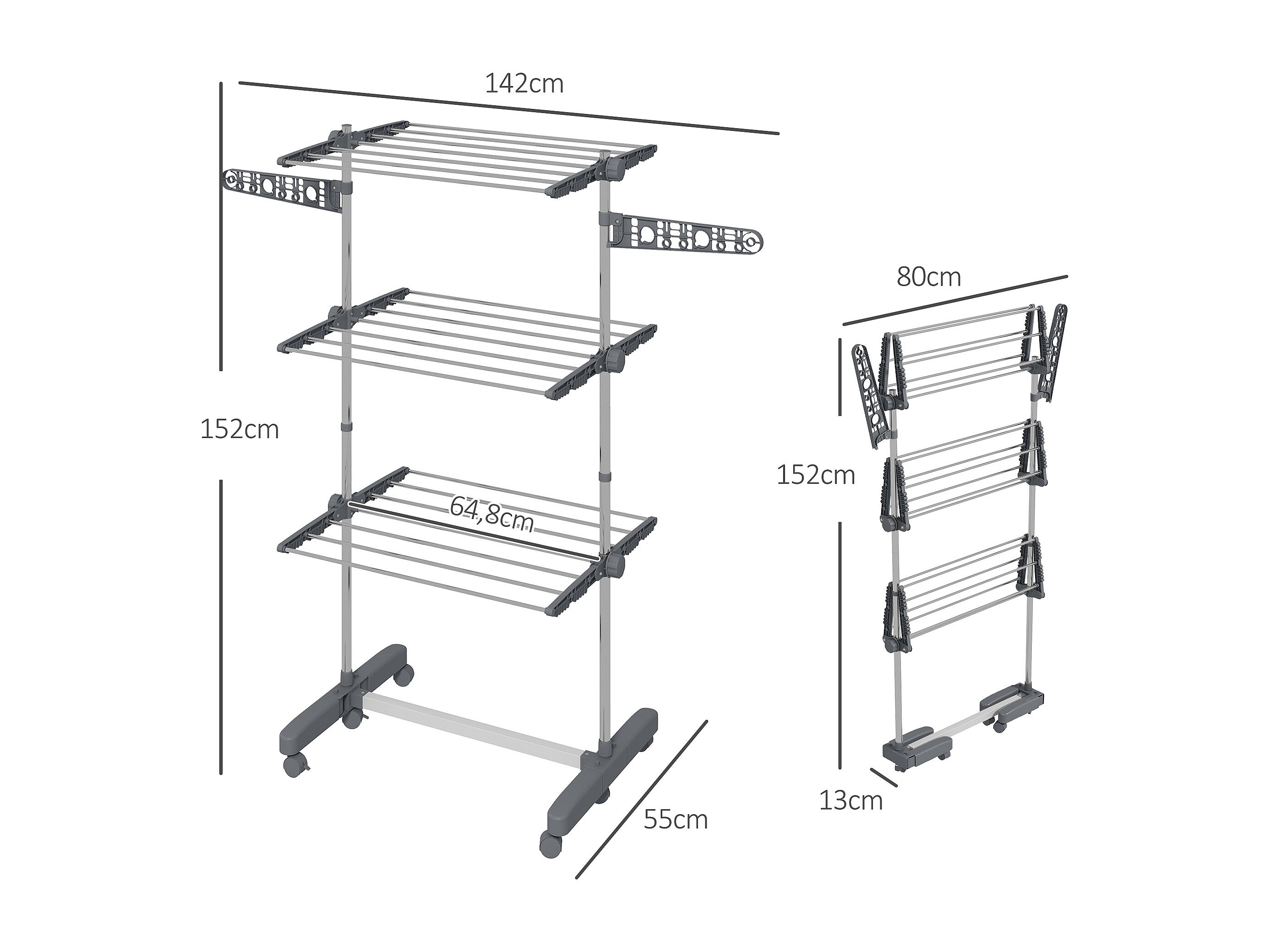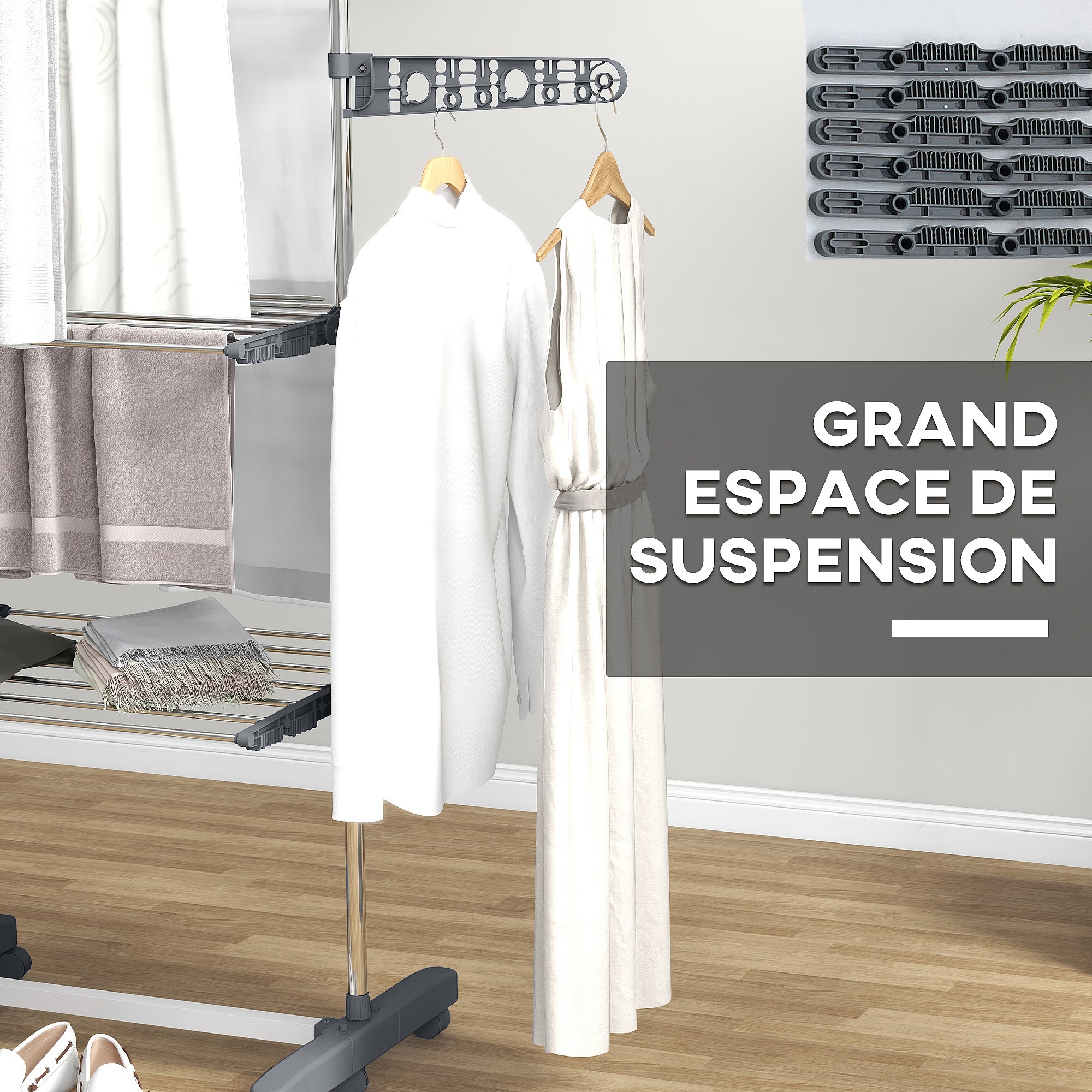 Séchoir à linge étendoir pliable ailes latérales 3 niveaux acier inox PP gris