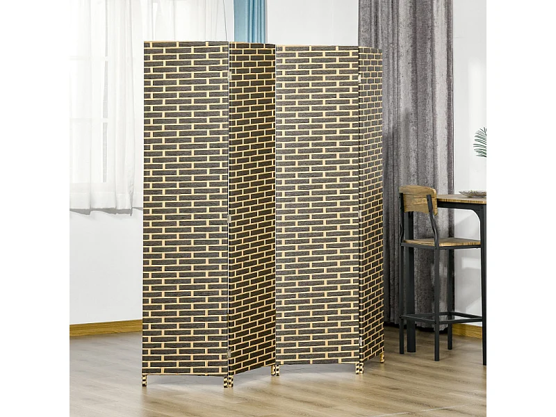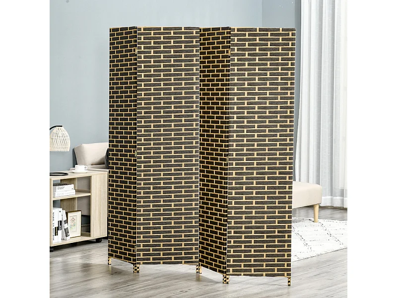 Paravent intérieur 4 panneaux pliables séparateur de pièce bois de peuplier fibres de papier tressée chocolat paille