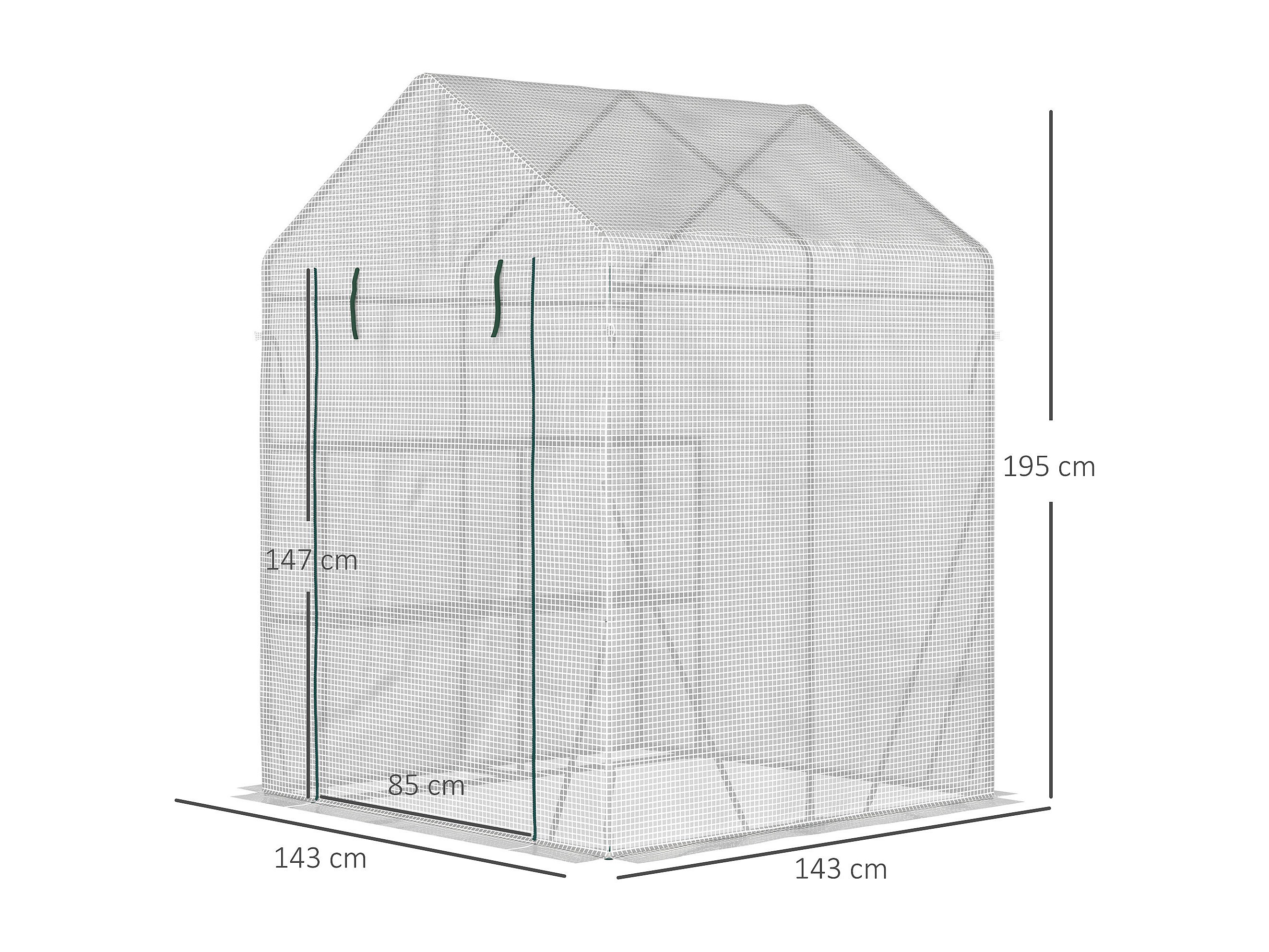 Serre de jardin 2 tablettes dim. 1,43L x 1,43l x 1,95H m porte déroulante acier PE haute densité 140 g/m² transparent blanc