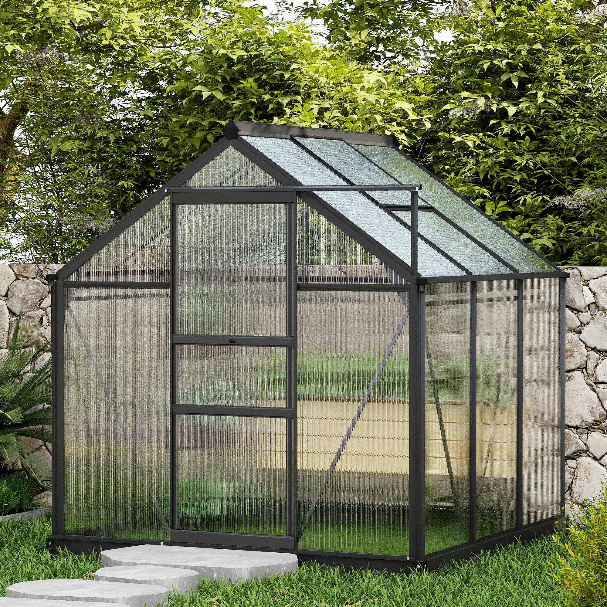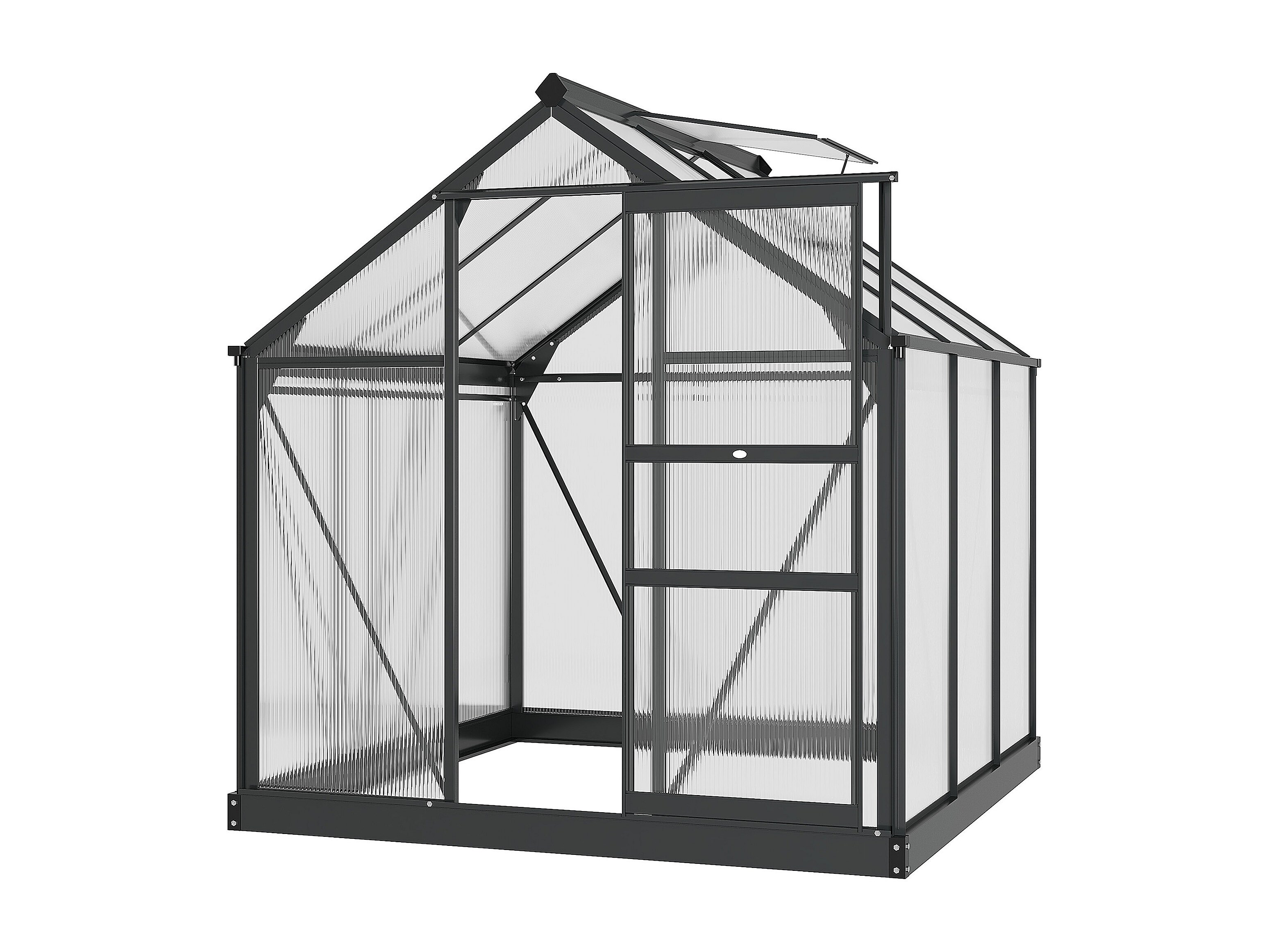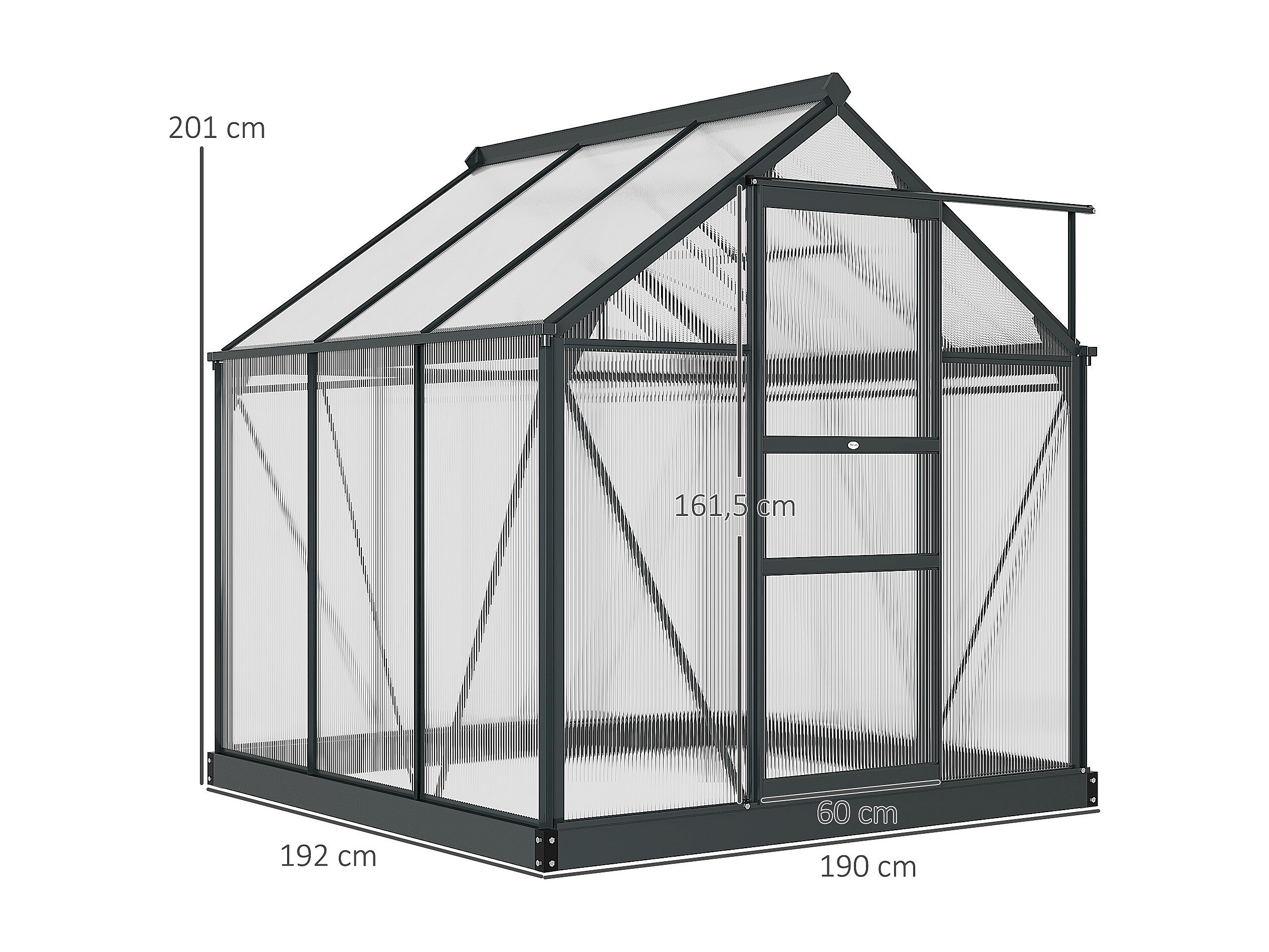 Serre de jardin aluminium polycarbonate 3,65 m² dim. 1,9L x 1,92l x 2,01H m lucarne, porte coulissante + fondation incluse alu. gris polycarbonate transparent