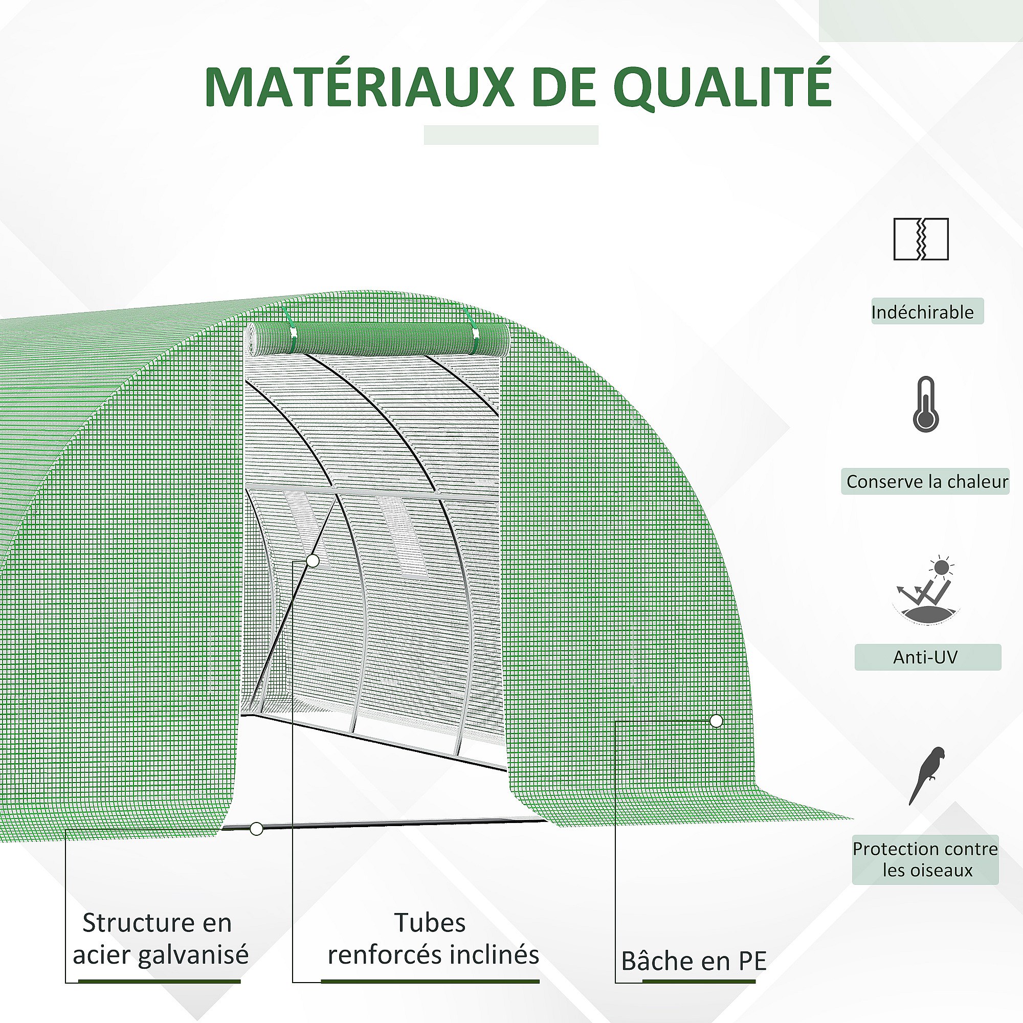 Serre de jardin tunnel 4,5L x 2l x 2H m châssis tubulaire acier galvanisé renforcé 1,8 cm 6 fenêtres 1 porte vert