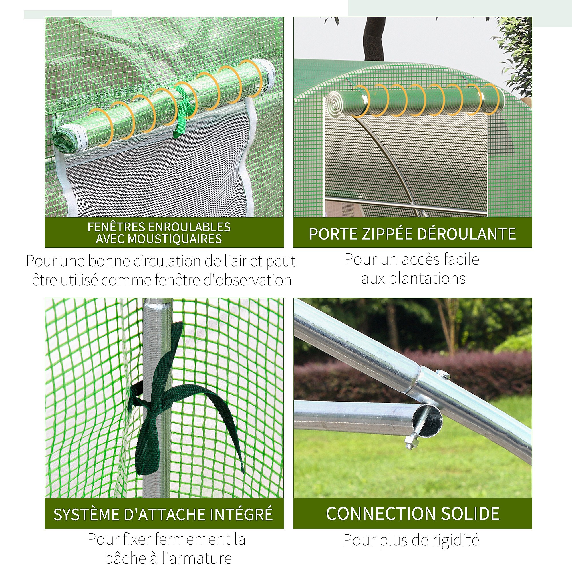 Serre de jardin tunnel surface sol 8 m² 4L x 2l x 2,10H m châssis tubulaire renforcé porte zippée 6 fenêtres enroulables vert