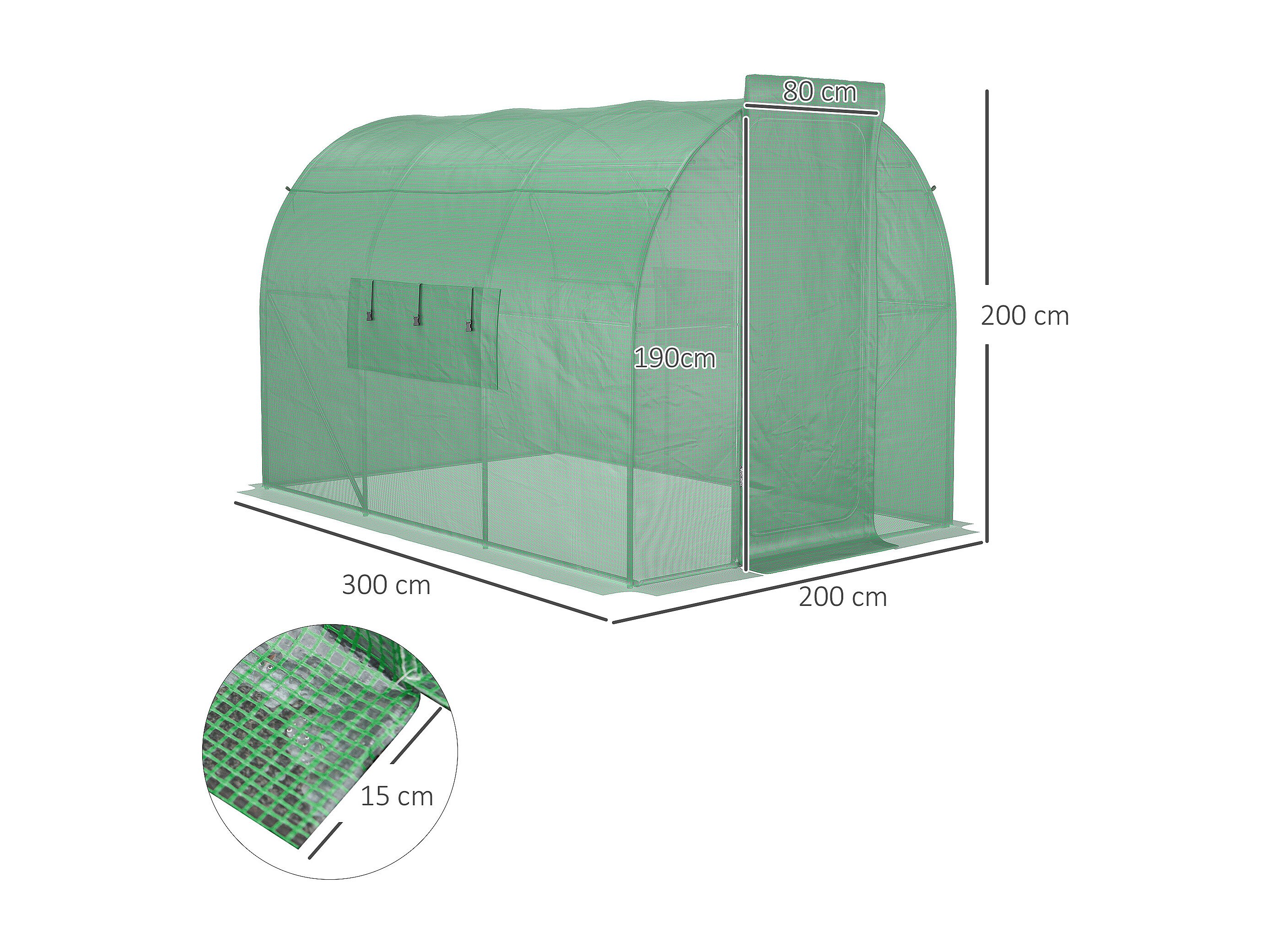 Serre tunnel de jardin grande taille dim. 3,47L x 3l x 2H m - 6 fenêtres et porte zippée enroulable - acier galvanisé PE haute densité vert