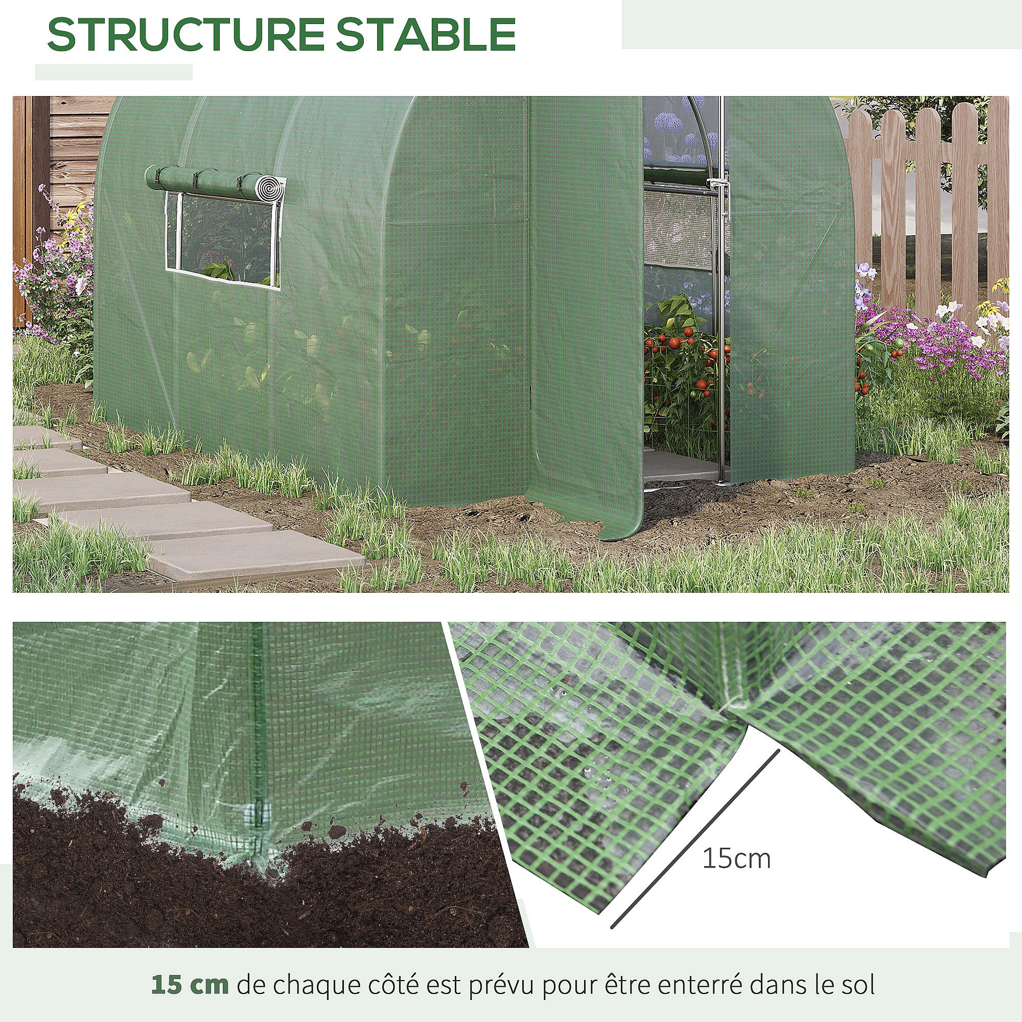 Serre de jardin tunnel surface sol 6 m² 3L x 2l x 2H m châssis tubulaire renforcé porte zippée 6 fenêtres enroulables vert