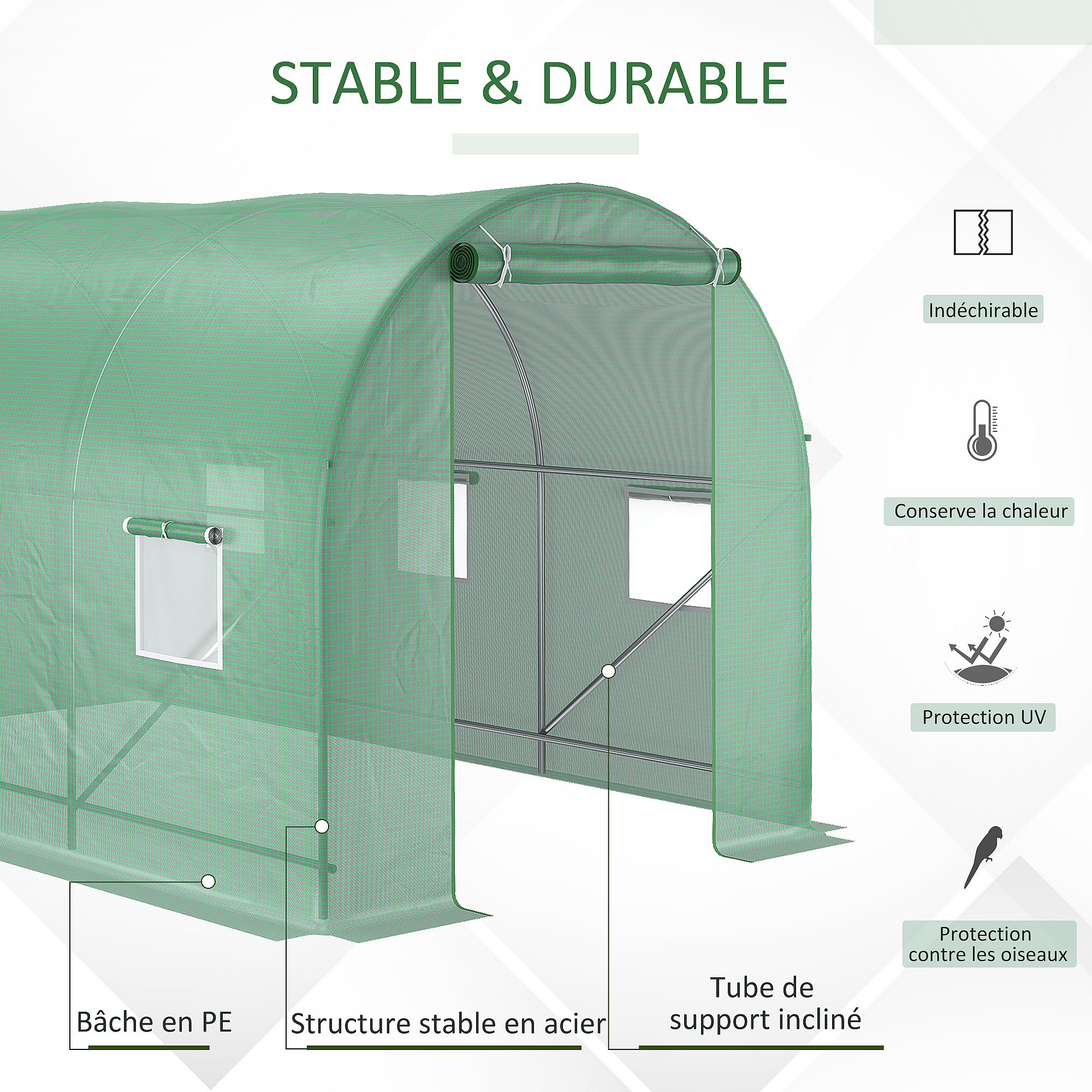 Serre de jardin tunnel 4,5L x 2l x 2H m châssis tubulaire acier galvanisé renforcé 1,8 cm 6 fenêtres 1 porte vert