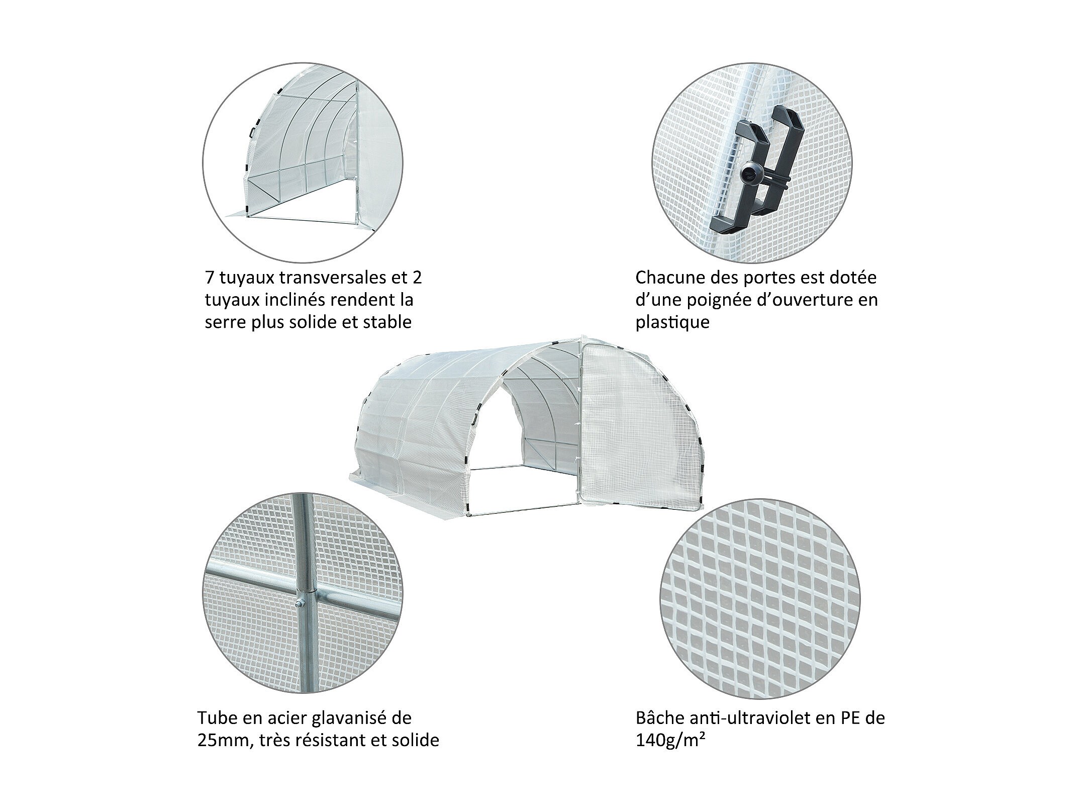 Serre de jardin tunnel surface sol 12 m² 4L x 3l x 2H m châssis tubulaire renforcé 25 mm double porte avec poignées blanc