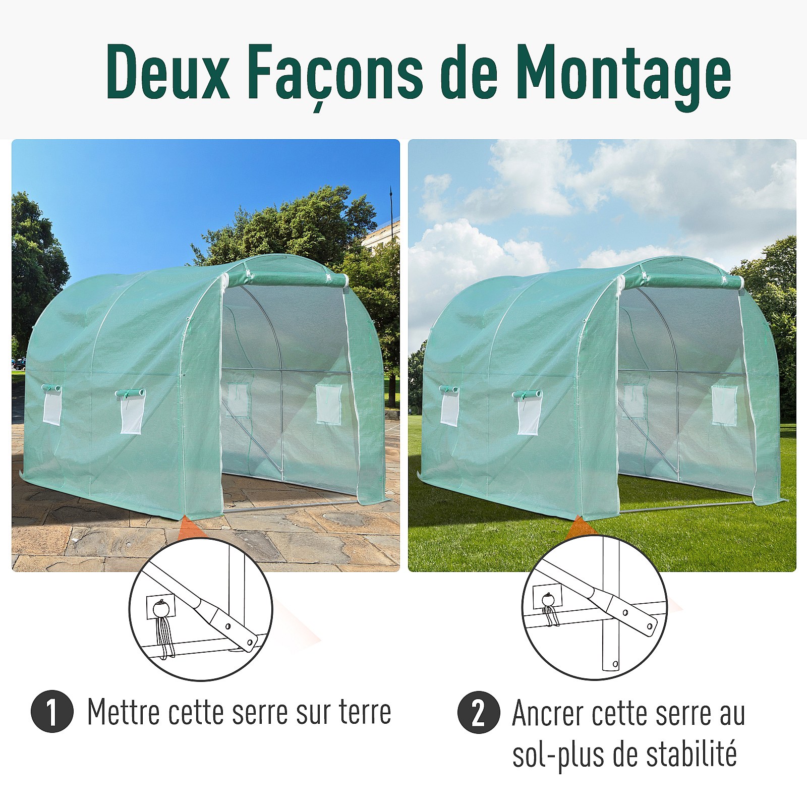 Serre de jardin tunnel acier galvanisé renforcé diamètre 2,4 cm + PE haute densité fenêtres porte vert