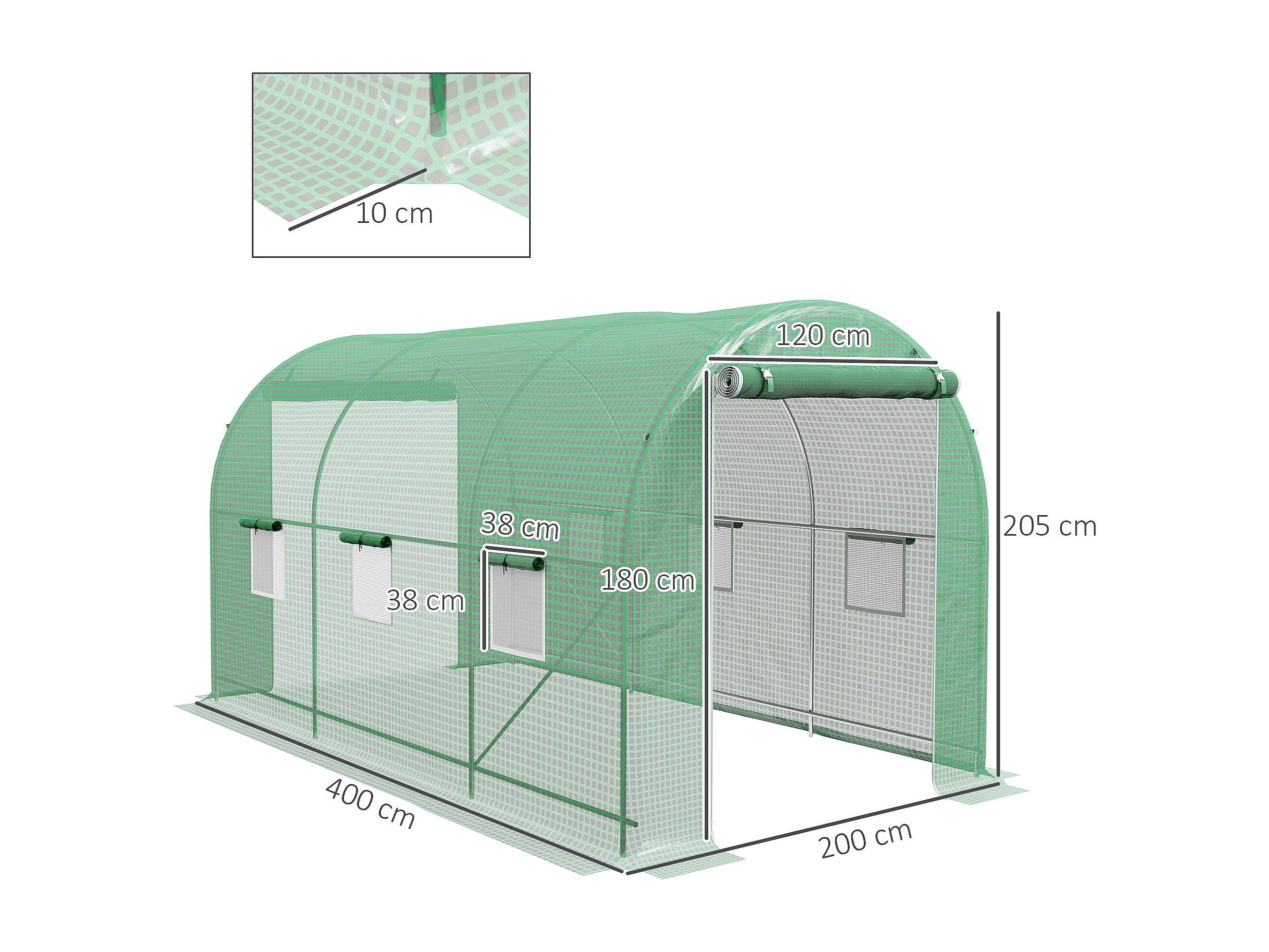 Serre de jardin tunnel surface sol 8 m² 4L x 2l x 2,05H m châssis tubulaire renforcé porte zippée 6 fenêtres enroulables vert