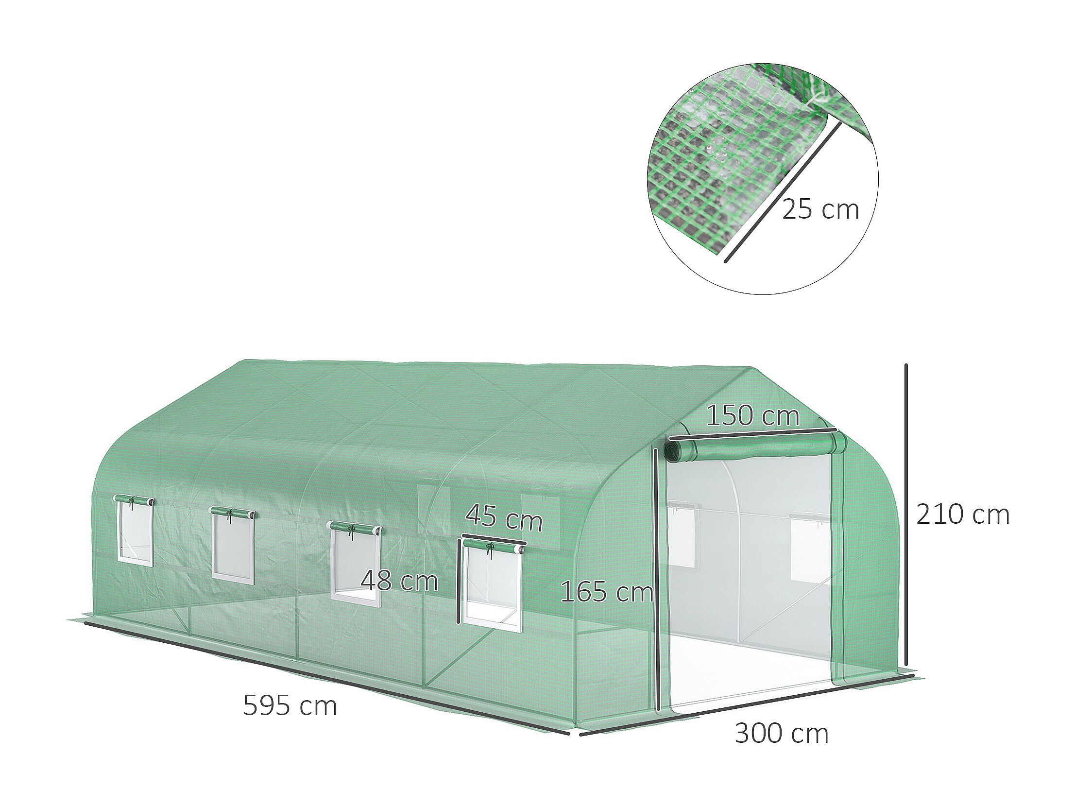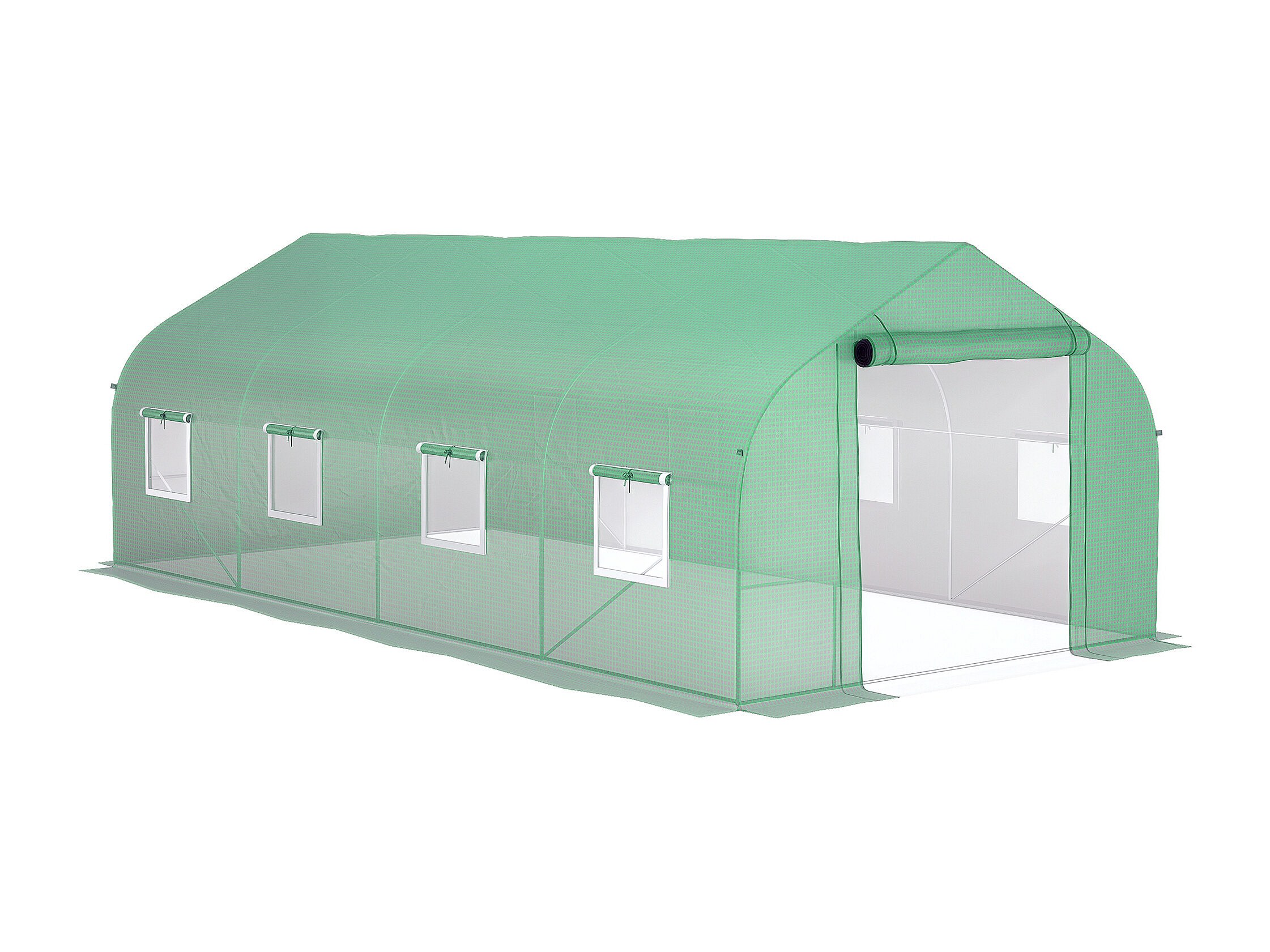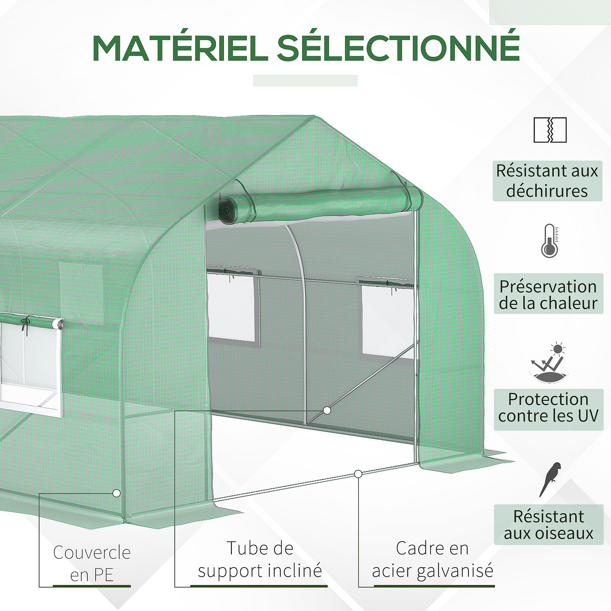 Serre tunnel grande taille 17,85 m² châssis tubulaire acier galvanisé renforcé 2,4 cm 8 fenêtres 1 porte vert