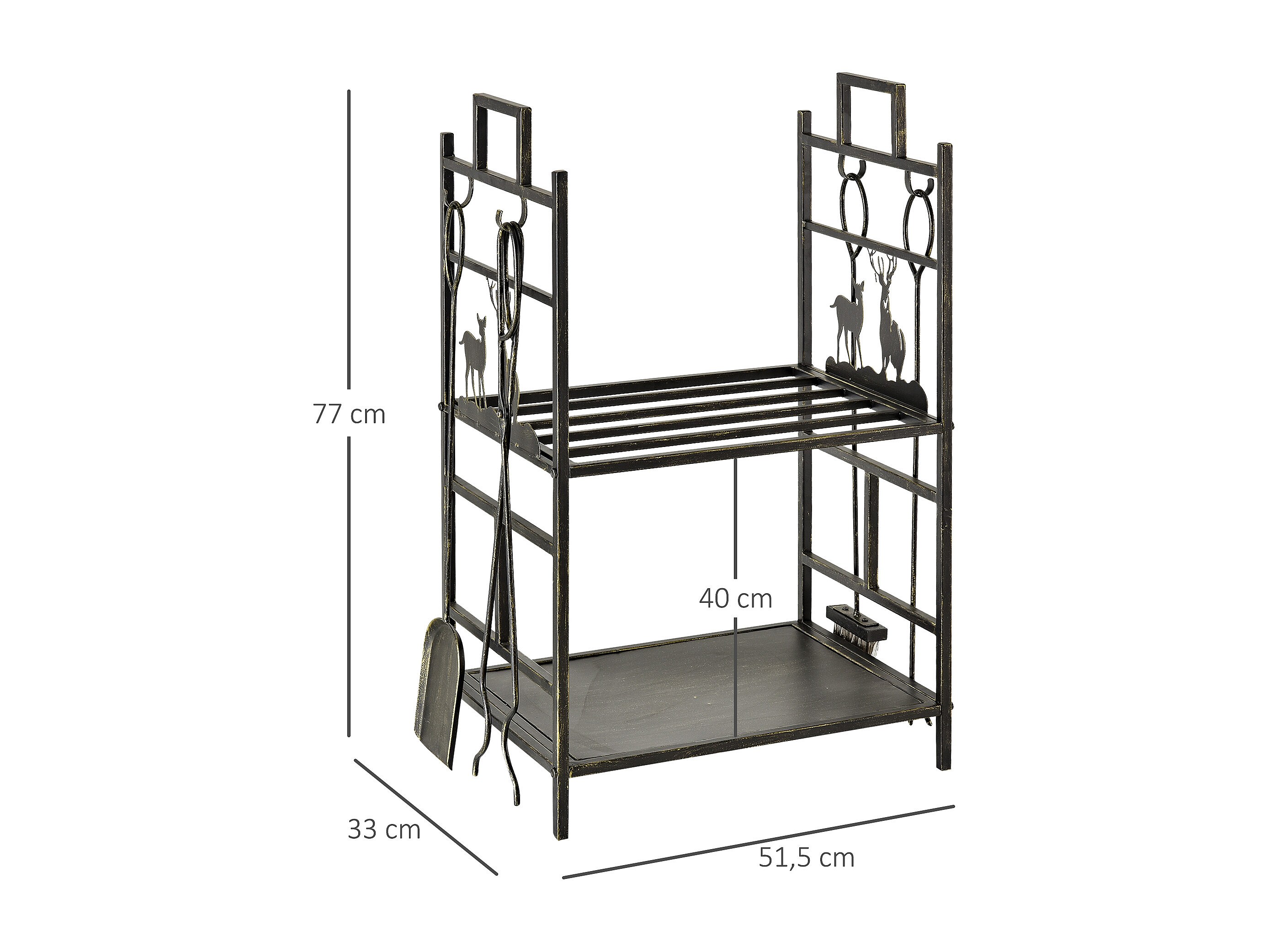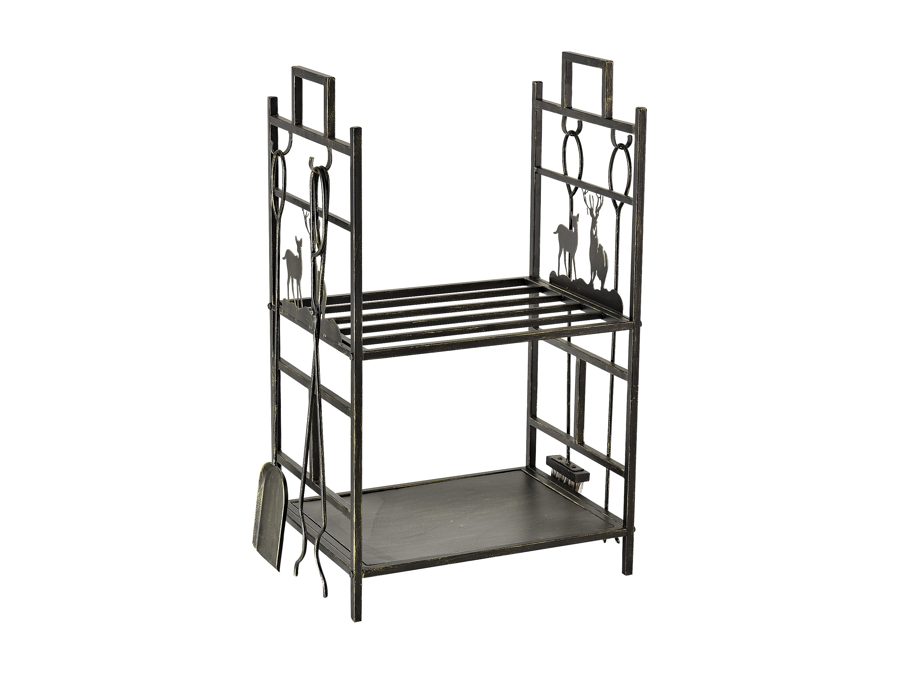 Serviteur de cheminée cerf - porte bûches - range bûches multi accessoires 2 étagères 51L x 33l x 77H cm métal noir or vieilli
