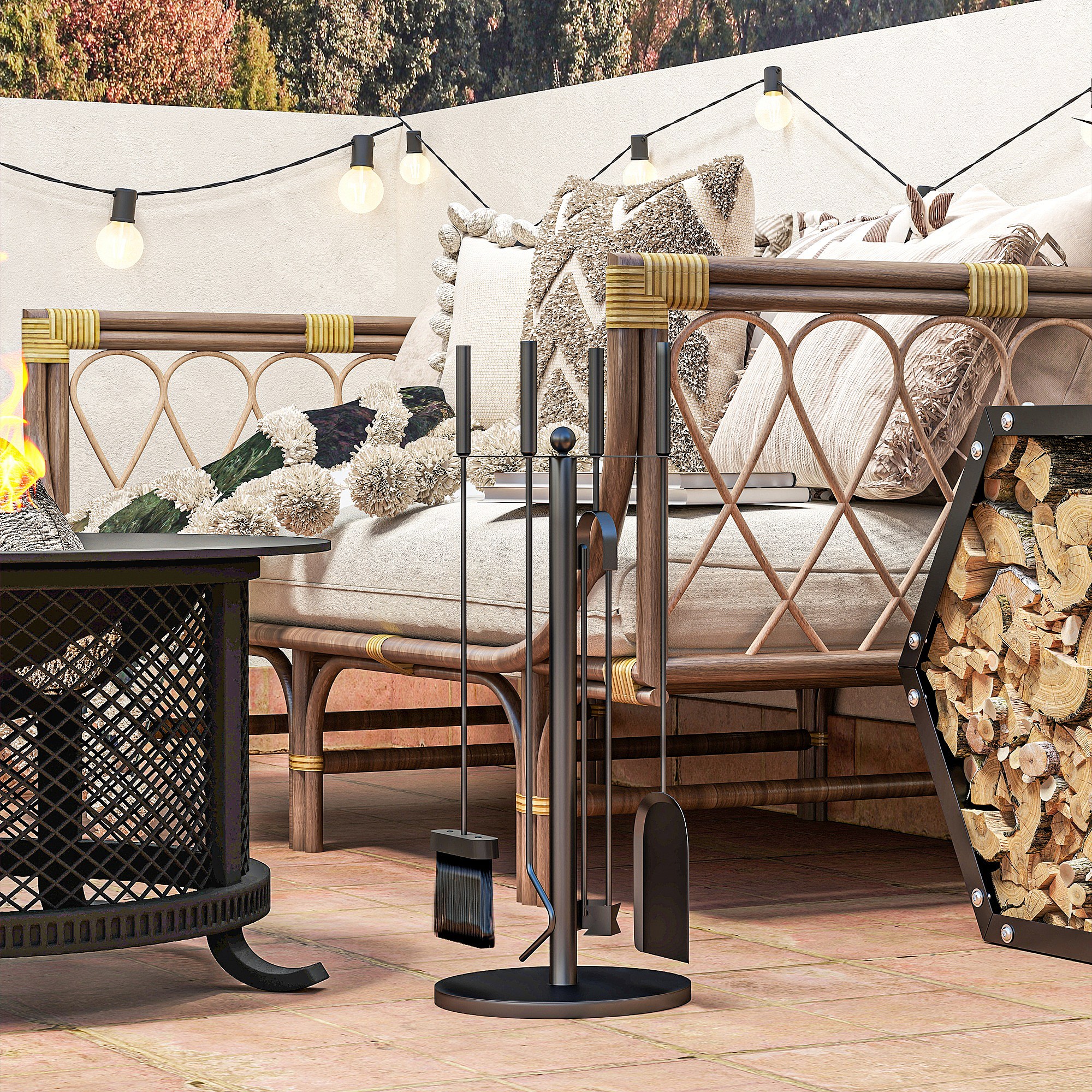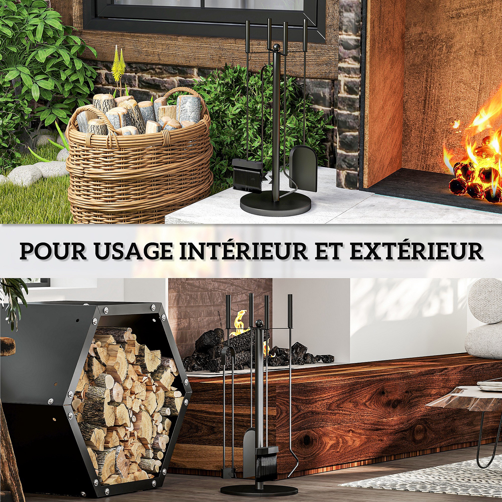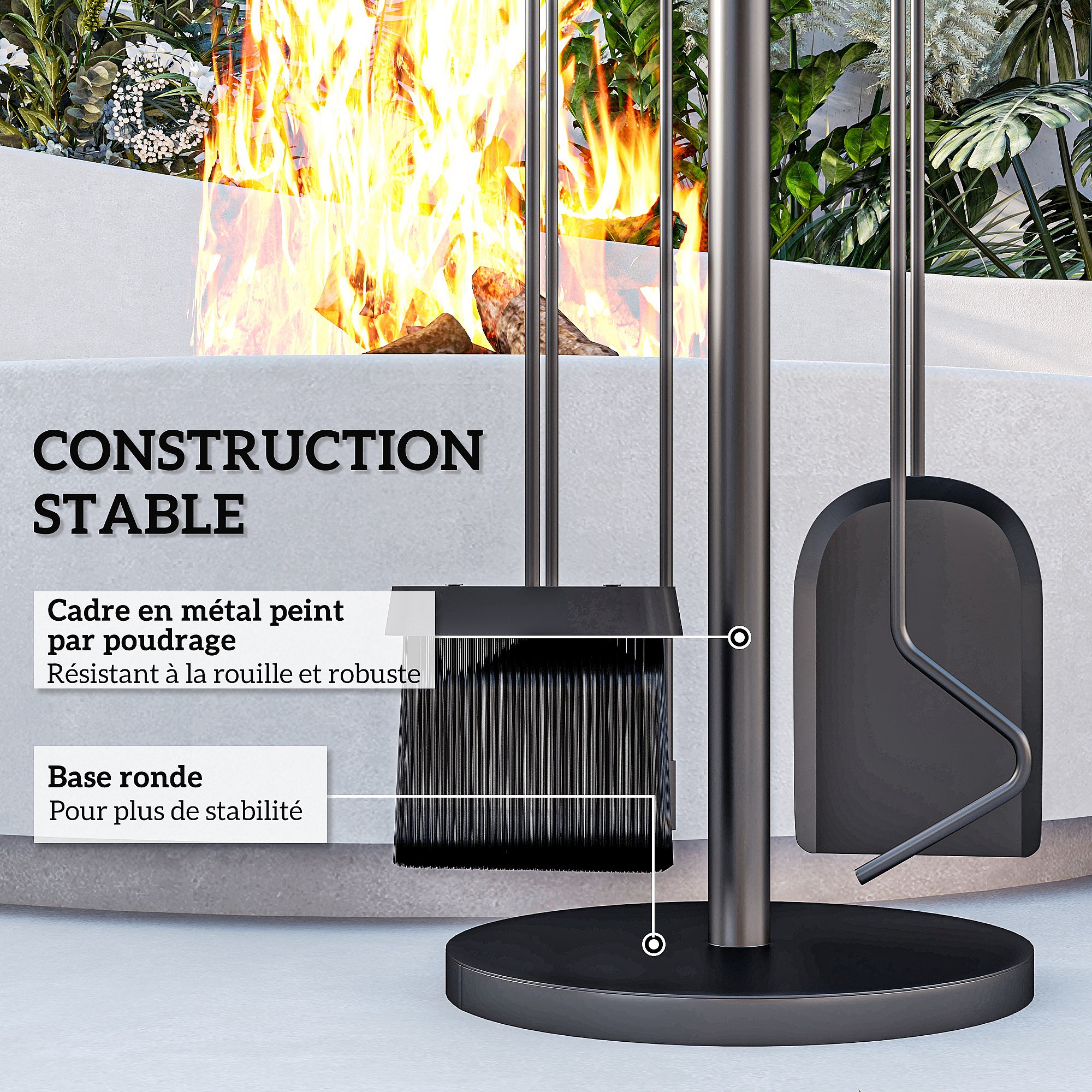 Serviteur de cheminée moderne 5 pièces - balai, pelle, pince, tisonnier, support - métal noir