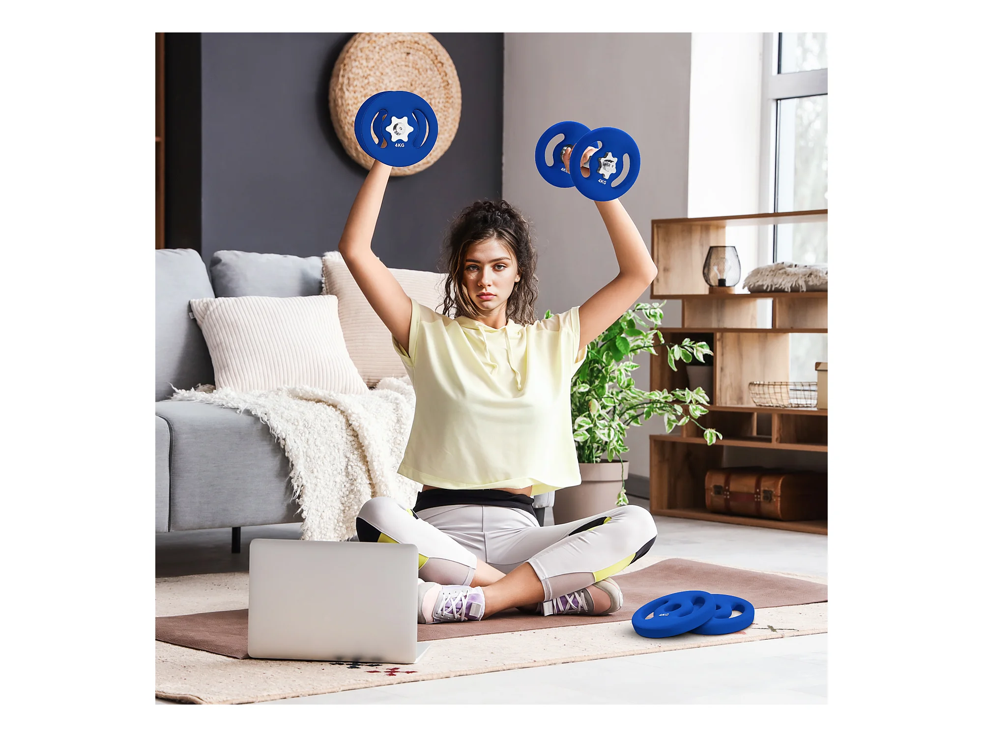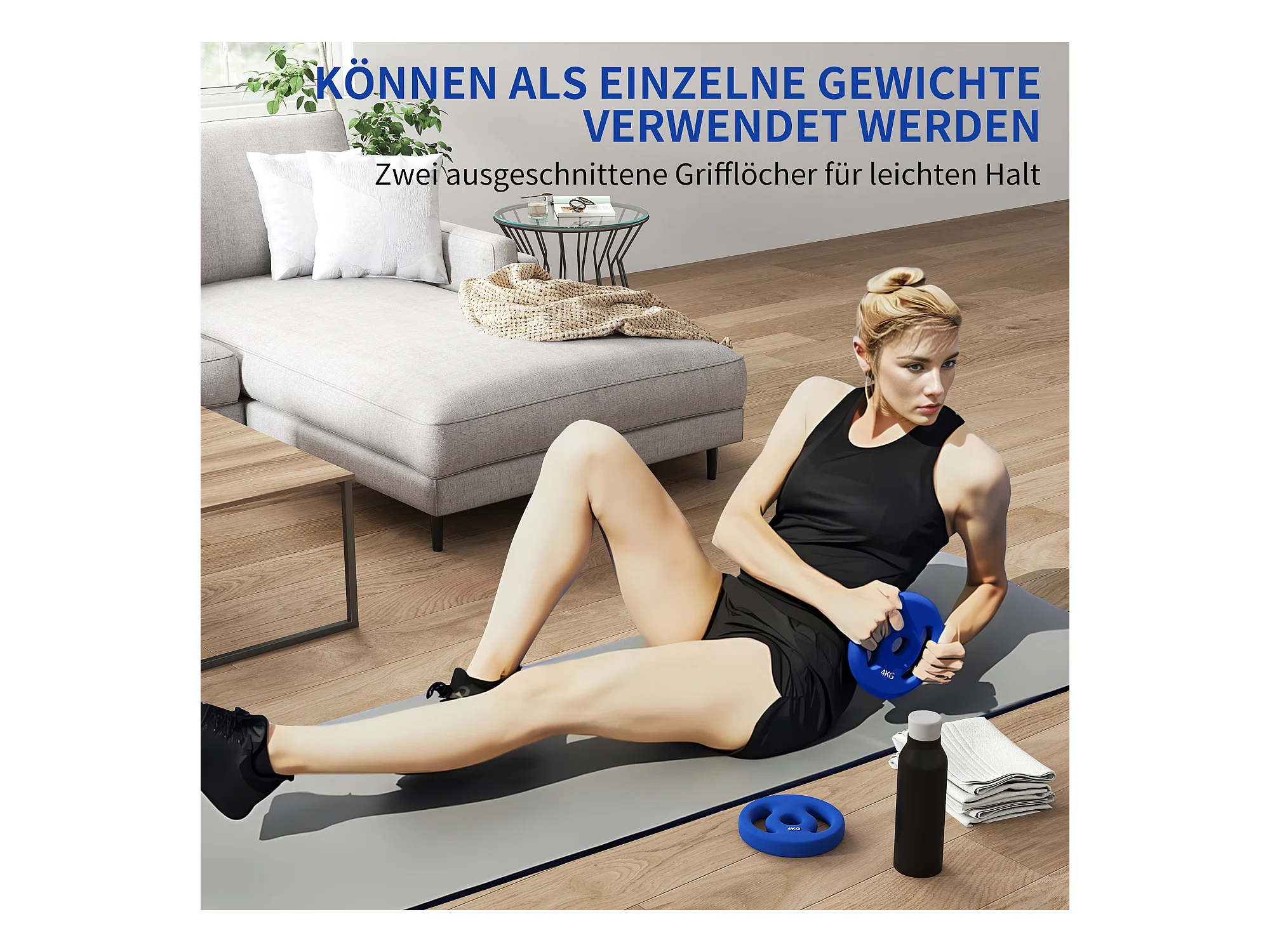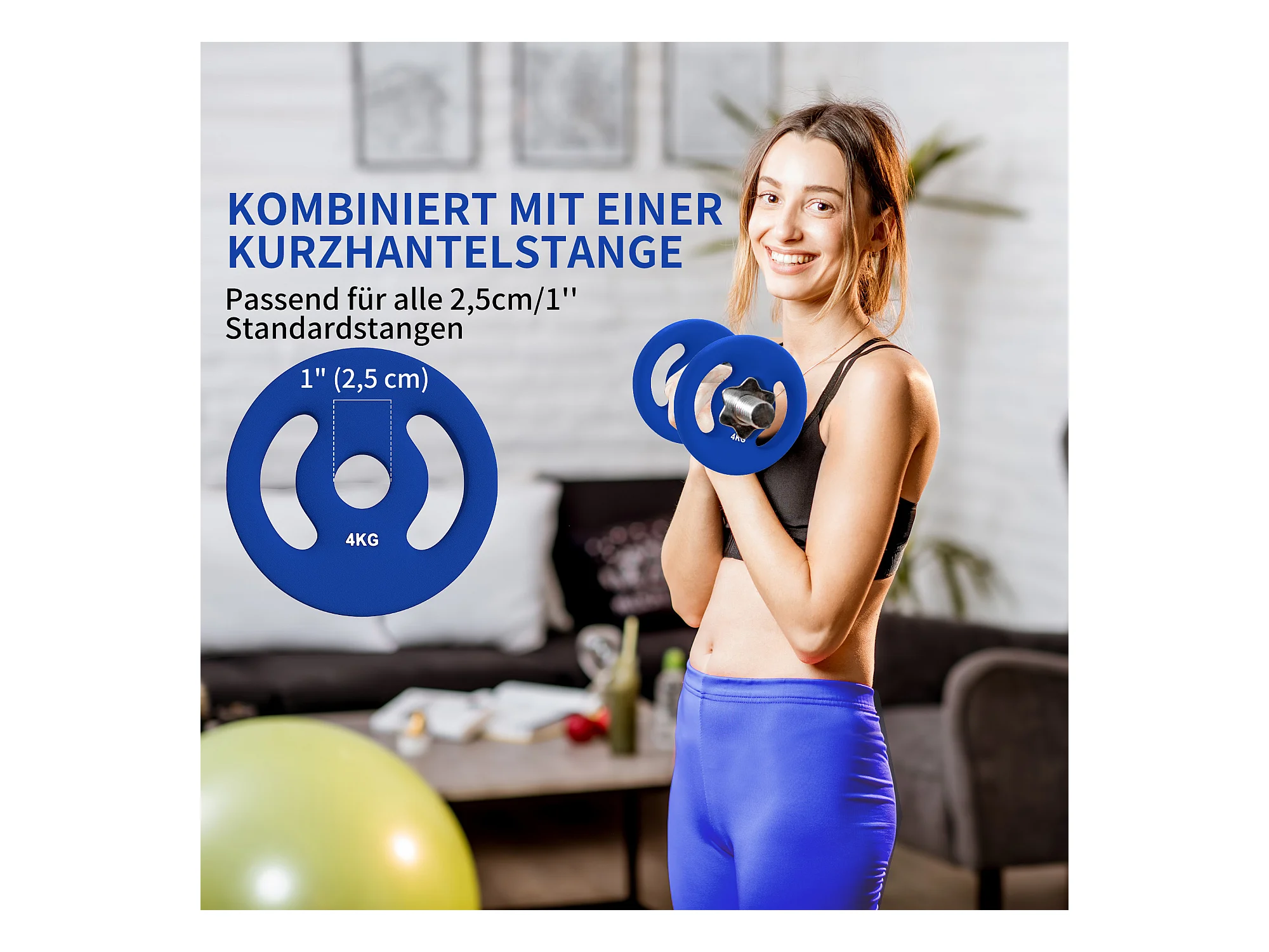 Set de 2 Hantelscheiben, 2 x 4 kg, pour barres de 2.5 cm, plastique, bleu (18x18x3 cm)