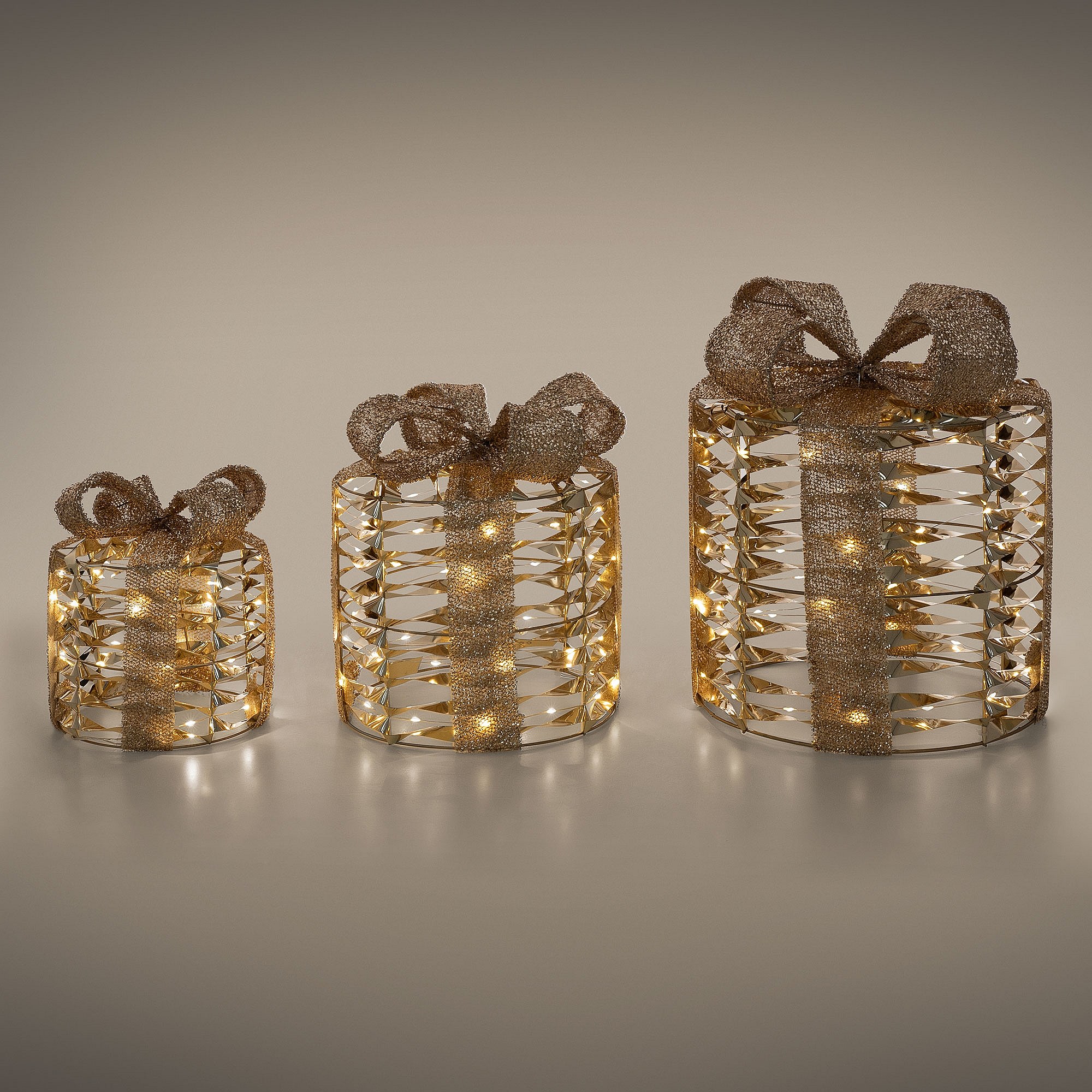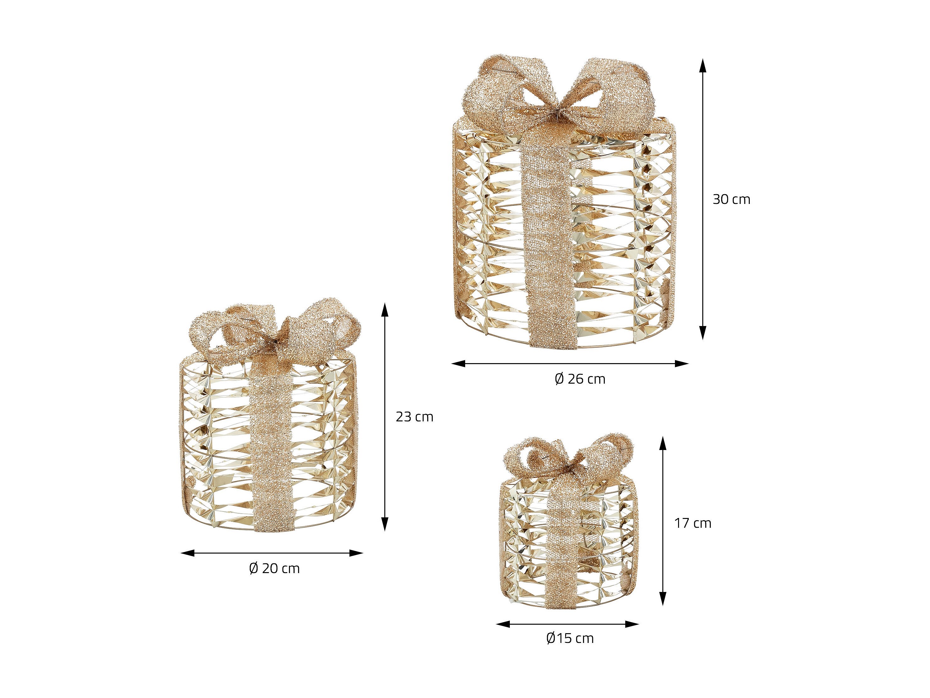 Set de 3 boîtes cadeaux de noël à led dorées 135 led blanc chaud structure en fil métallique décoration saison fonctionne sur piles minuterie inclus