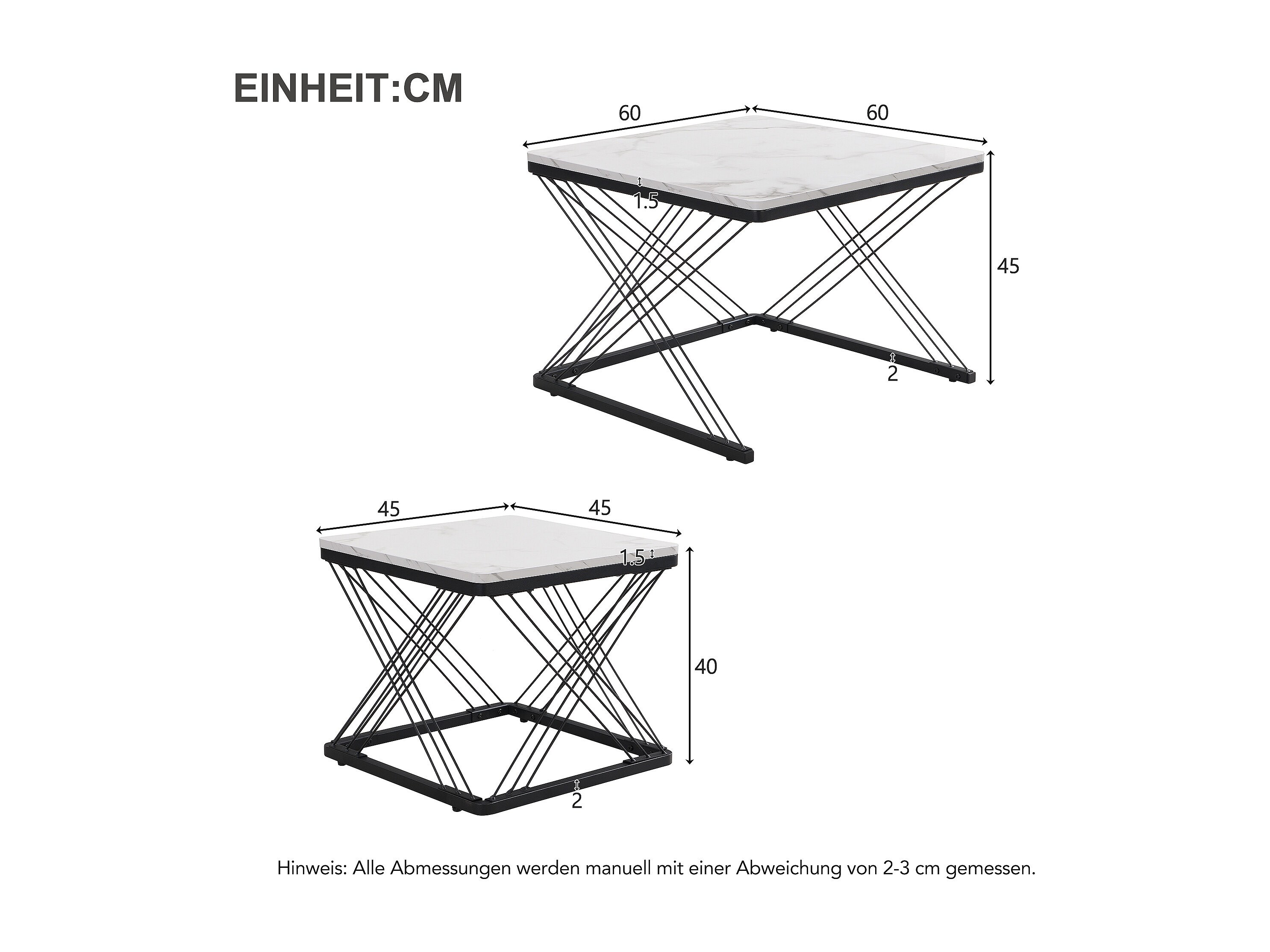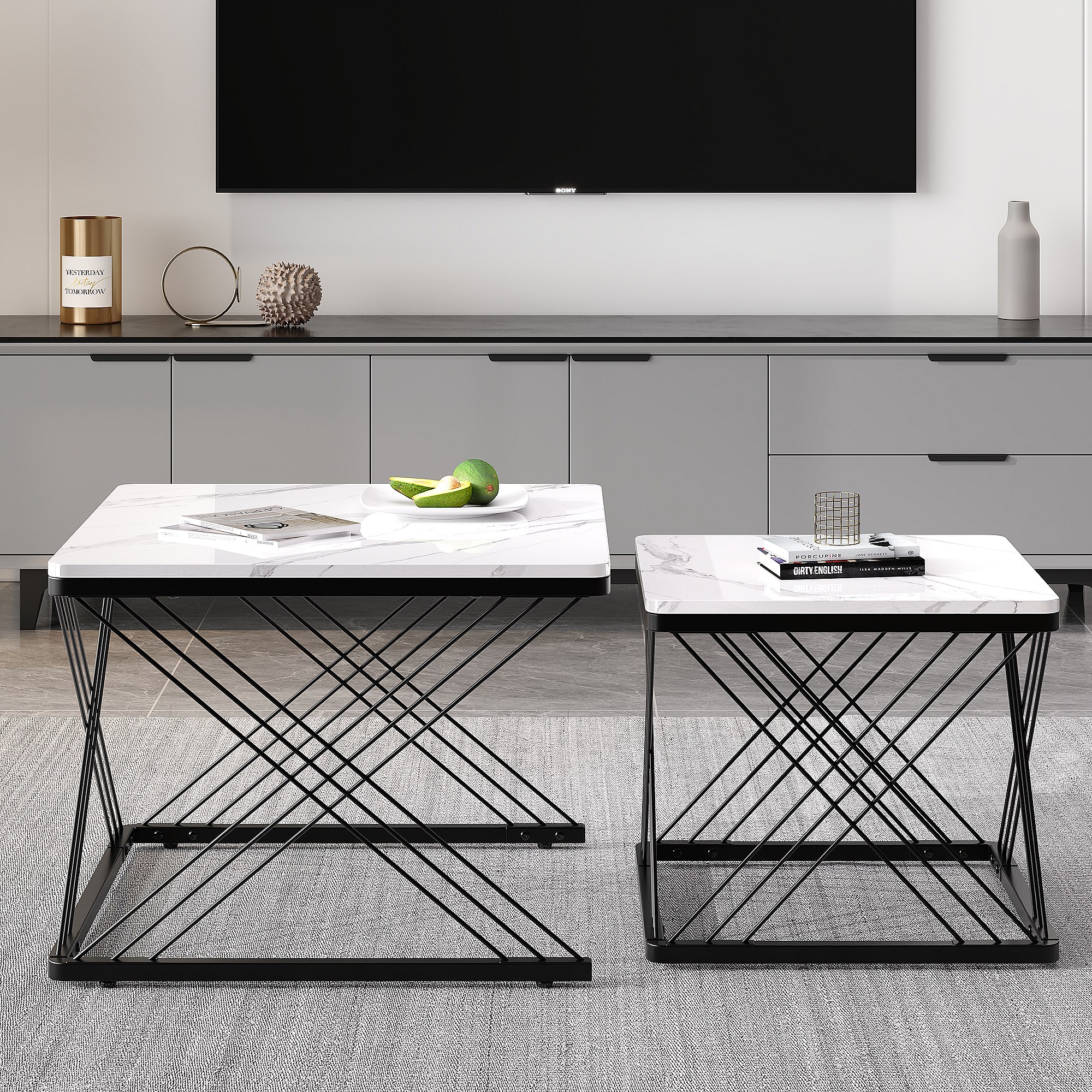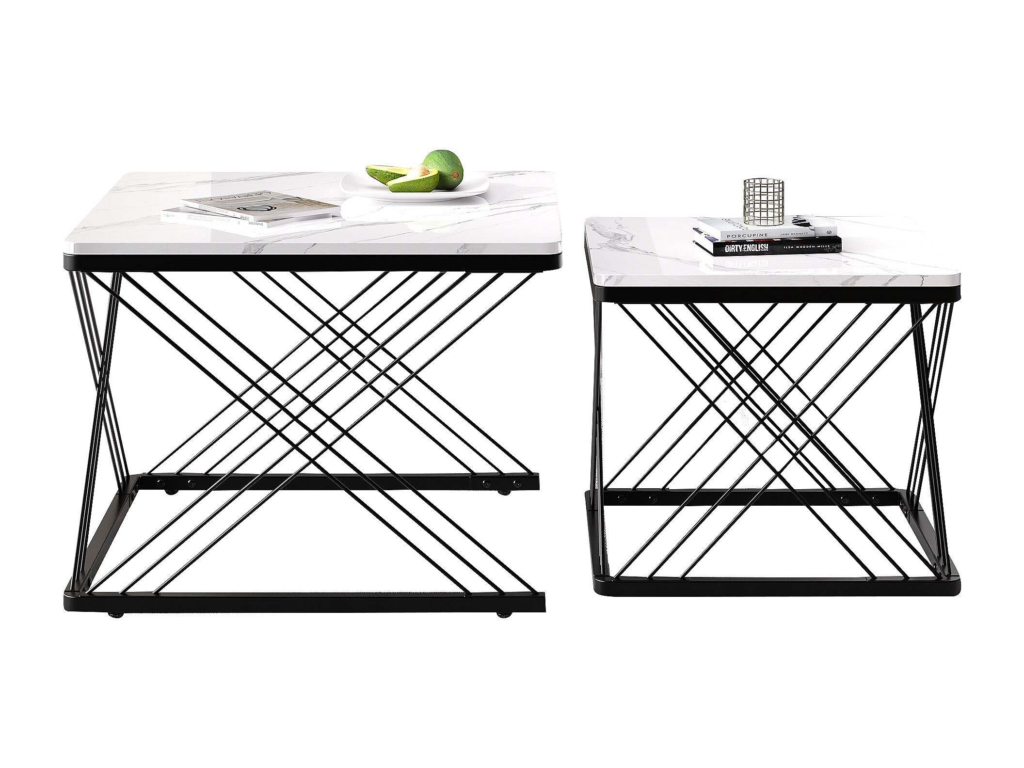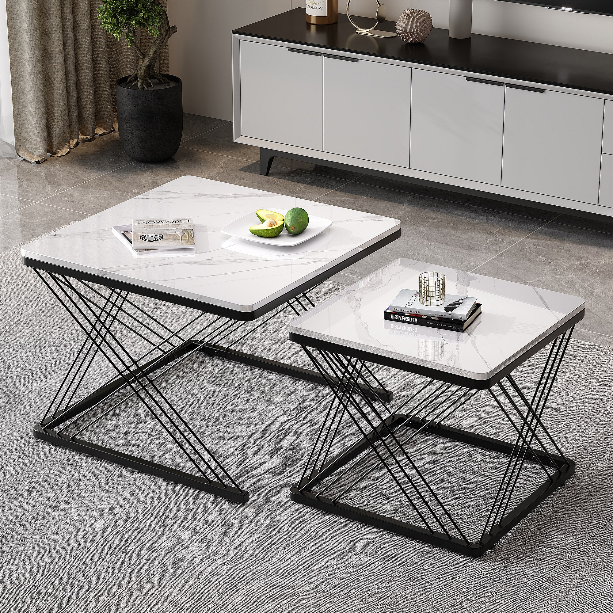 Set de tables basses 2 pièces, design élégant, finition effet marbre brillant, pieds réglables, capacité de charge jusqu'à 30 kg