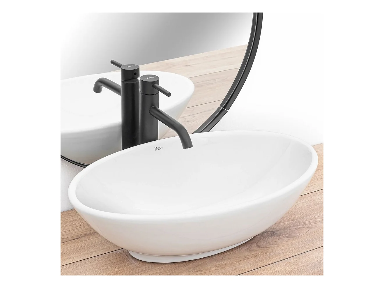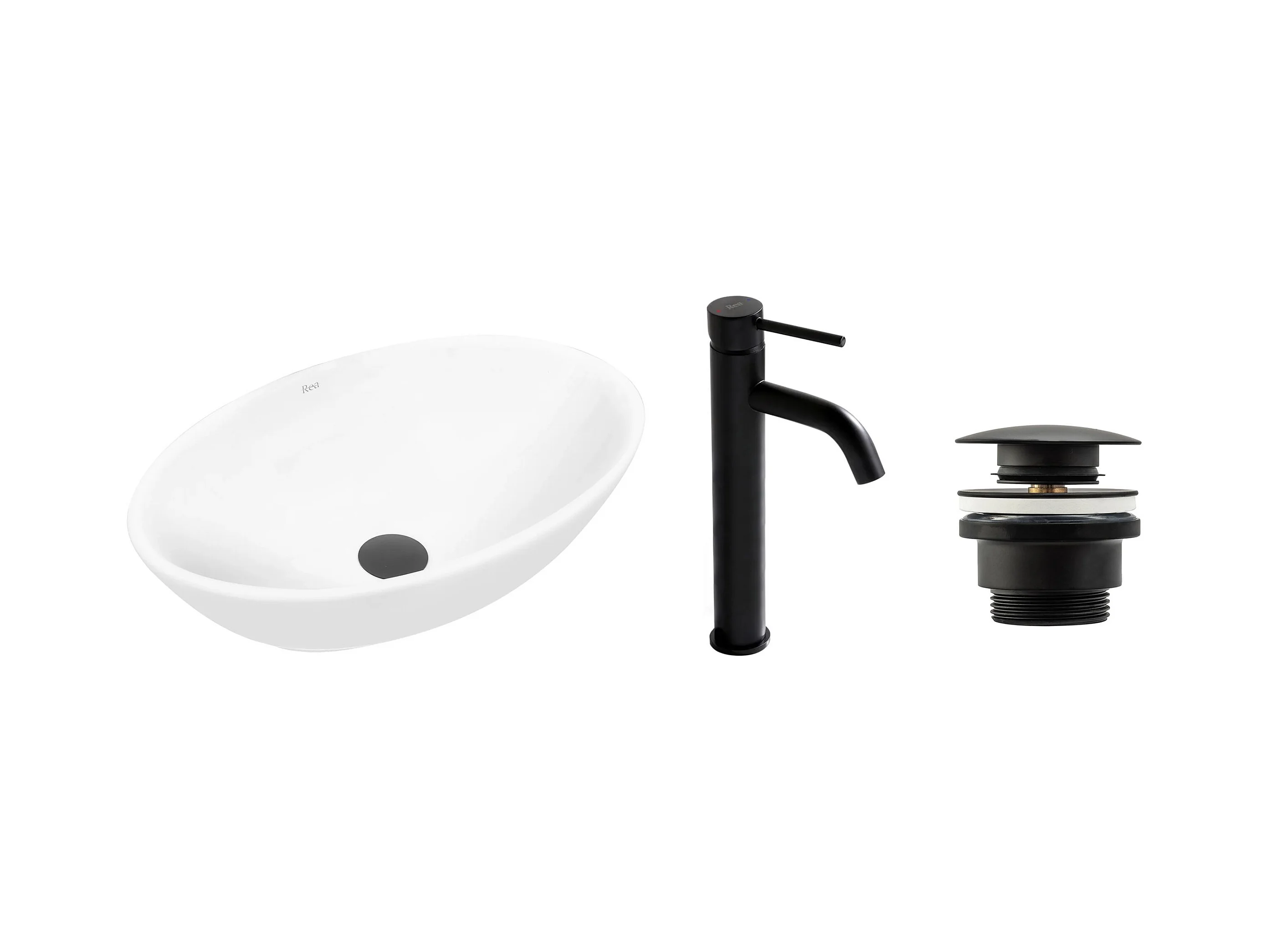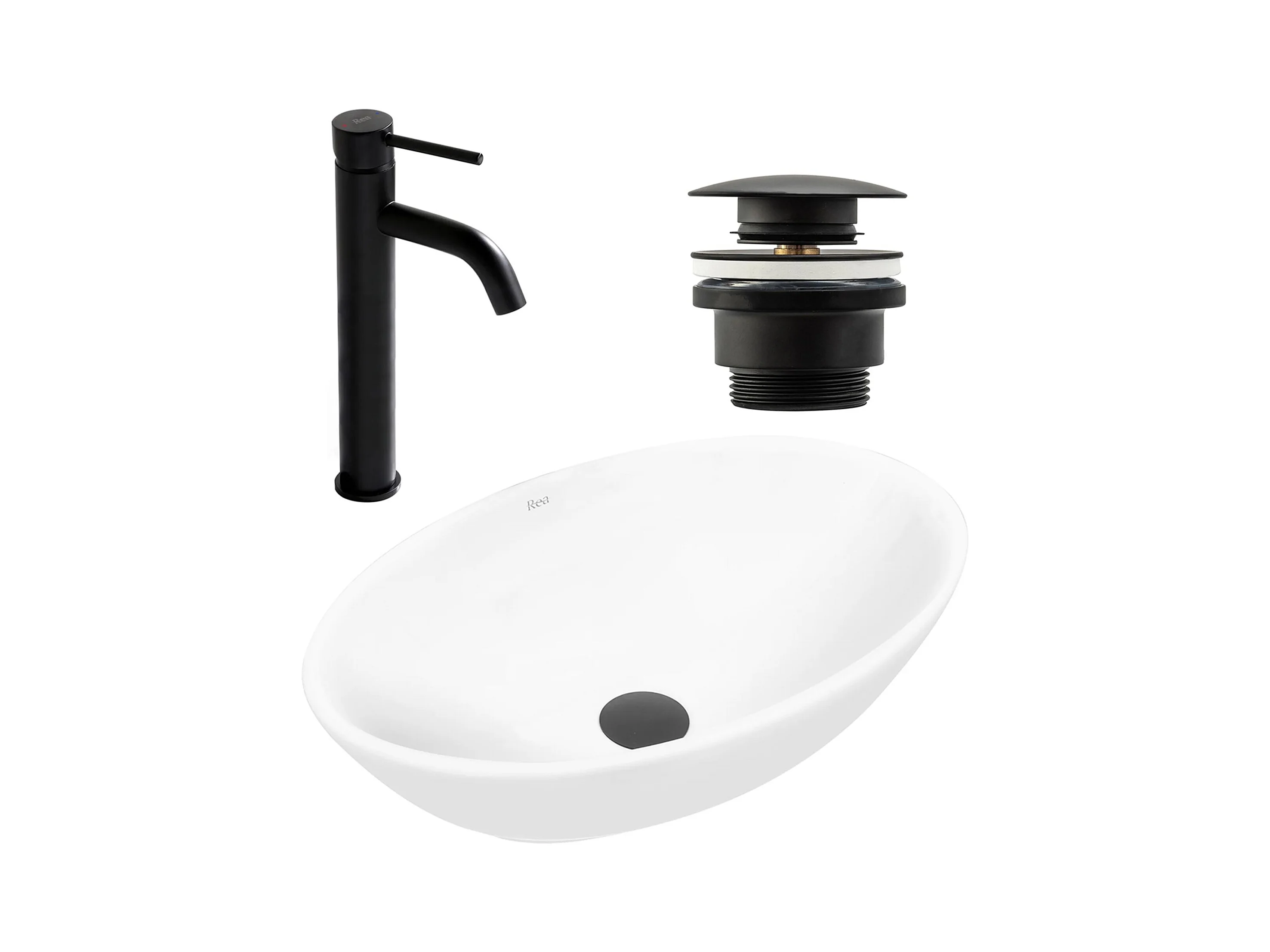 Set De Vasque À Poser Rea Pamela White + Robinet De Lavabo Lungo Black High + Bonde Black