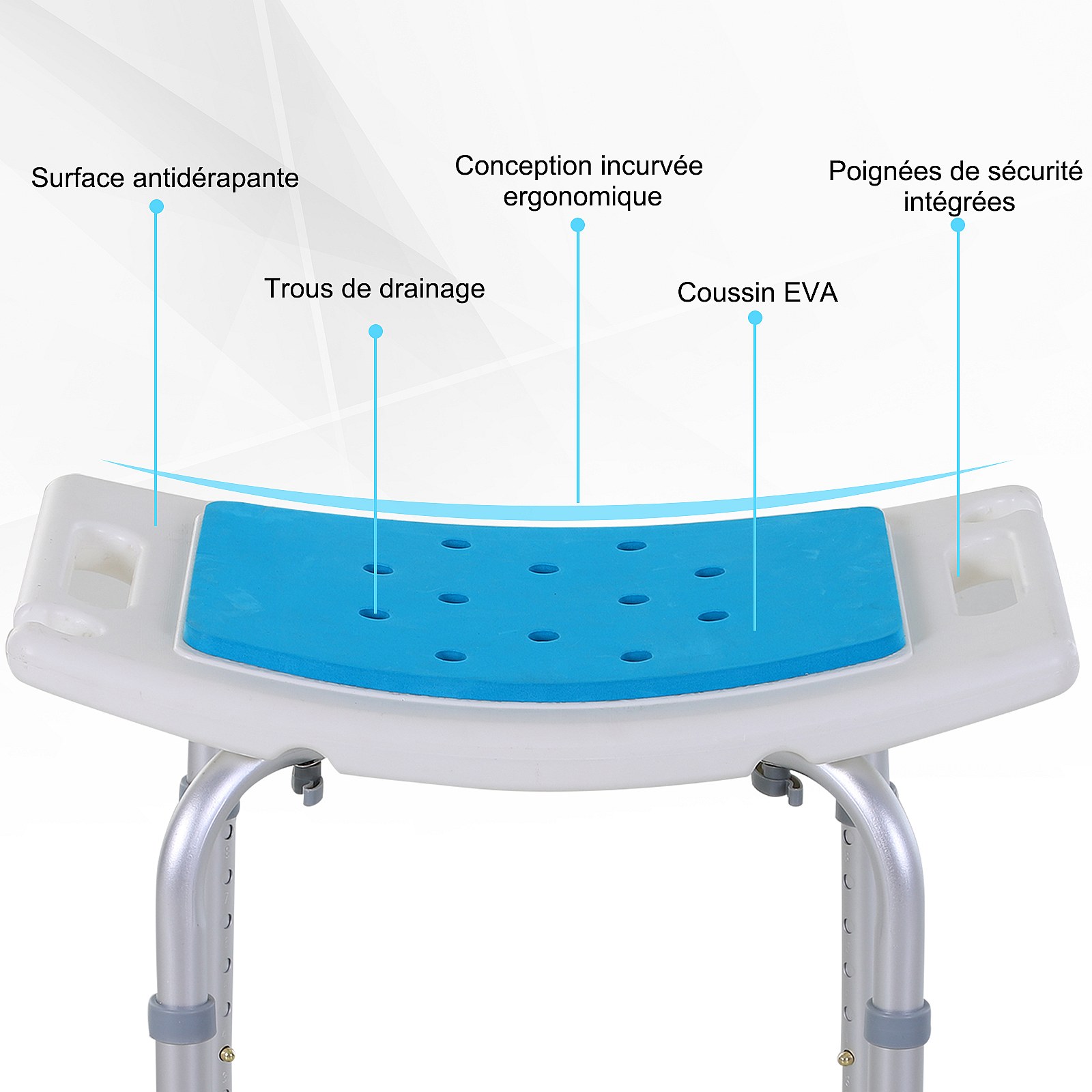 Siège de douche réglable en hauteur tabouret de douche ergonomique pieds antidérapants charge max. 135 Kg alu HDPE blanc bleu