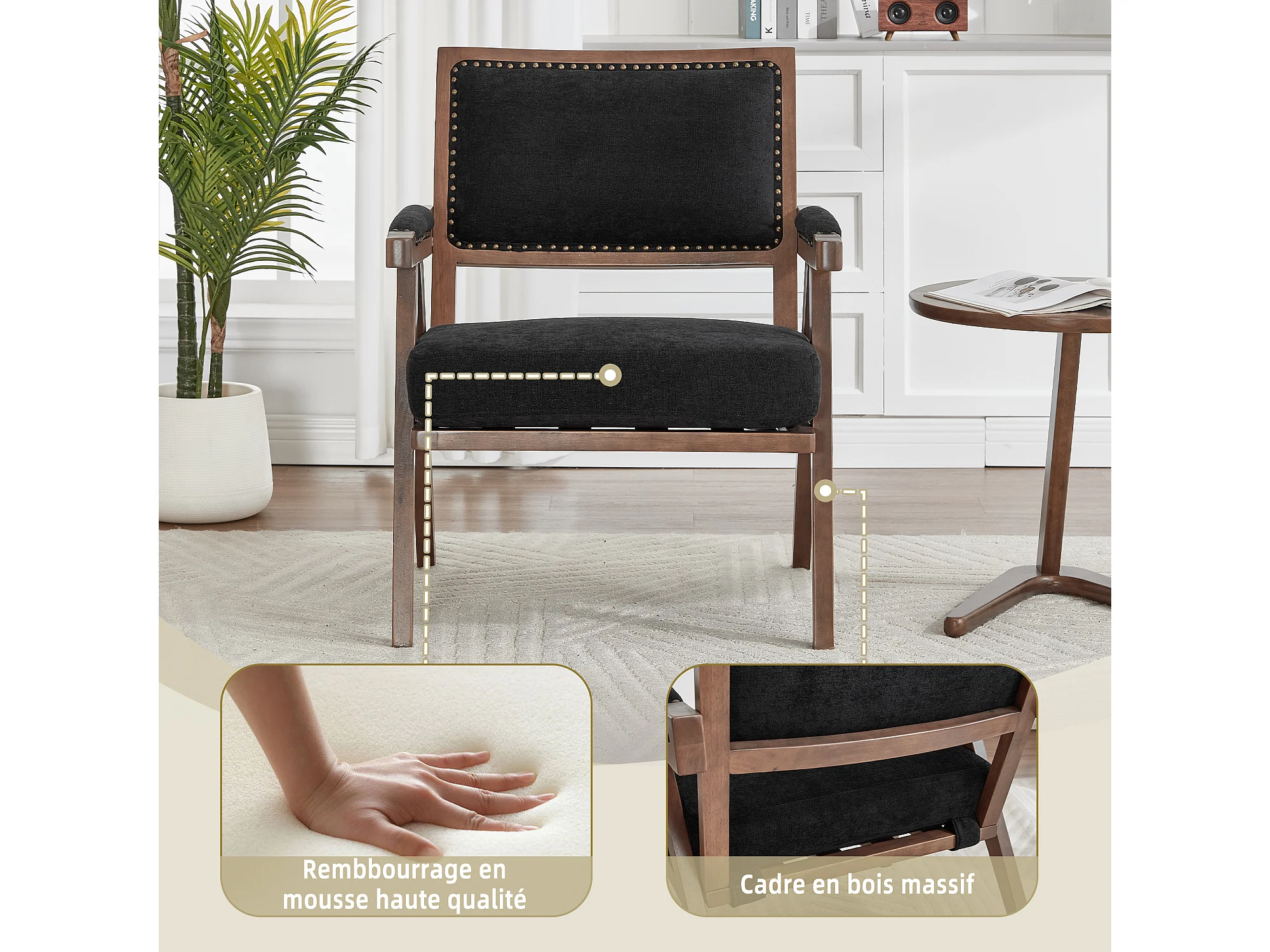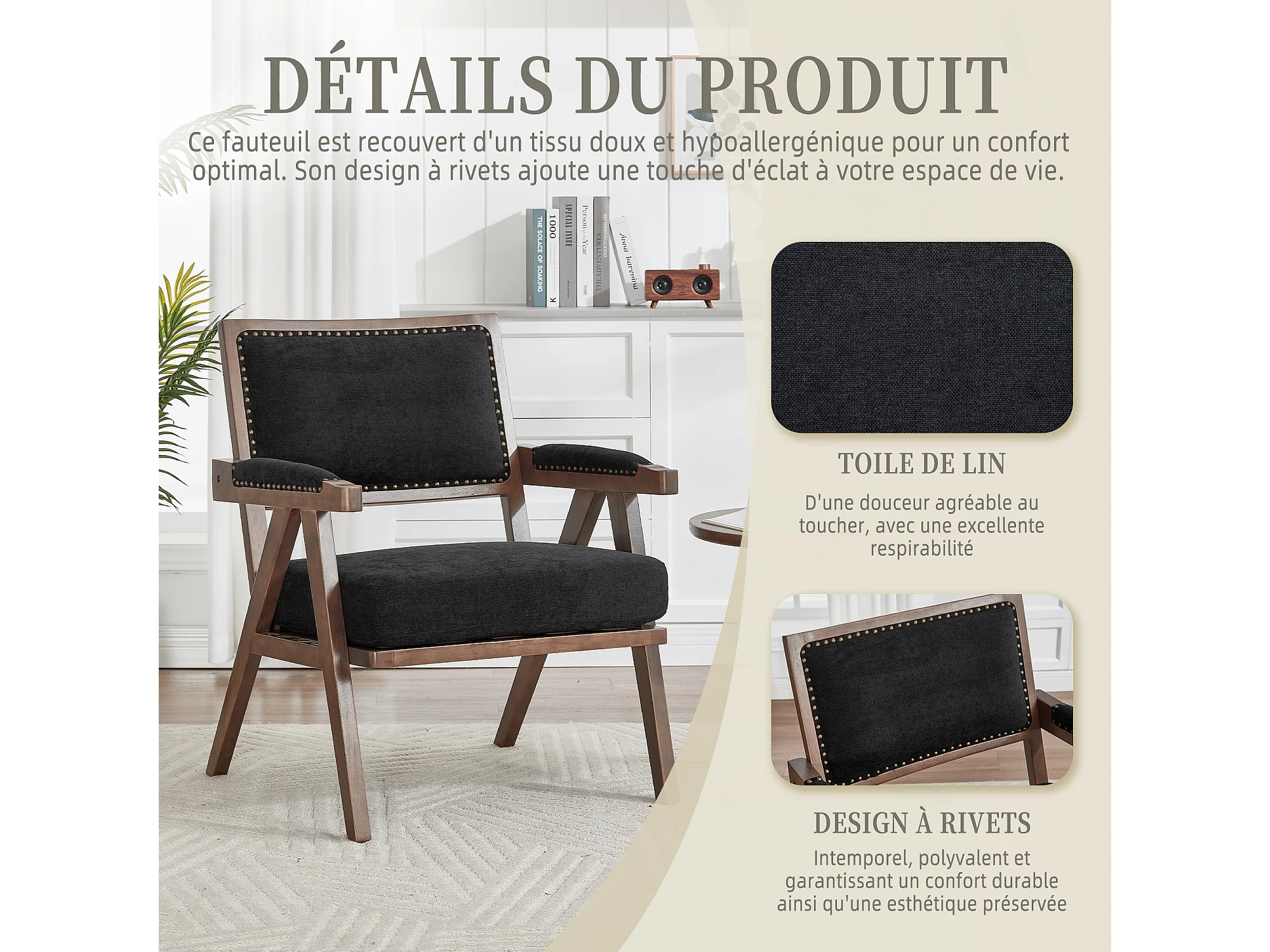 Sienna - Fauteuil Droit en Coton-Lin et Bois Massif - Fauteuil Vintage avec Dossier Ergonomique - Noir - Confortable pour Salon/Chambre/Bureau