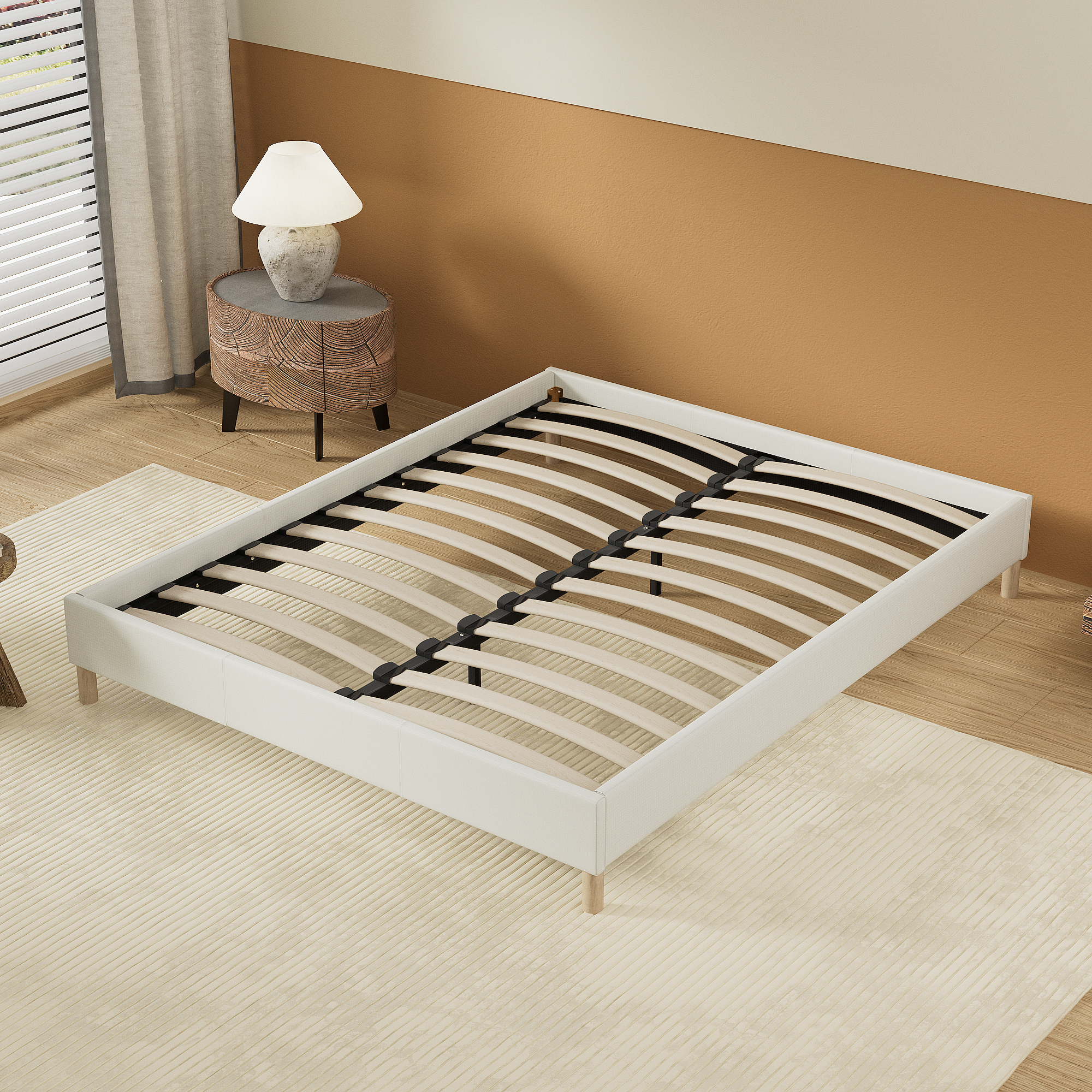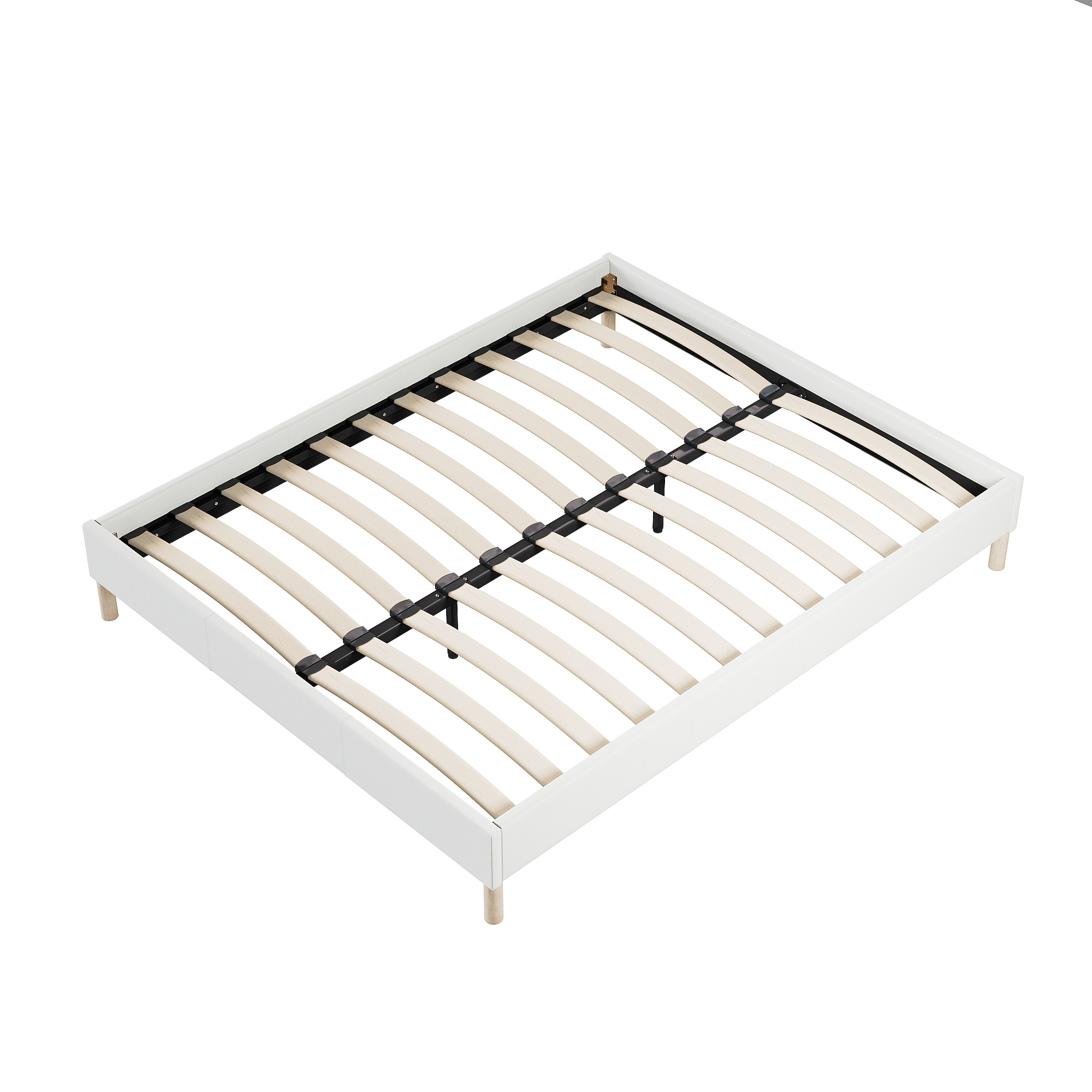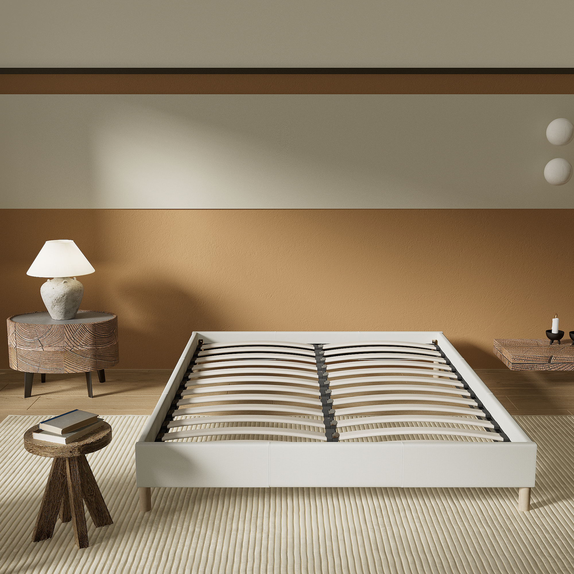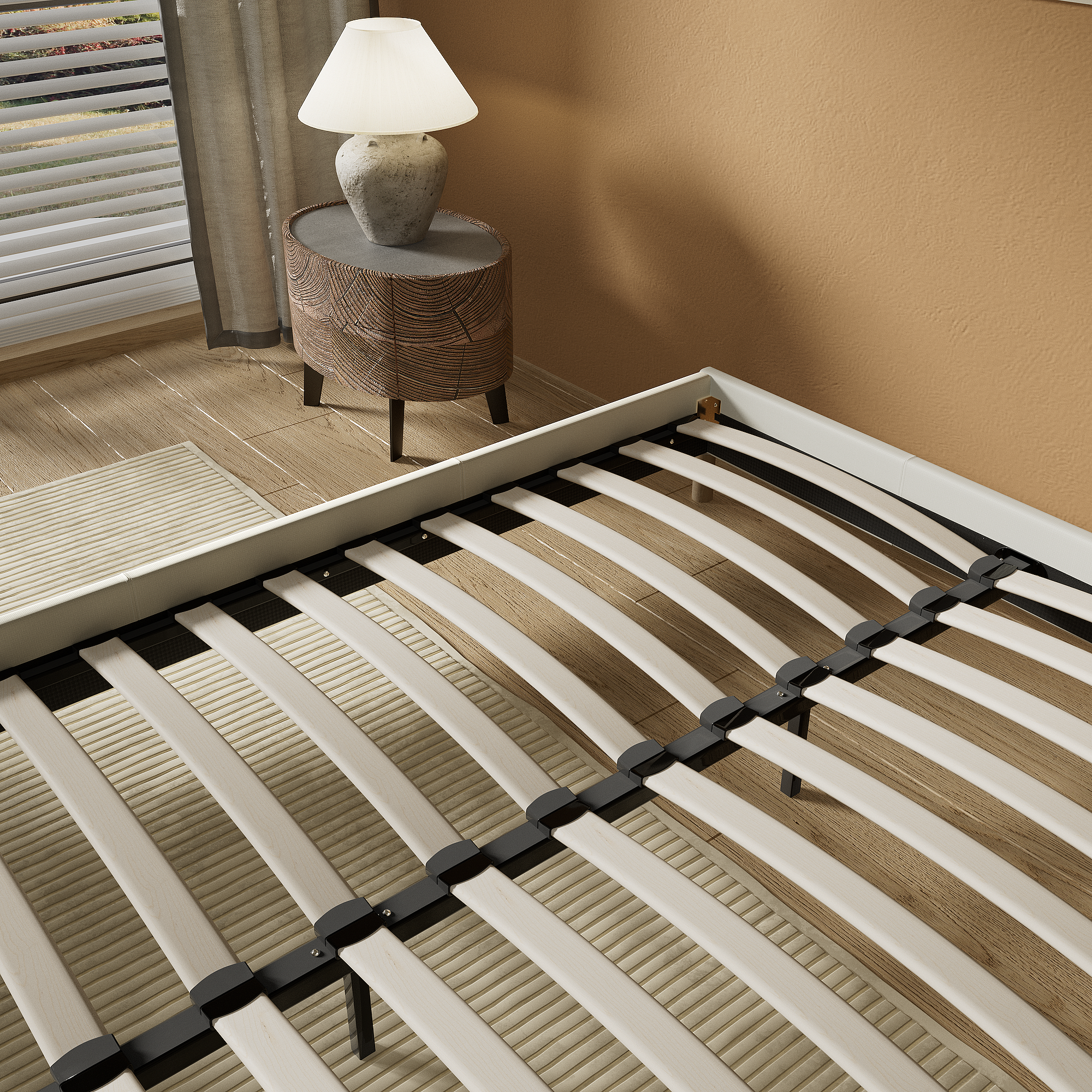 Sommier 140x200 cm, Revêtement en tissu Blanc Crème, Pieds en bois