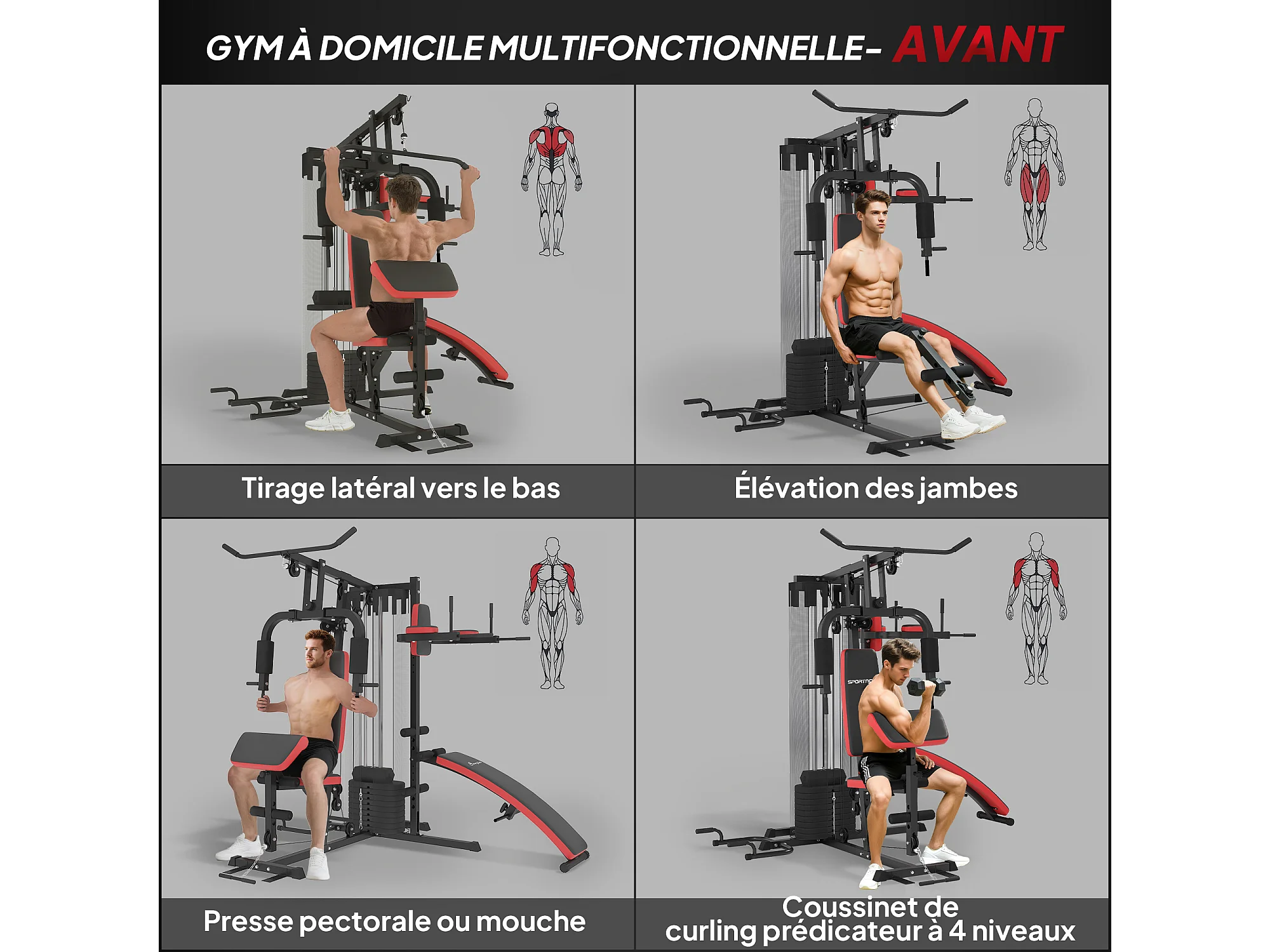 Station de musculation - banc, développé couché, butterfly, barre latissimus et traction, curler, bande résistance, 10 contrepoids - acier noir rouge