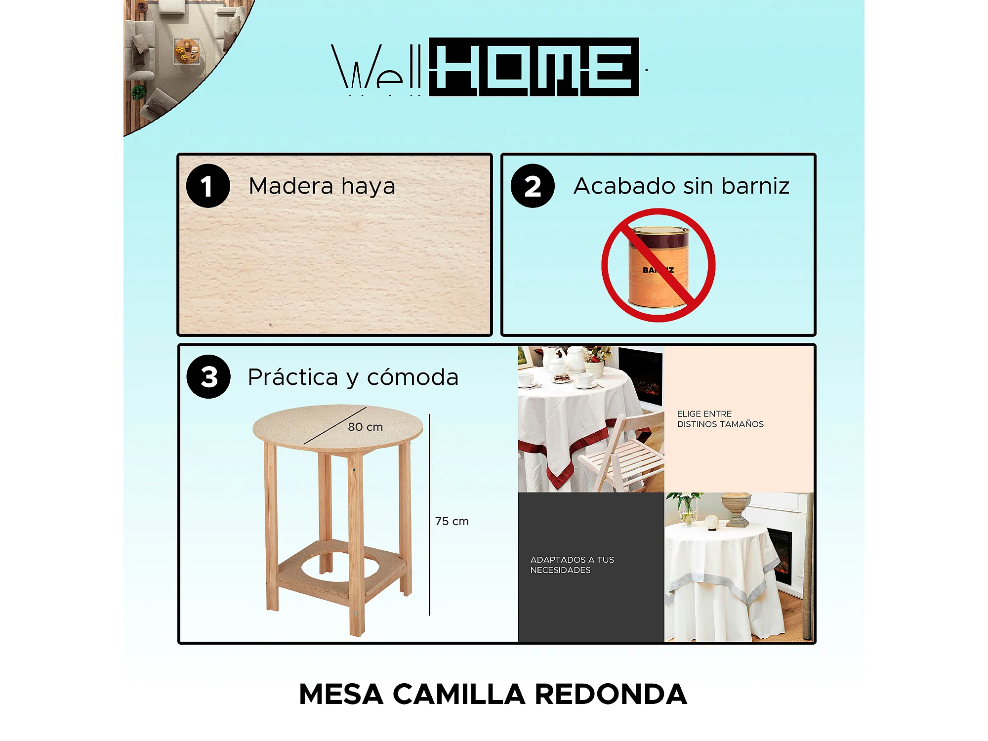 Structure de Haya de table Camilla ronde, finie sans varniz, 80x80x75 cm