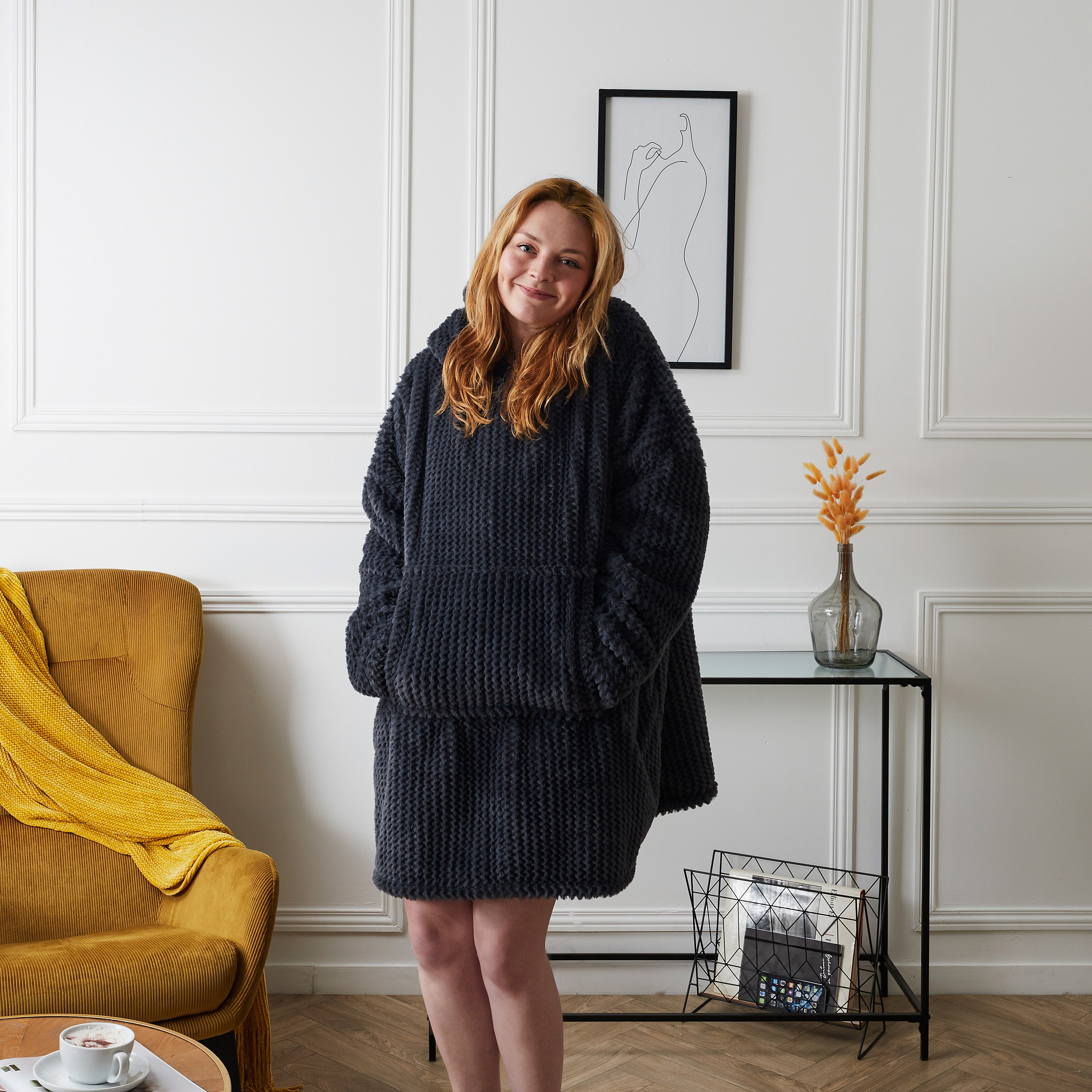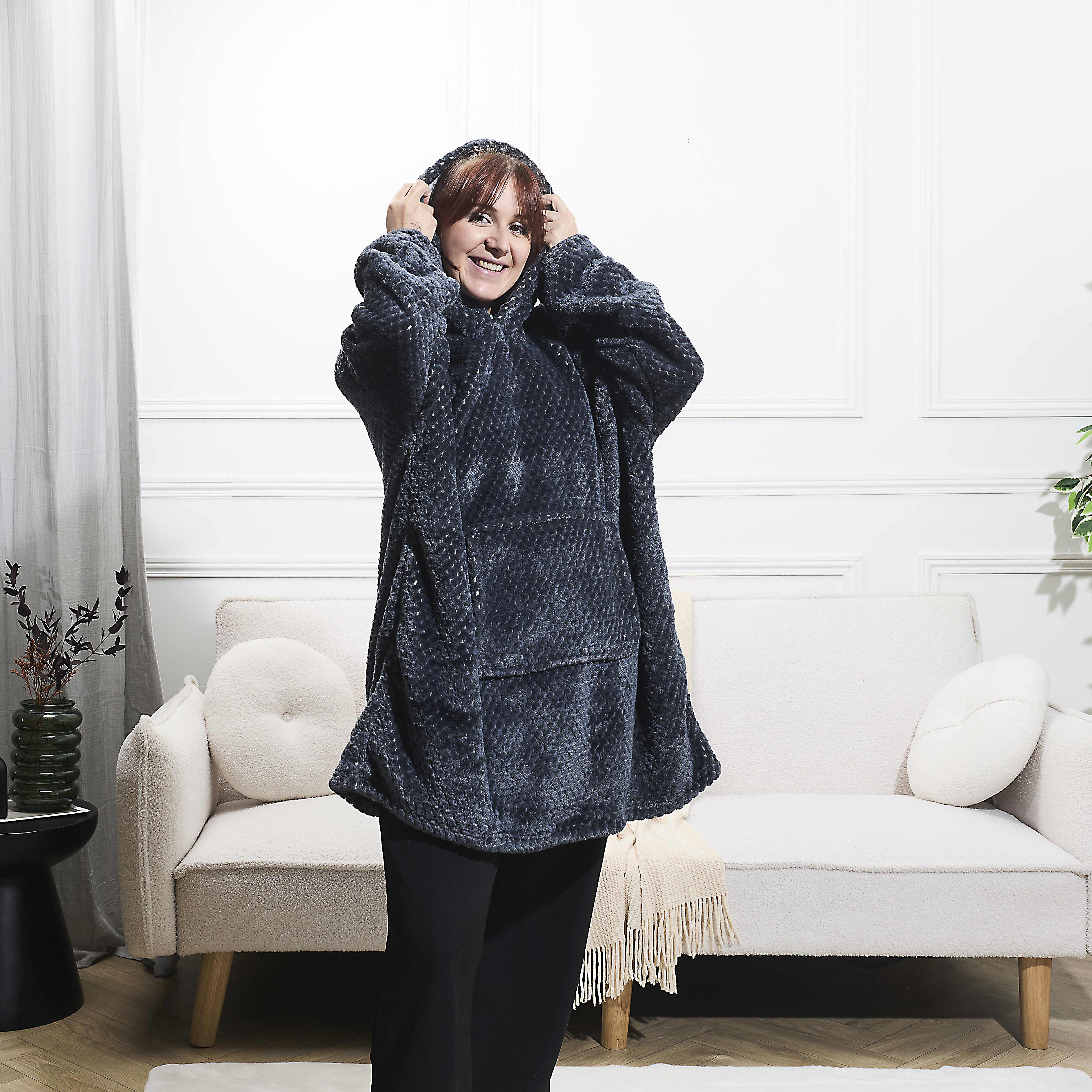 Plaid Poncho Gris Fonce Manches Int Sherpa Gris