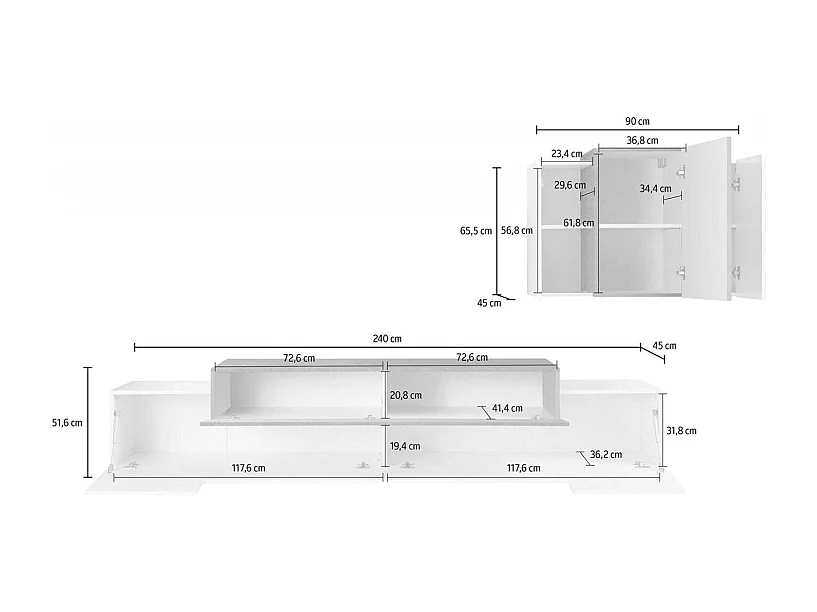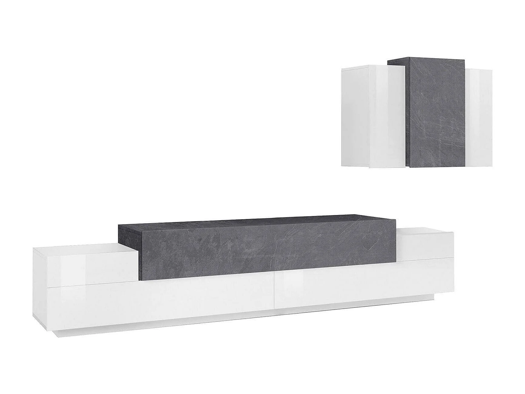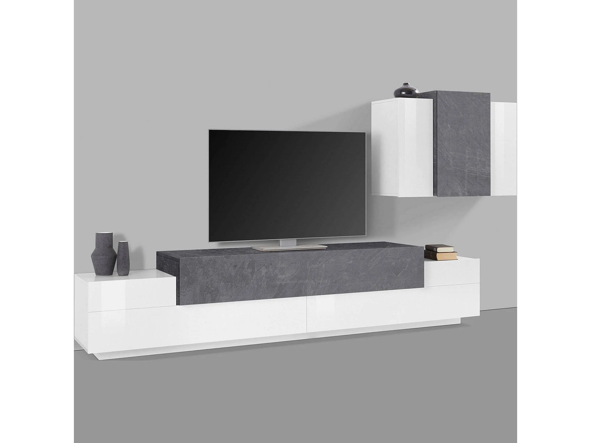 Unité murale Ruben, ensemble de salon meuble TV, meuble de salon polyvalent, 100% Made in Italy, 240x45h180 cm, blanc brillant et ardoise